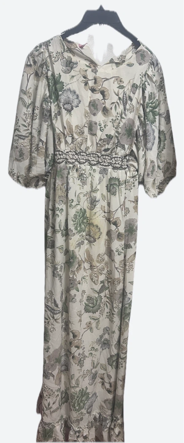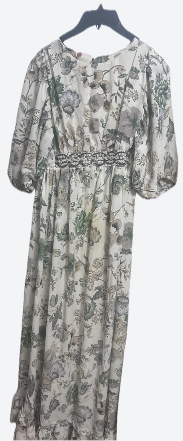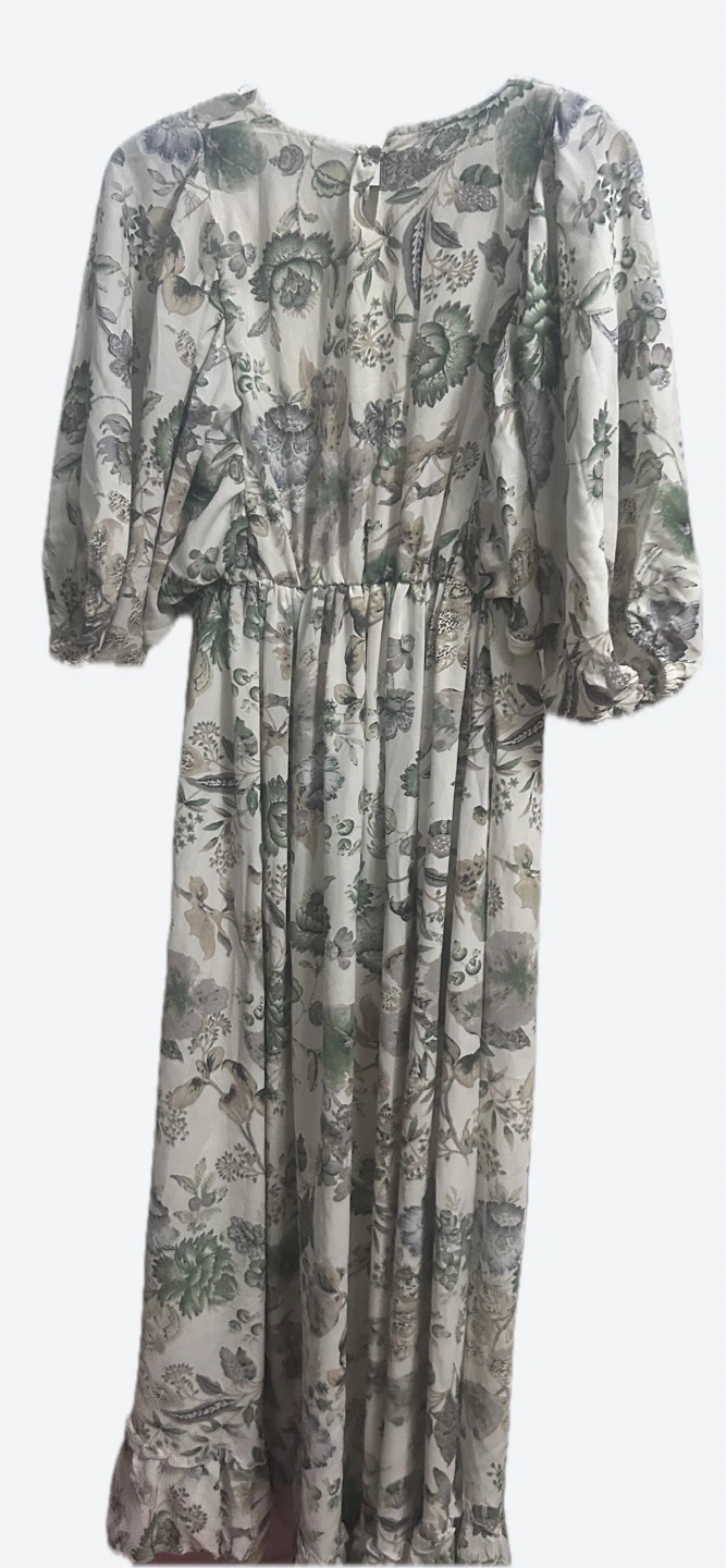 Selling a lovely floral print maxi dress. It features a beautiful floral pattern in shades of green, gray, and beige.