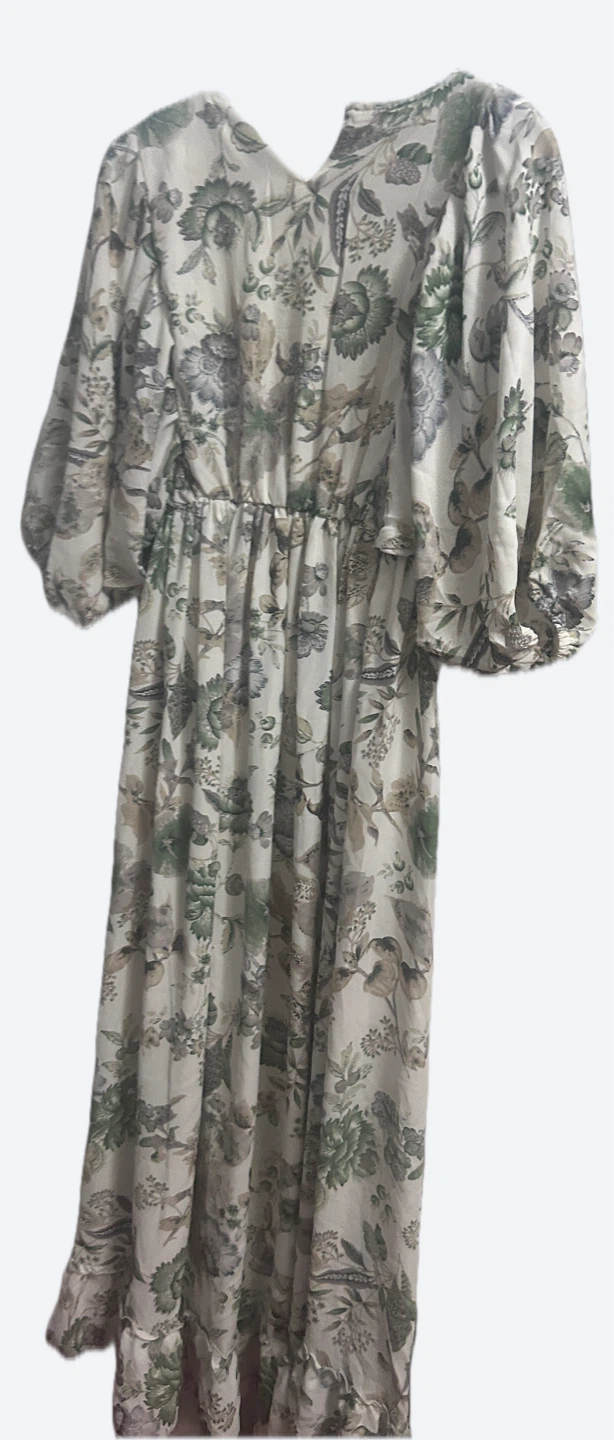 Selling a lovely floral print maxi dress. It features a beautiful floral pattern in shades of green, gray, and beige.