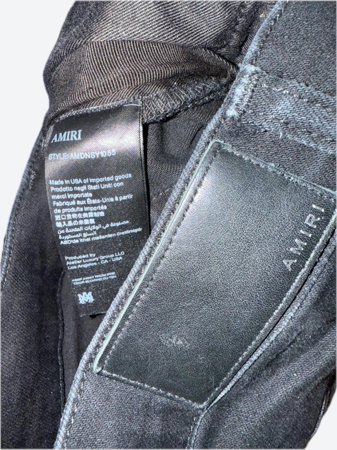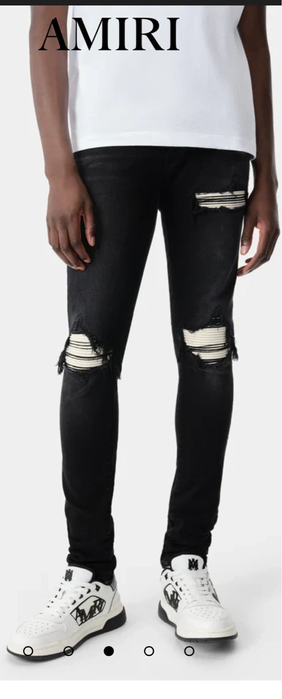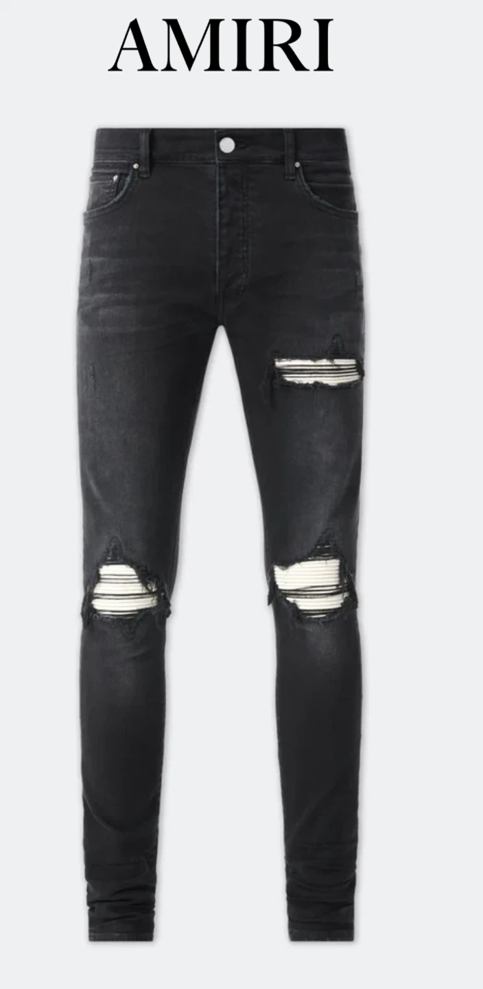 65Selling a pair of AMIRI black distressed MX1 jeans. They feature a stylish ripped design with striped detailing underneath. The style number is AMDNSY1055. Great for adding an edgy look to your wardrobe!
