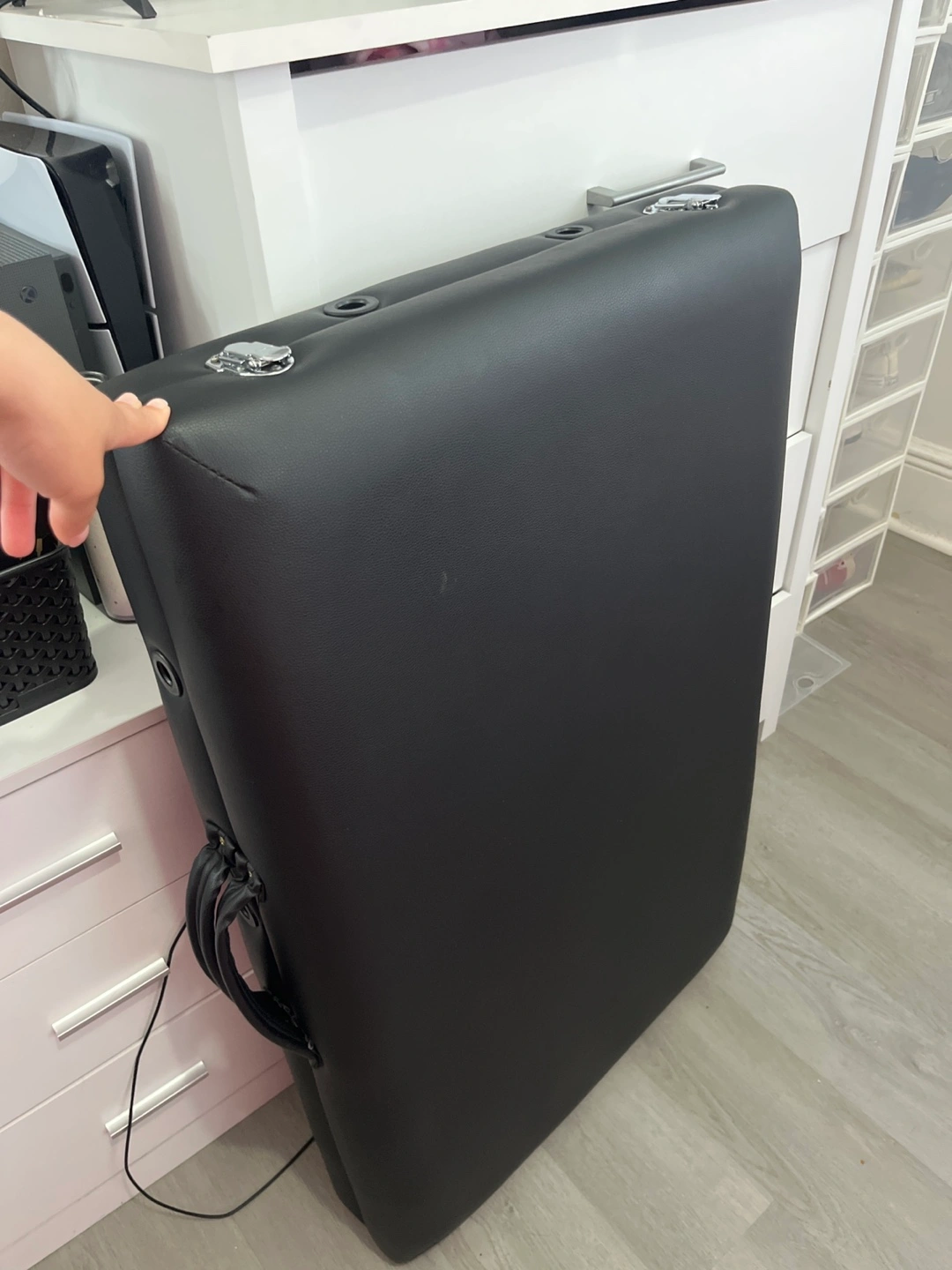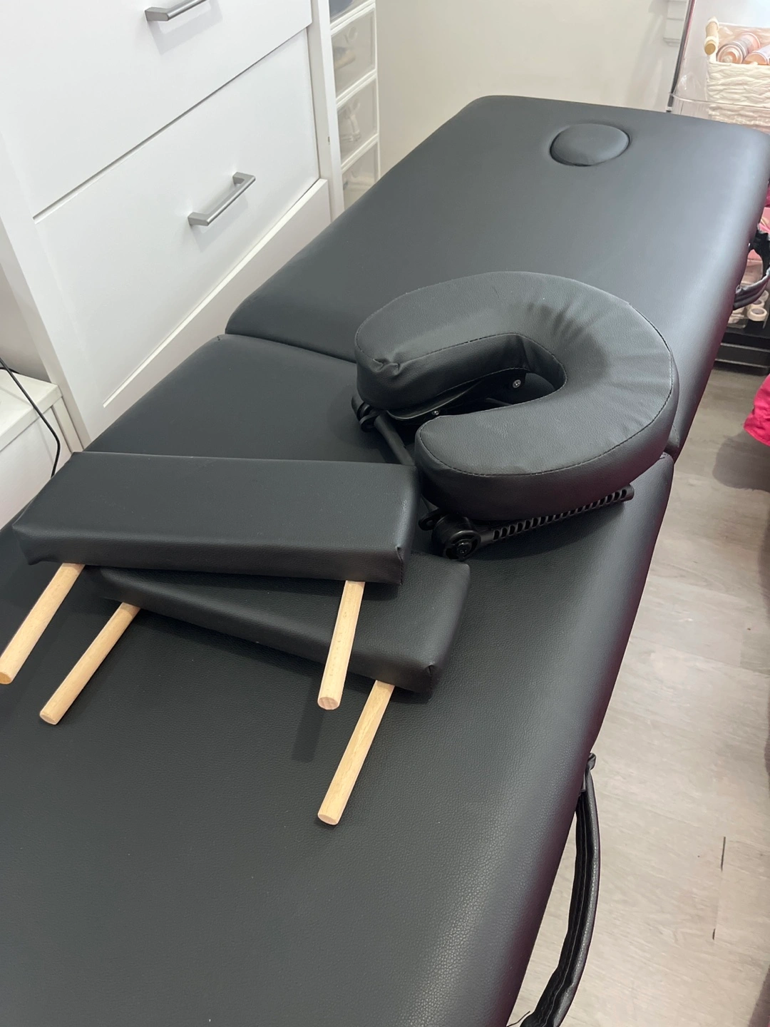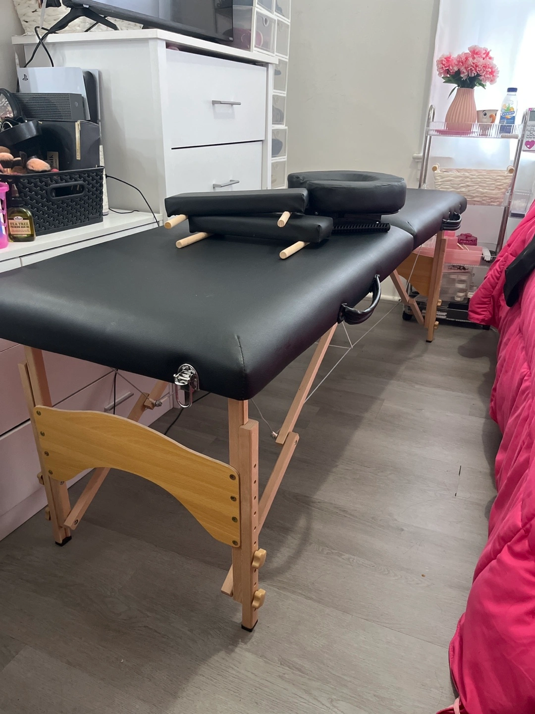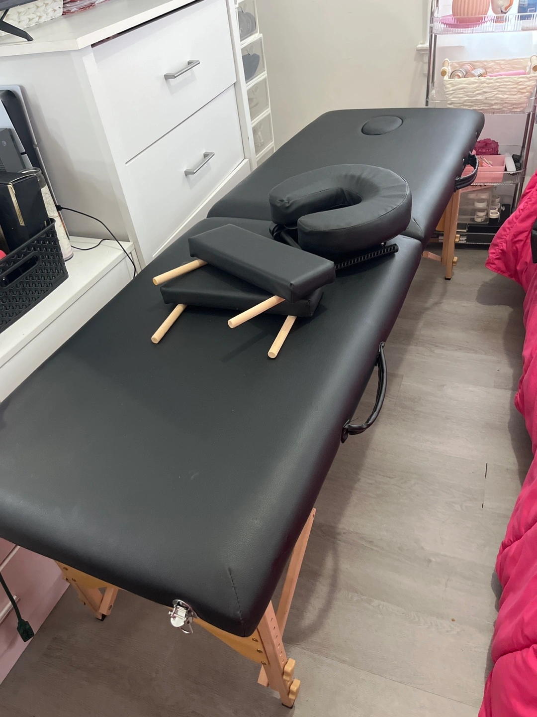 Black massage table. Features a face cradle and armrests. A nice place to unwind after a long day. Also used in the lash business and great for traveling !