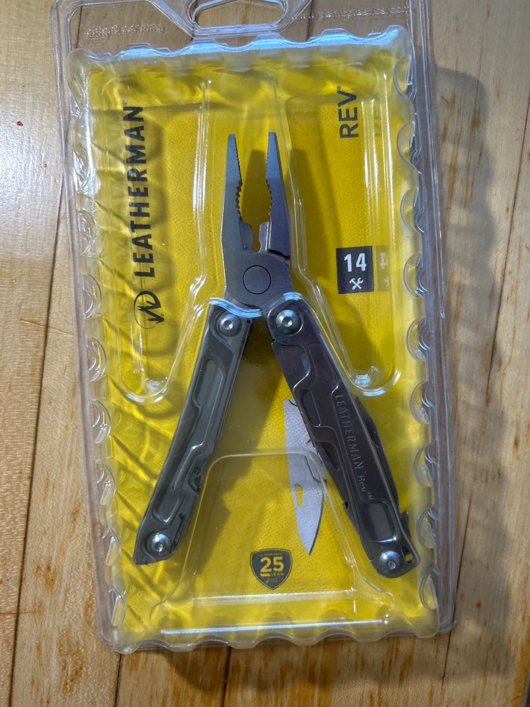 I'm selling a brand new Leatherman Rev multi-tool. It comes with 14 different tools to help you tackle various tasks. This tool is known for its durability and versatility, perfect for everyday use or outdoor adventures. It also comes with the original packaging!