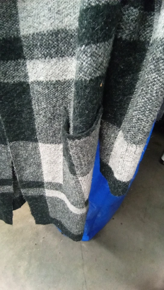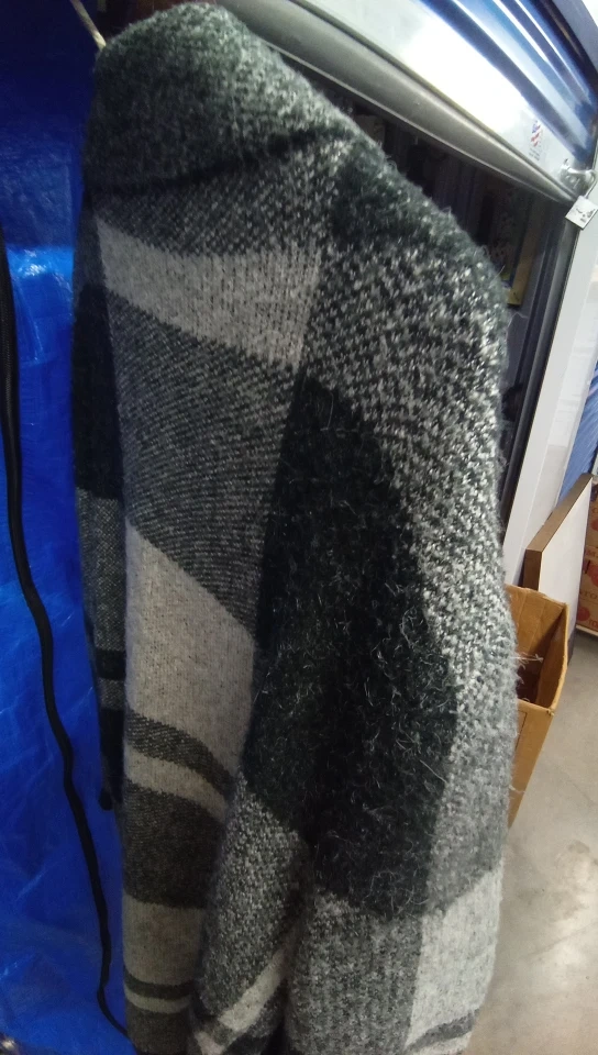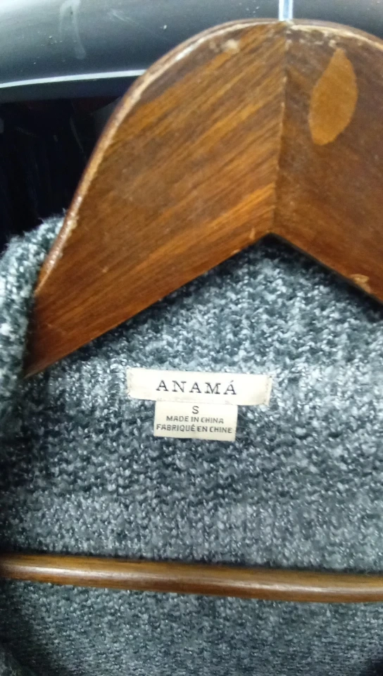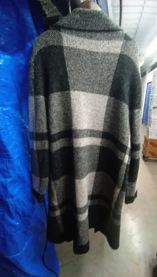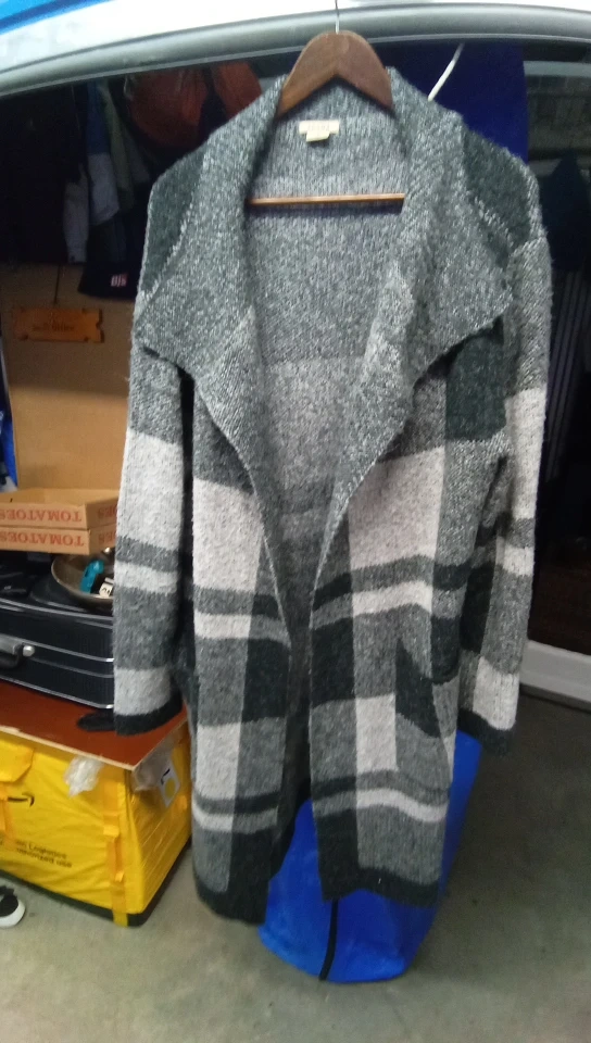 Here's a cozy ANAMA cardigan in a gray plaid pattern! It's a size small and features a comfortable, open-front design. Perfect for layering on chilly days!