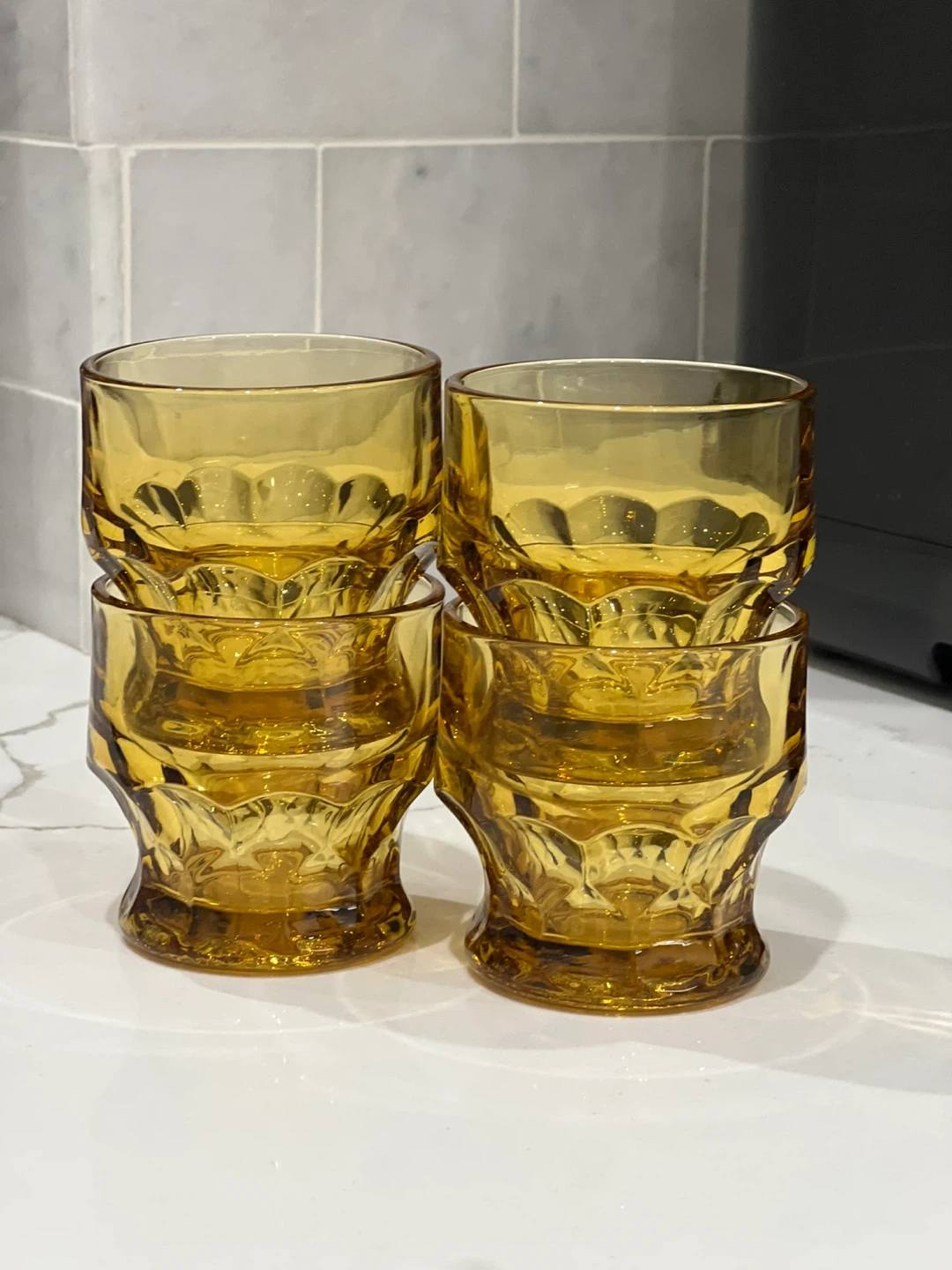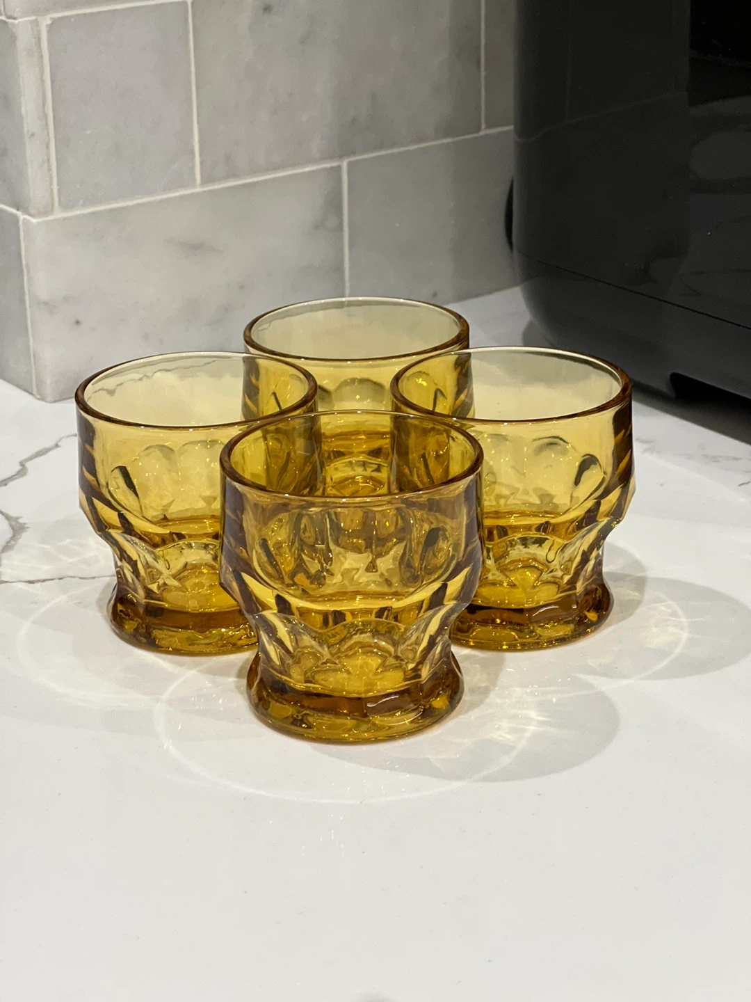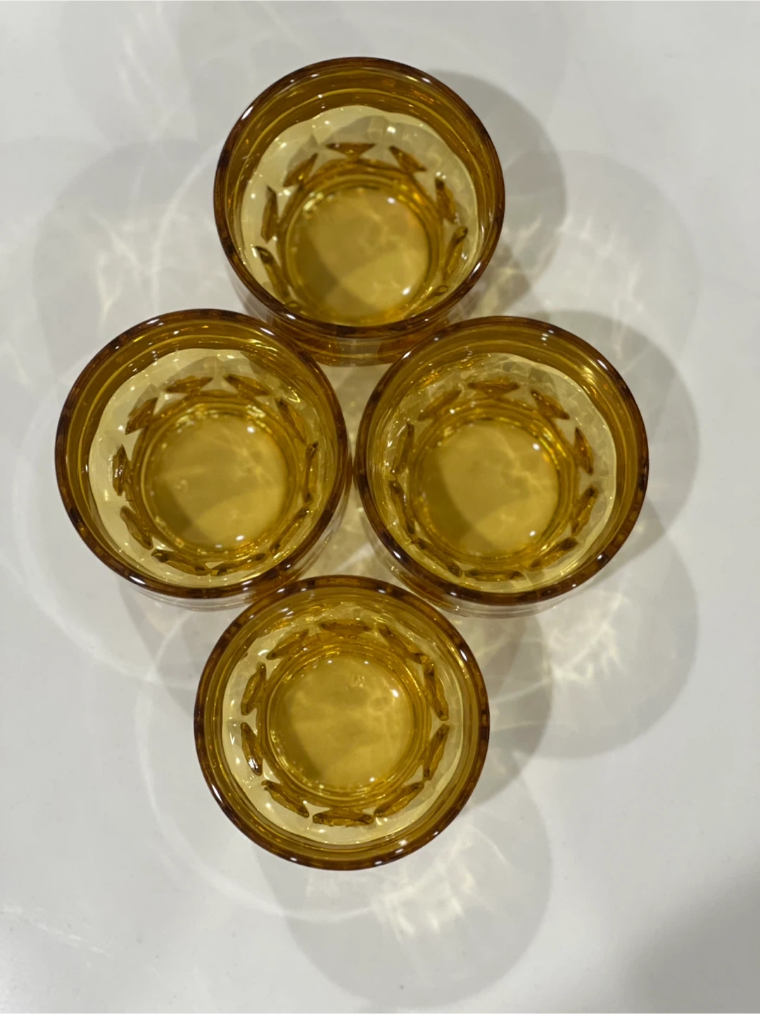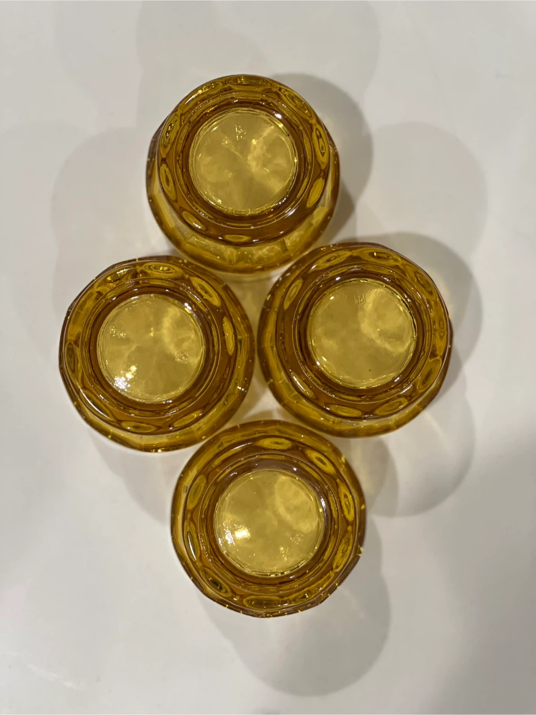 Add a touch of vintage sophistication to your bar with this set of four Georgian amber tumbler glasses by Anchor Hocking. The round glasses have a honeycomb pattern and a capacity of 5 oz. These original glasses from the 1970s are made of pressed and fused glass in the United States, and are dishwasher safe for your convenience. The glasses are 3 inches tall and have a decorative style that suits all occasions. Whether you're a collector, a whisky enthusiast, or simply looking for a unique addition to your barware collection, these glasses are a must-have. No chips or cracks