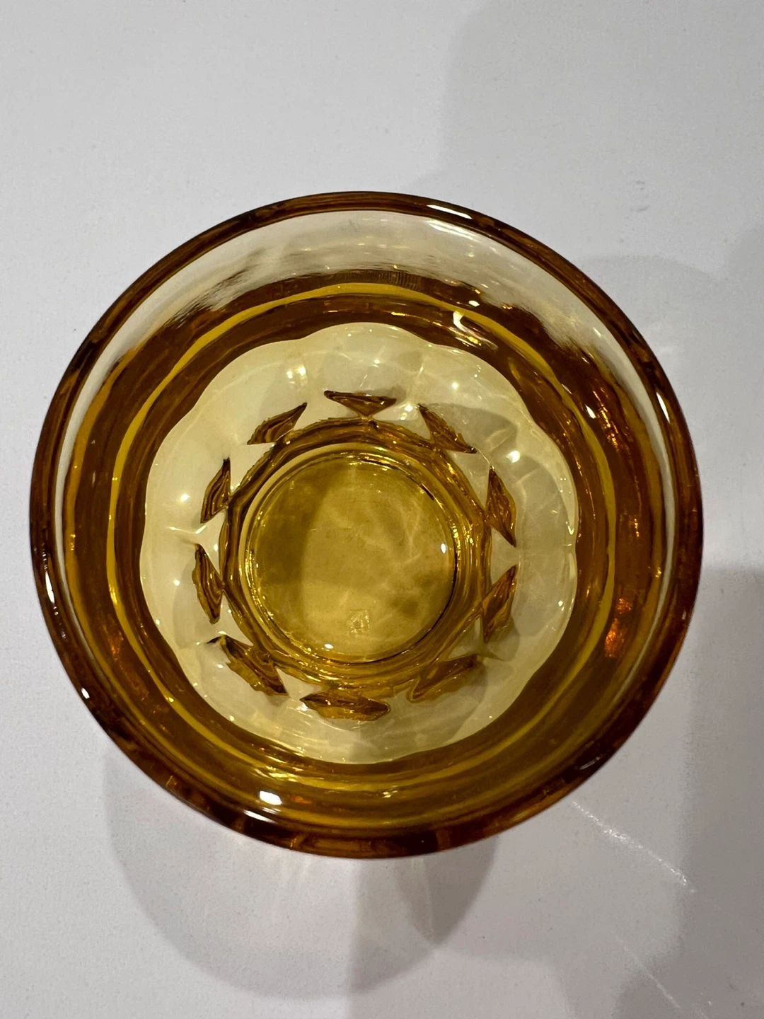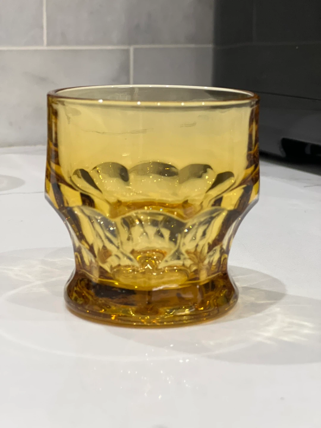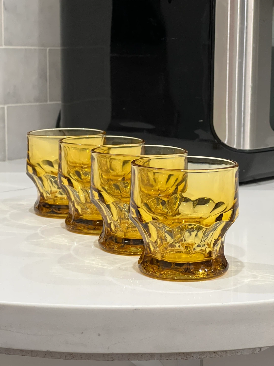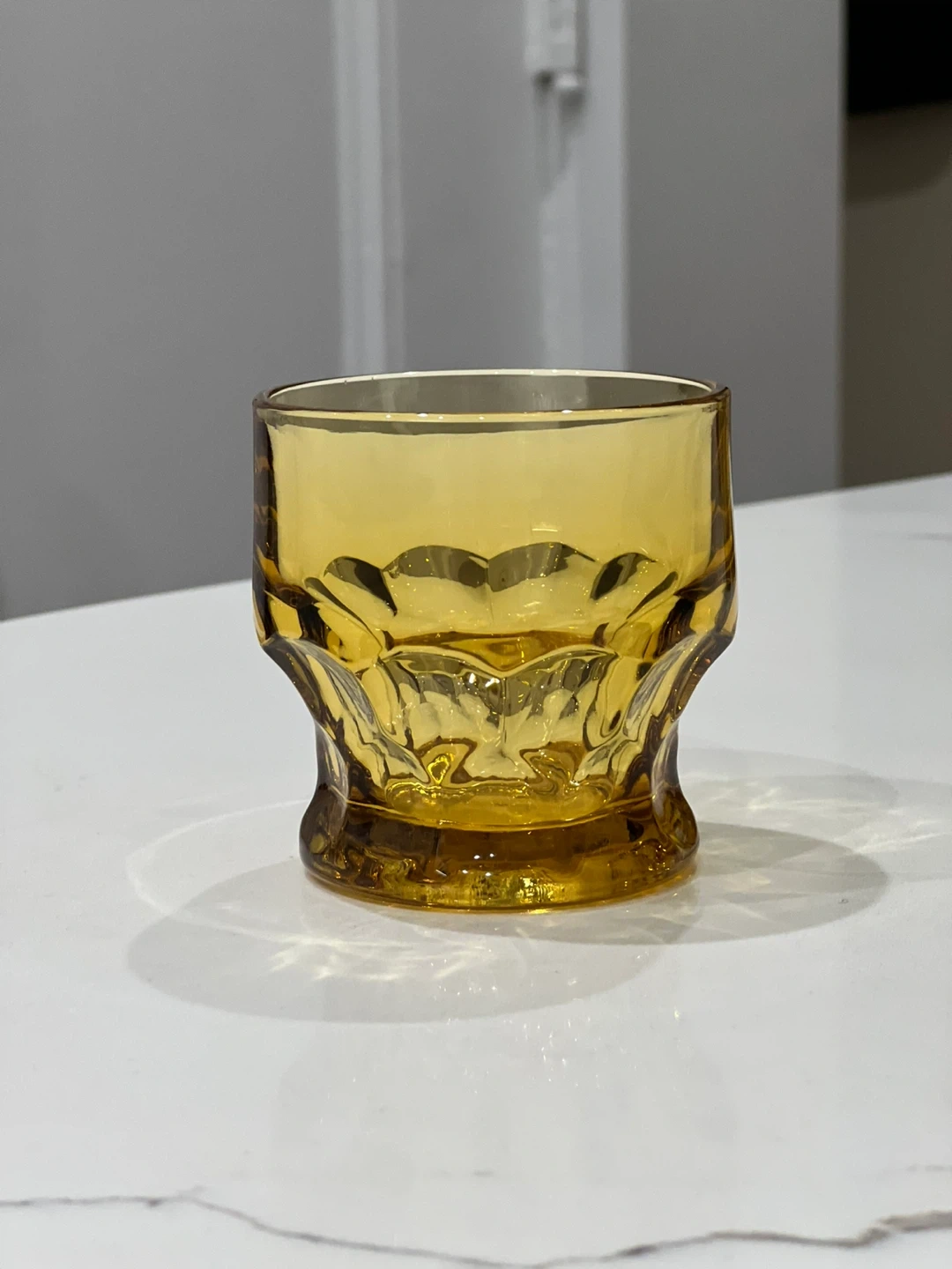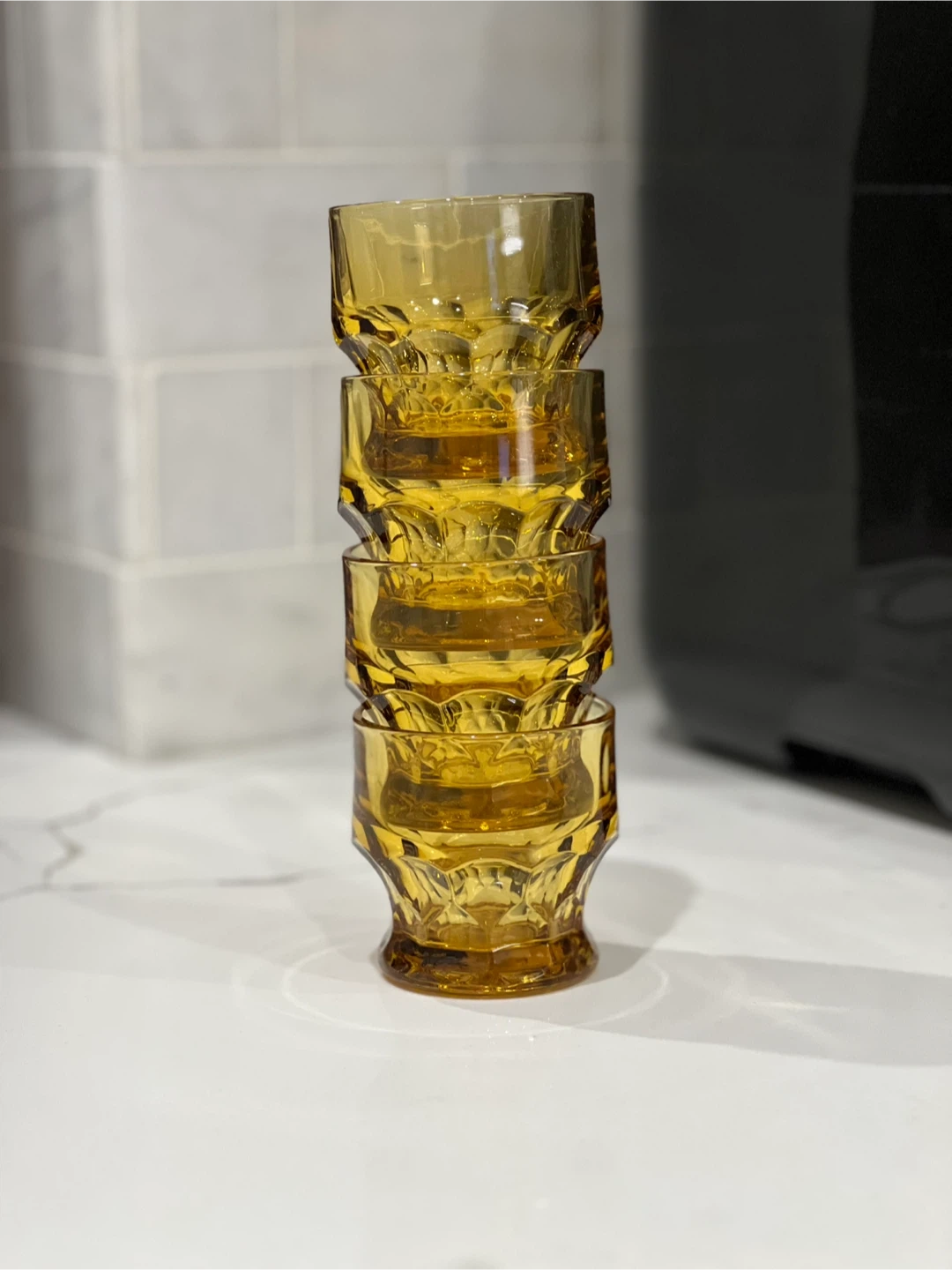 Add a touch of vintage sophistication to your bar with this set of four Georgian amber tumbler glasses by Anchor Hocking. The round glasses have a honeycomb pattern and a capacity of 5 oz. These original glasses from the 1970s are made of pressed and fused glass in the United States, and are dishwasher safe for your convenience. The glasses are 3 inches tall and have a decorative style that suits all occasions. Whether you're a collector, a whisky enthusiast, or simply looking for a unique addition to your barware collection, these glasses are a must-have. No chips or cracks