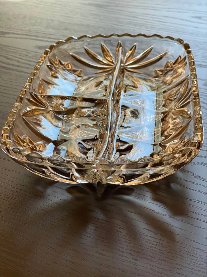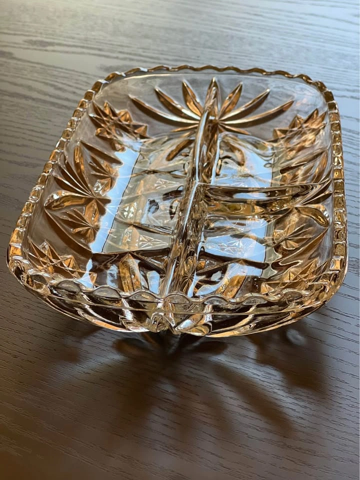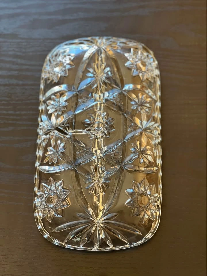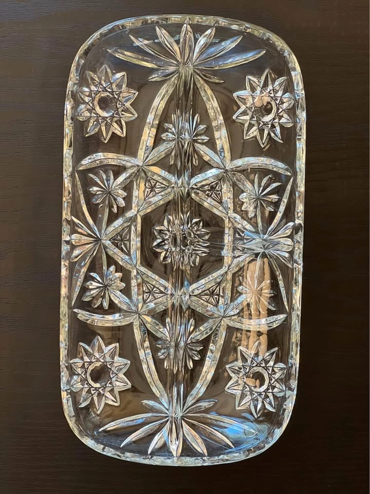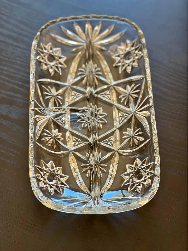 This is an Anchor Hocking Early American Prescut rectangular tray, also known as a hostess tray. The pattern, often called "Star of David," features a pressed star and fan design. It was introduced in 1960 and was in regular production for some time. The tray is made of clear, pressed glass and is divided into 3 sections. The dimensions are around 12 inches long and 6.5 inches wide.