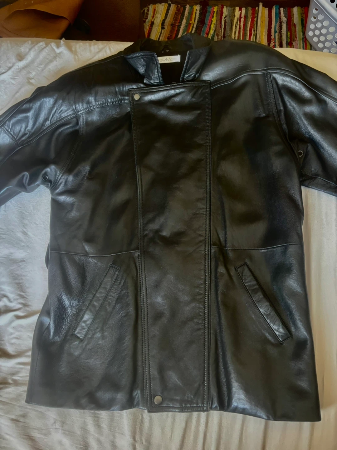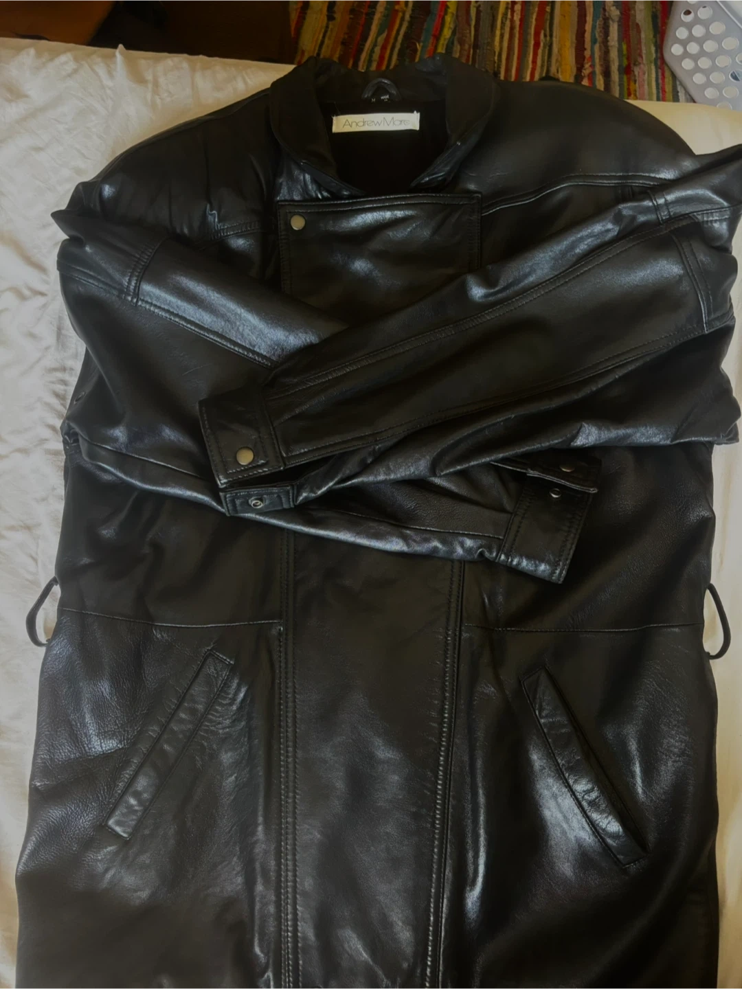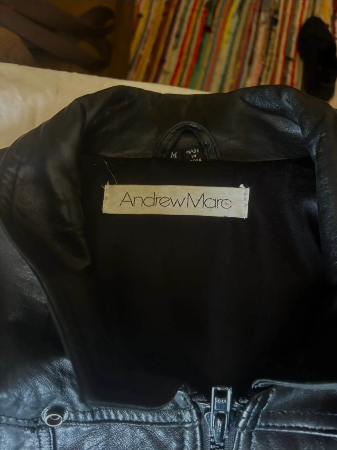 Andrew Marc black leather jacket, shoulder padded with front flap. One internal pocket, the tag says Size M, but feels much larger, closer to XL