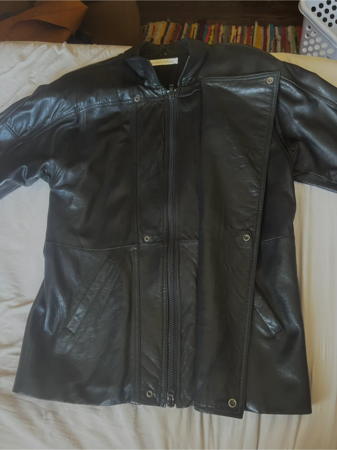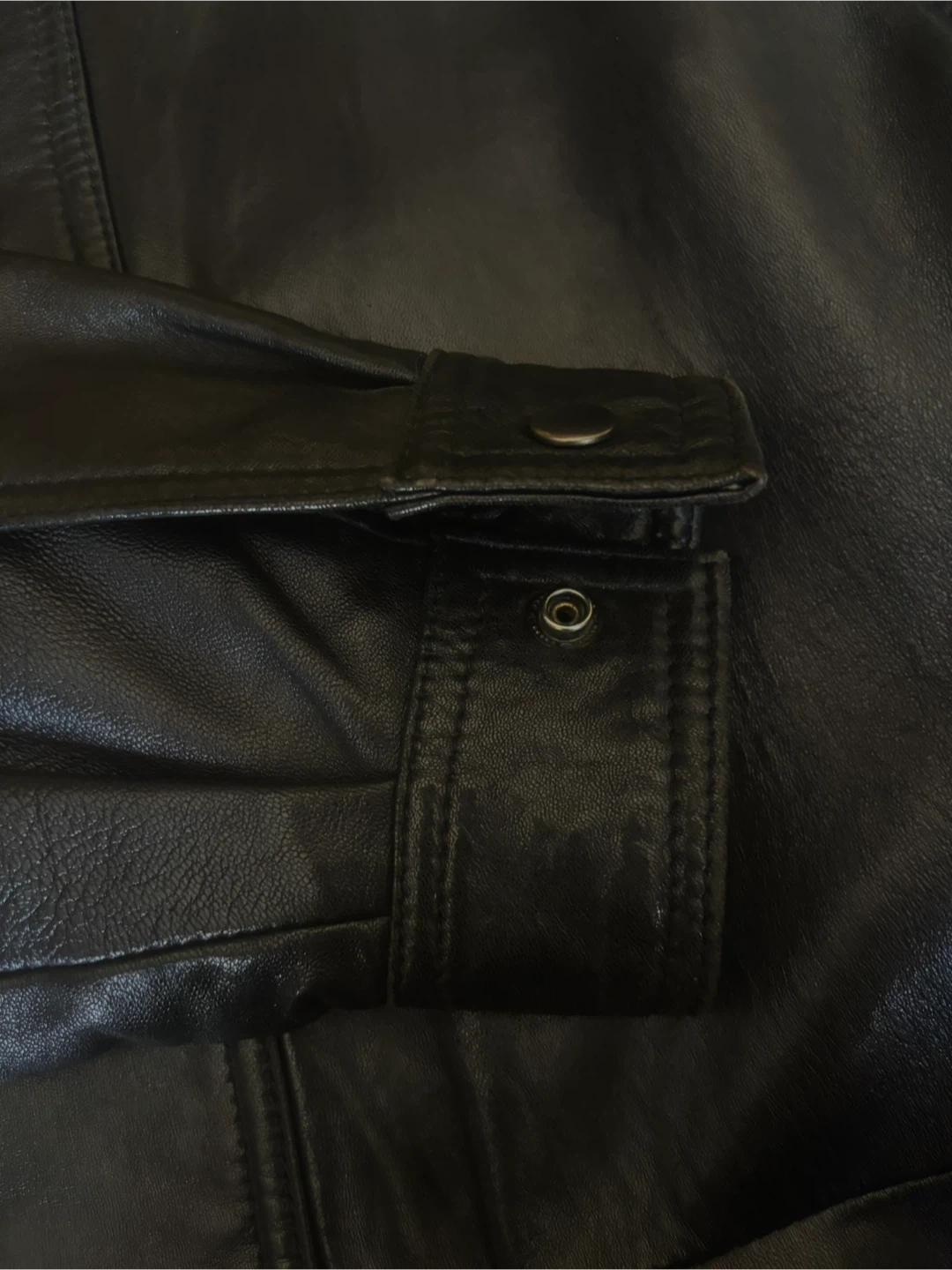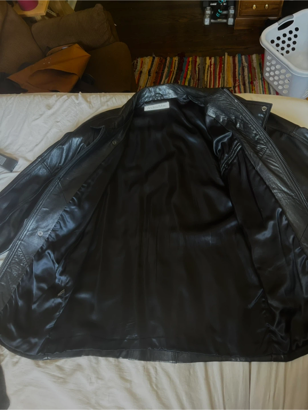 Andrew Marc black leather jacket, shoulder padded with front flap. One internal pocket, the tag says Size M, but feels much larger, closer to XL