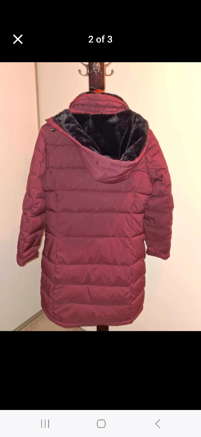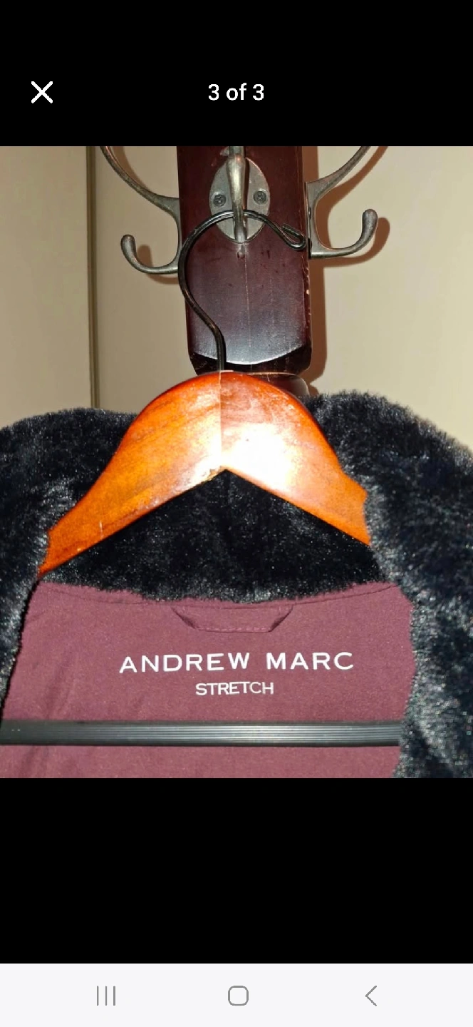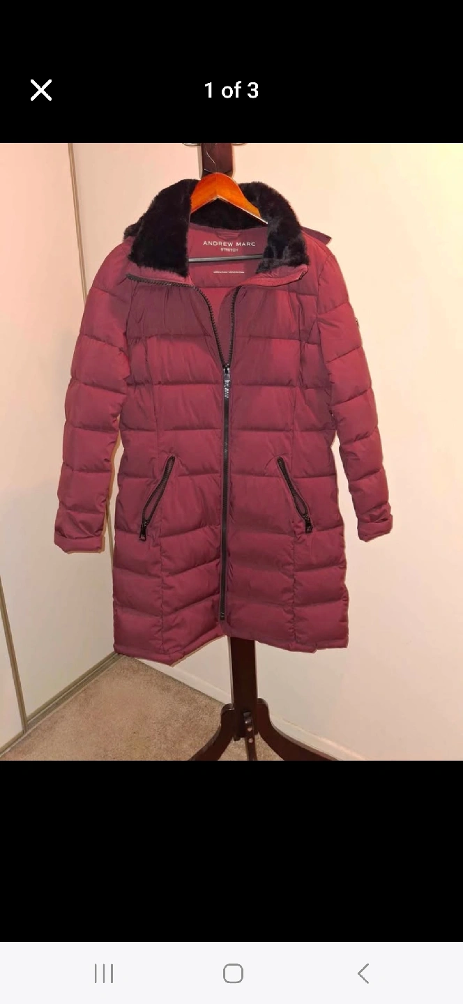 Selling a burgundy puffer coat from Andrew Marc. It's in great condition and features a faux fur collar. Perfect for staying warm this winter!