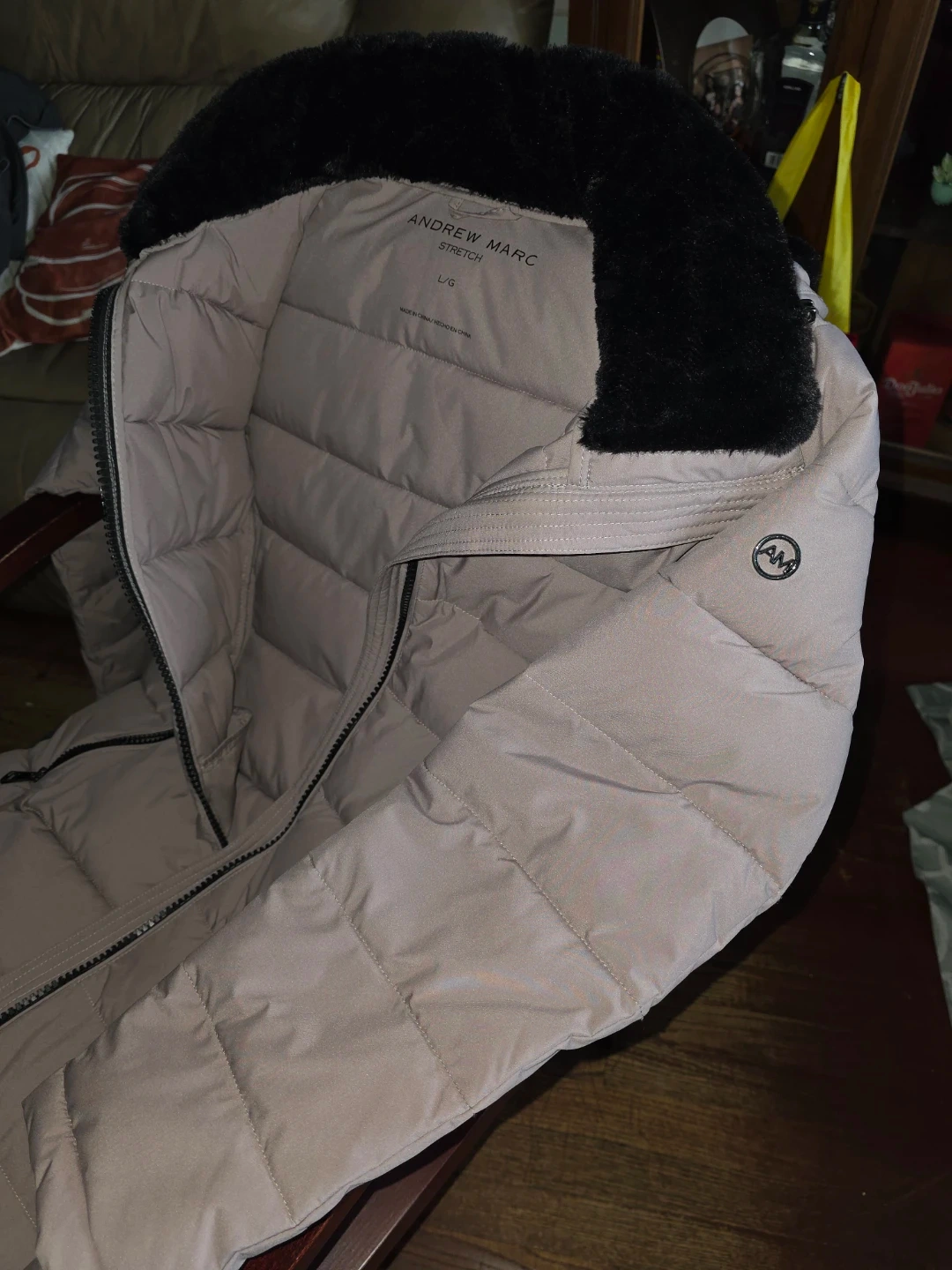 10Selling a gently used Andrew Marc stretch puffer coat. It's a size L/G and features a stylish design with a black faux fur collar.