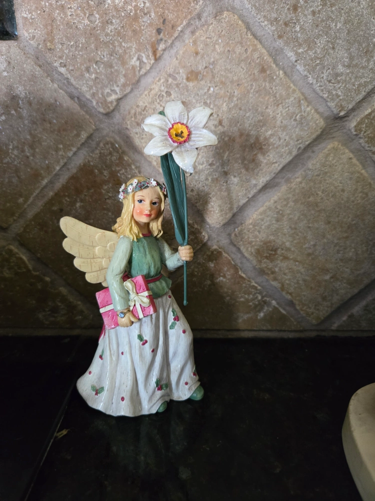 This is a lovely angel figurine. She's holding a white flower in one hand and a pink gift in the other. She is wearing a long white skirt with red and green holly accents.