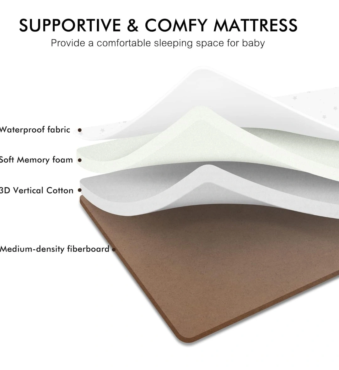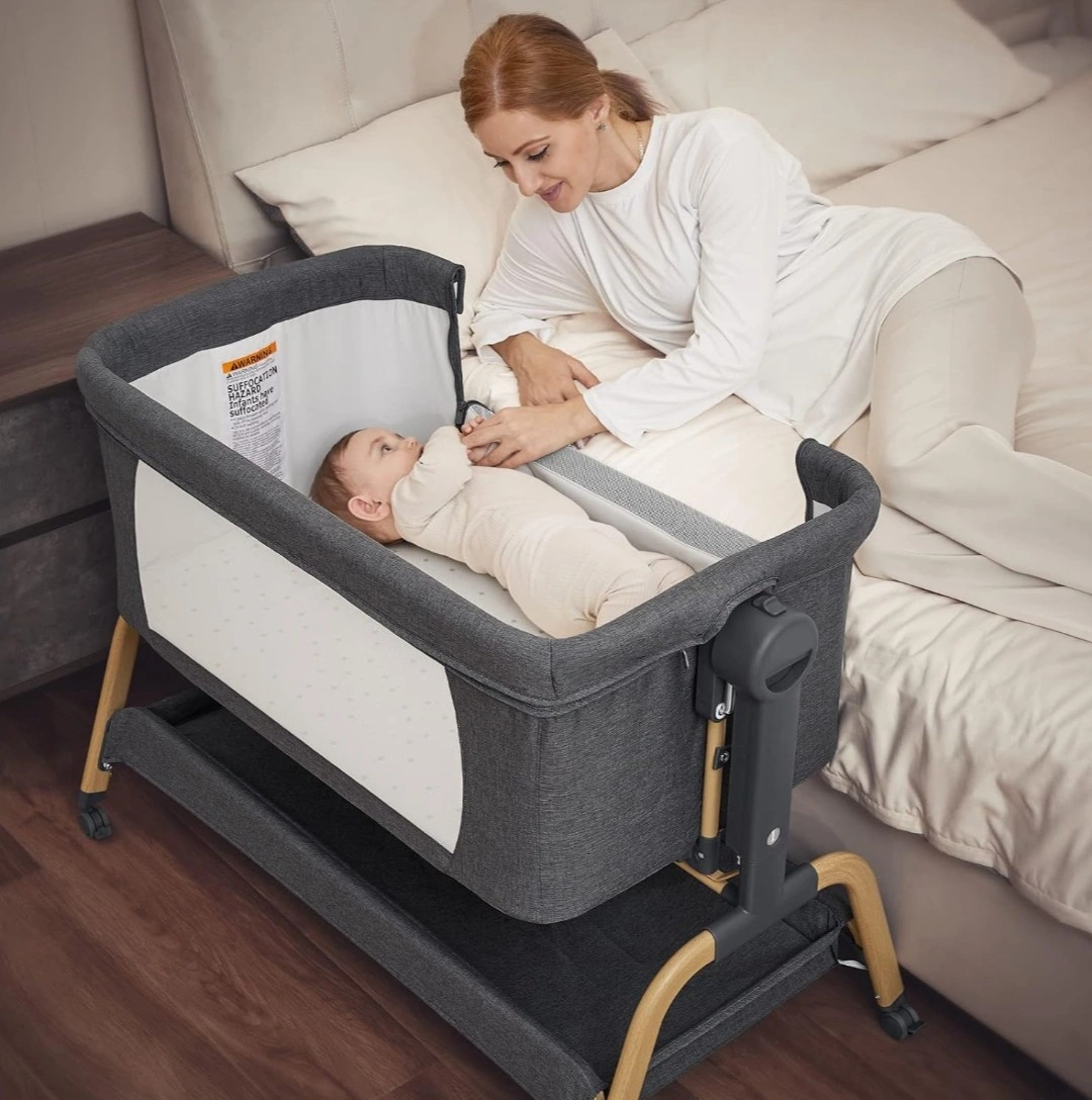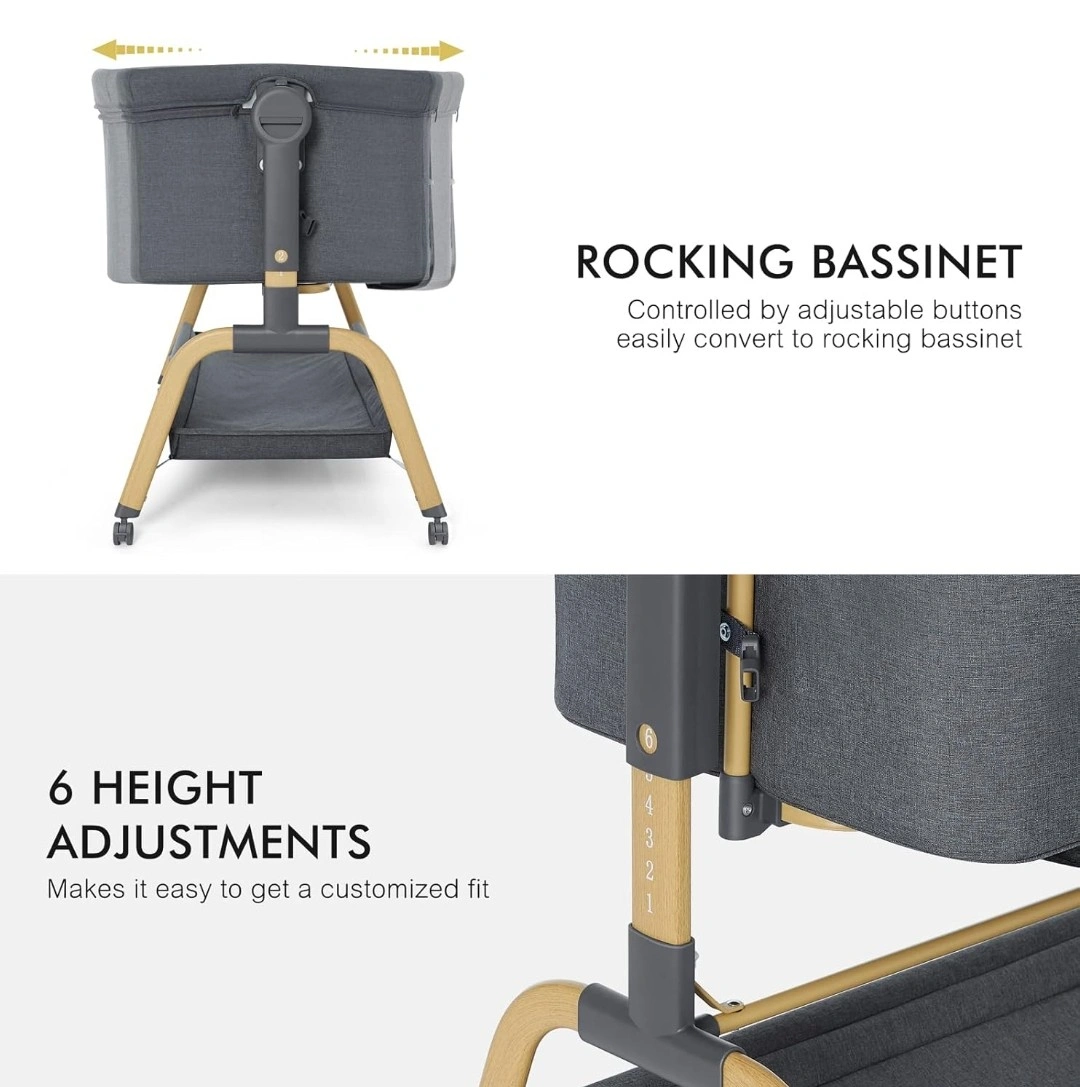 15Baby bassinet, gray fabric, wooden legs, height adjustable, includes mattress. Rocking function. Storage shelf underneath. ANGELBLISS 3 in 1 Baby Bassinet, Rocking Bassinets Bedside Sleeper with Comfy Mattress and Wheels, 6 Height Adjustable Easy Folding Portable Bedside Crib for Newborn Infant