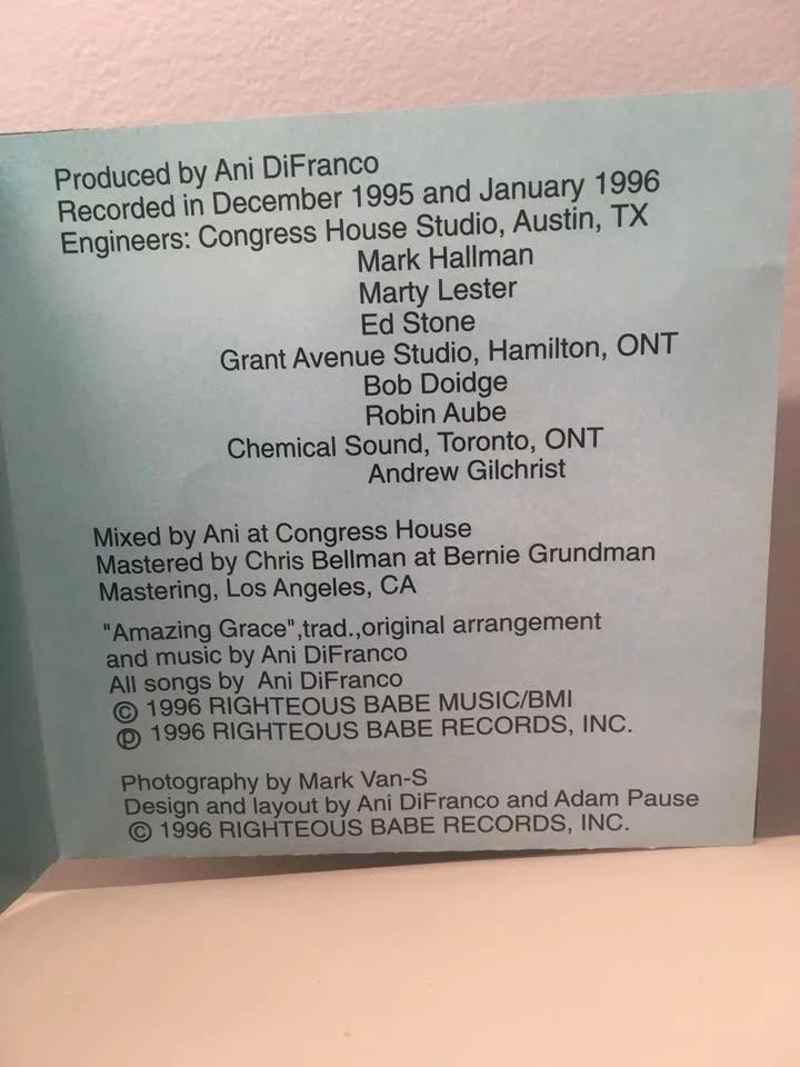 Ani Difranco’s seventh studio album from 1996. Includes a 9.5 x 14 inch lyric mini-poster. Track listing is as follows: 1) Untouchable Face 2) Outta Me, Onto You 3) Superhero 4) Dilate 5) Amazing Grace 6) Napoleon 7) Shameless 8) Done Wrong 9) Going Down 10) Adam And Eve 11) Joyful Girl From a smoke and pet free home. Check out in person before purchasing. Thanks for looking.