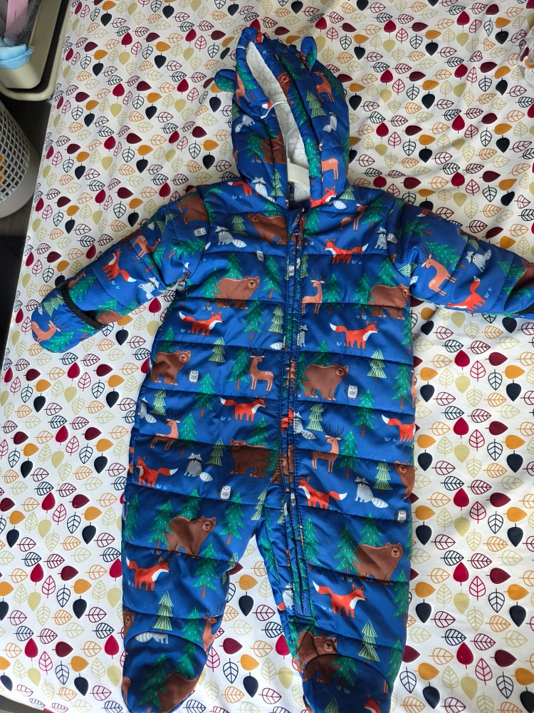 75This cute blue snowsuit is covered in a fun animal print featuring bears, foxes, and deer! It's a cozy puffer style, perfect for keeping your little one warm during the winter months