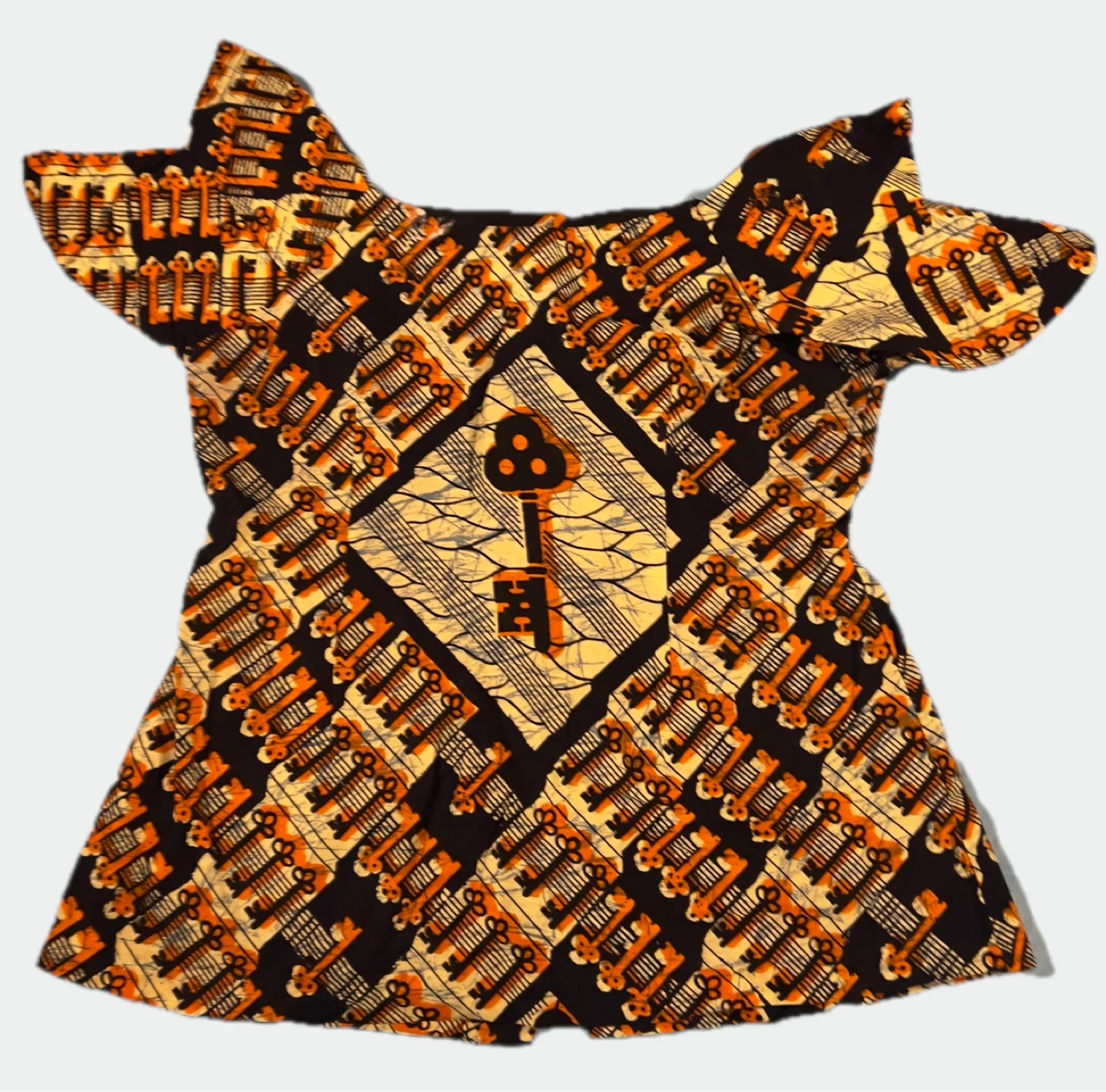 60This is a unique printed top and skirt set. The fabric features a distinctive pattern with a key design. Perfect for adding a pop of color and style to your wardrobe! Medium