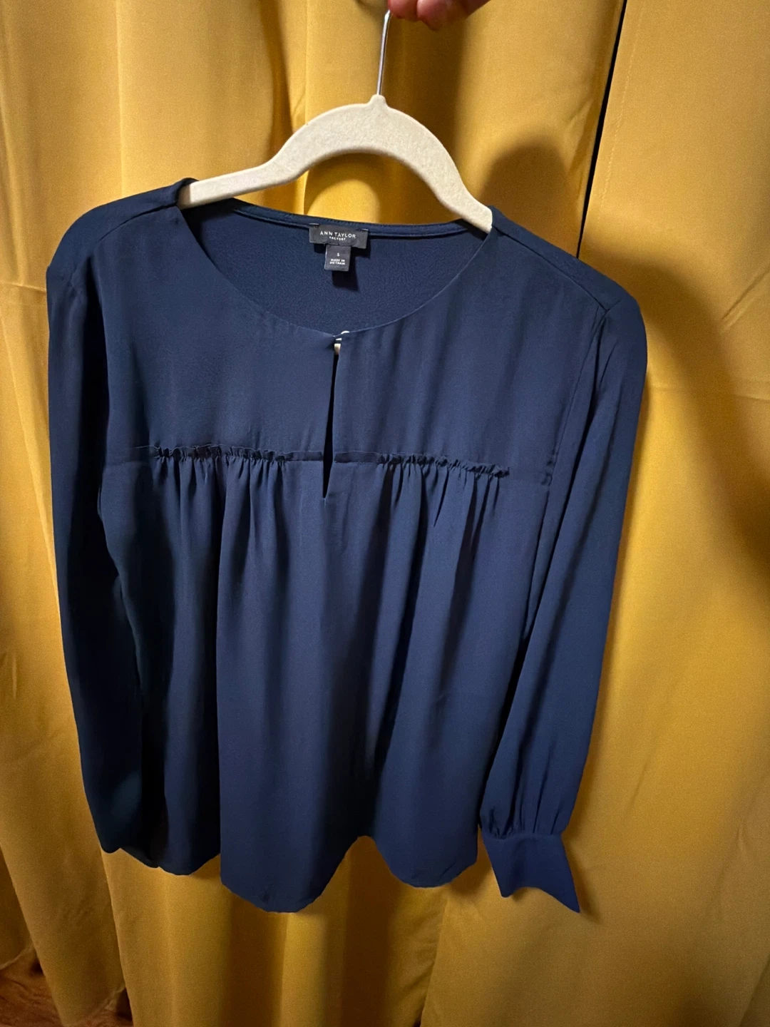 20I'm selling a beautiful navy blue blouse from Ann Taylor! It's a size medium and in great condition. Perfect for work or a night out