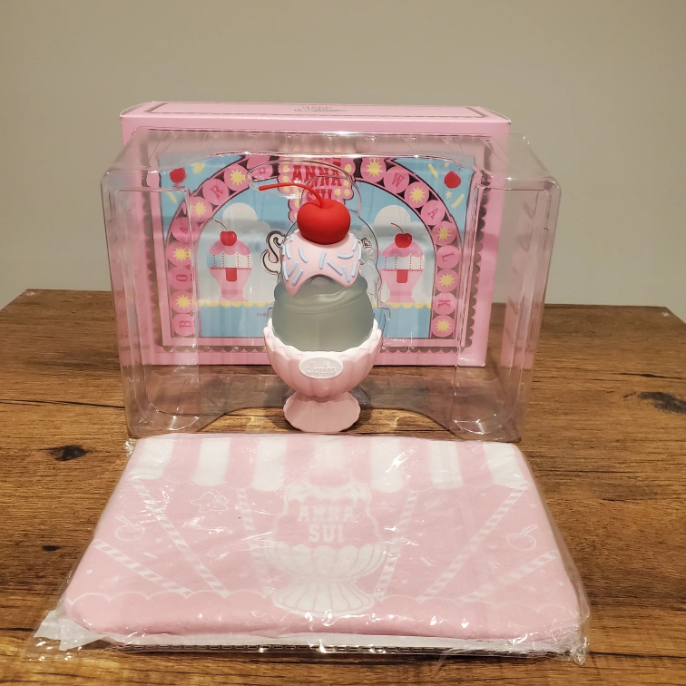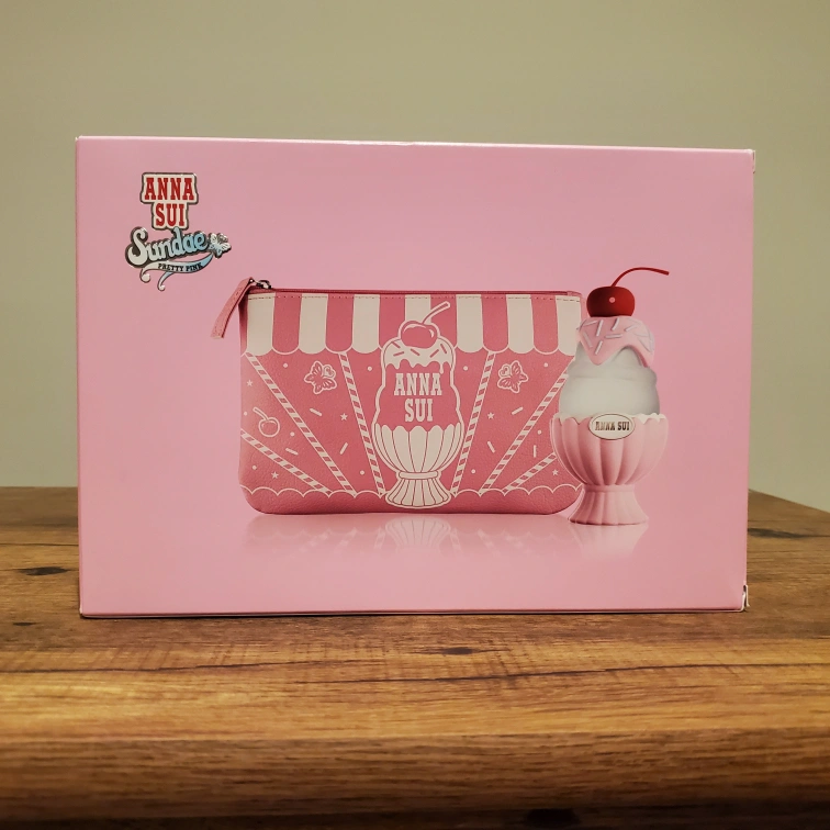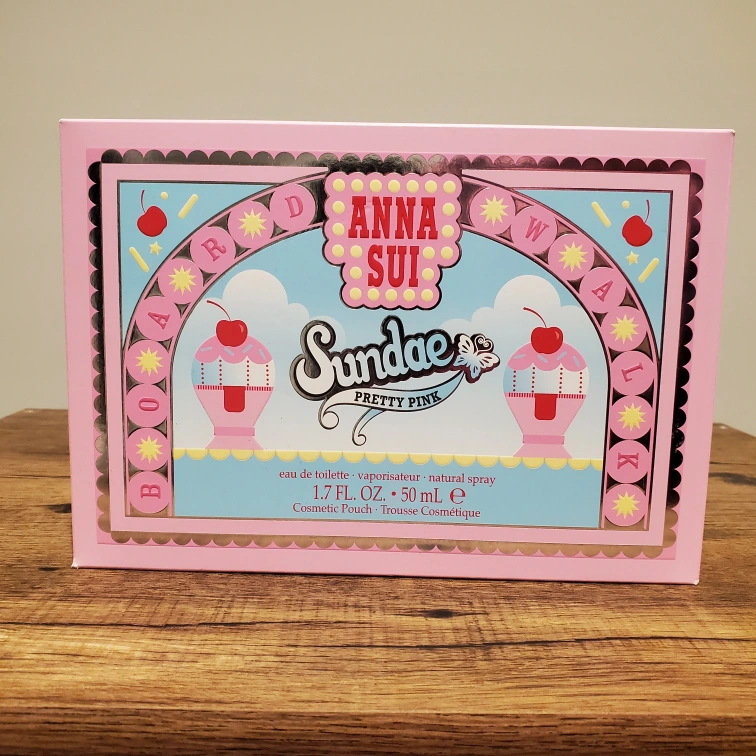 26New in original packaging. Only removed for photos. I scream, you scream, we all scream for ice cream & Anna Sui's new Sundae fragrance collection! The Pretty Pink eau de toilette is perfect for the girly girl and is scooped into a never before seen ice cream sundae bottle with the perfect spray through cherry on top. Cute gift set, which includes an adorable pouch!