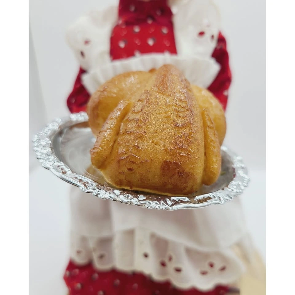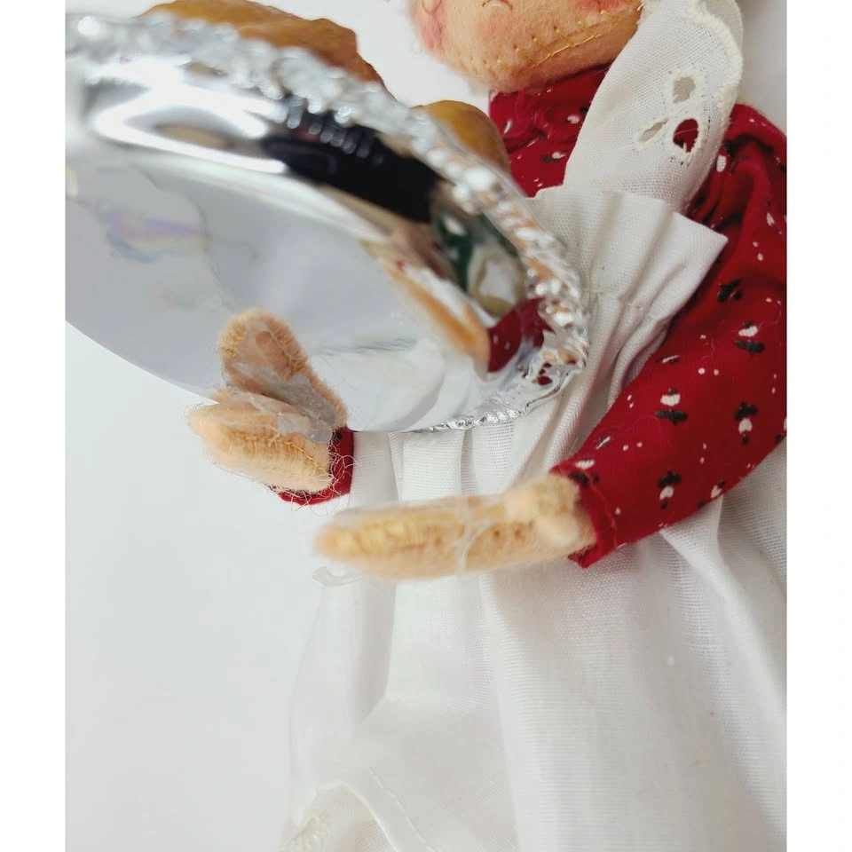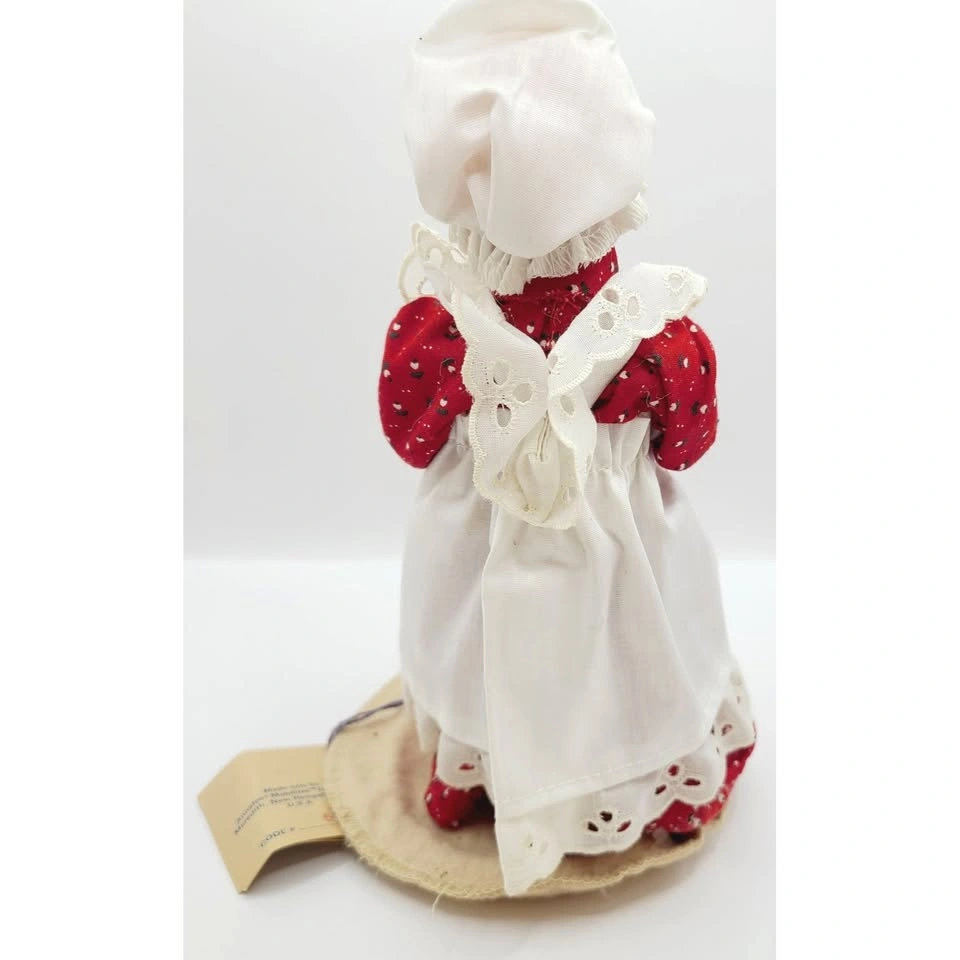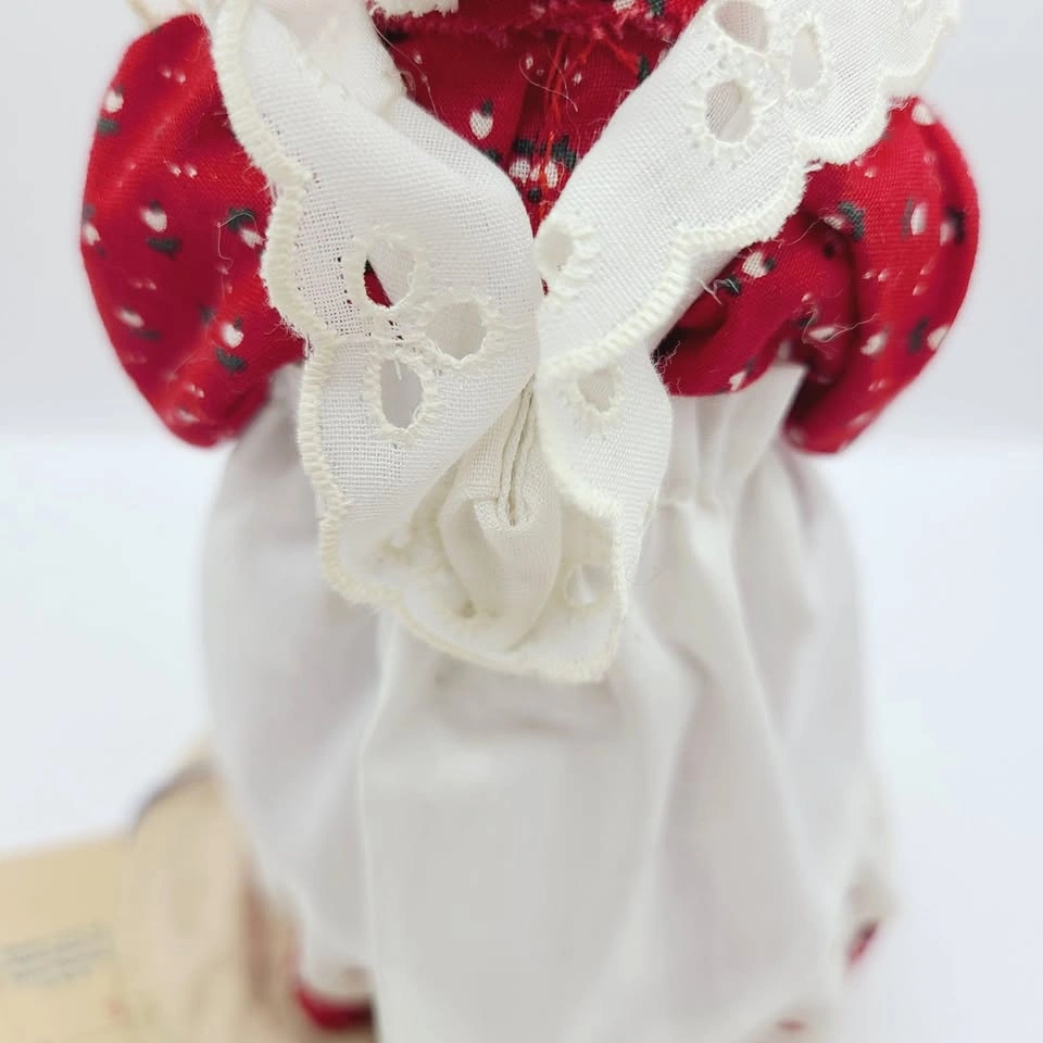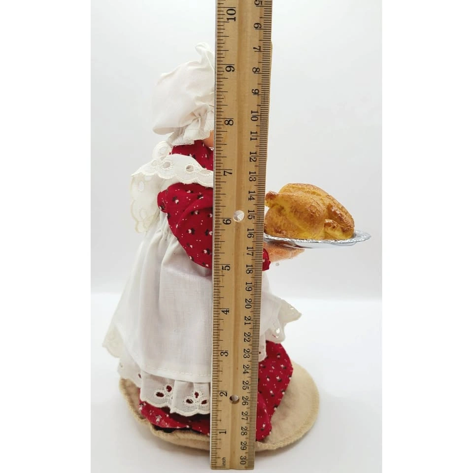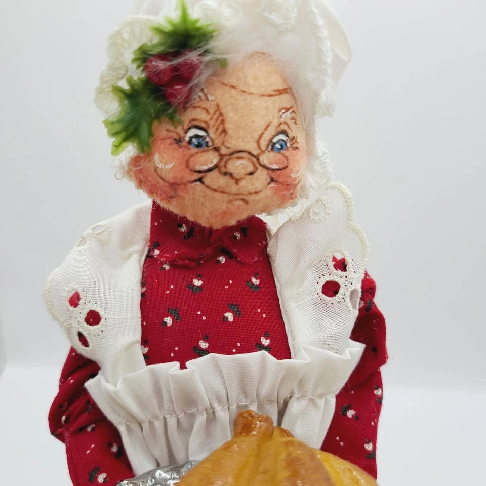 15This Annalee Doll figurine features Mrs. Claus in a red dress, holding a turkey. It's in good used condition, except one hand has unglued from the turkey tray due to being in storage. I haven't repaired it. It stands 9.5 inches tall, was made in the U.S.A., and has a hand-painted face. It's a vintage collectible from 1991. There are no stains, but the glue is undone on one hand from storage.