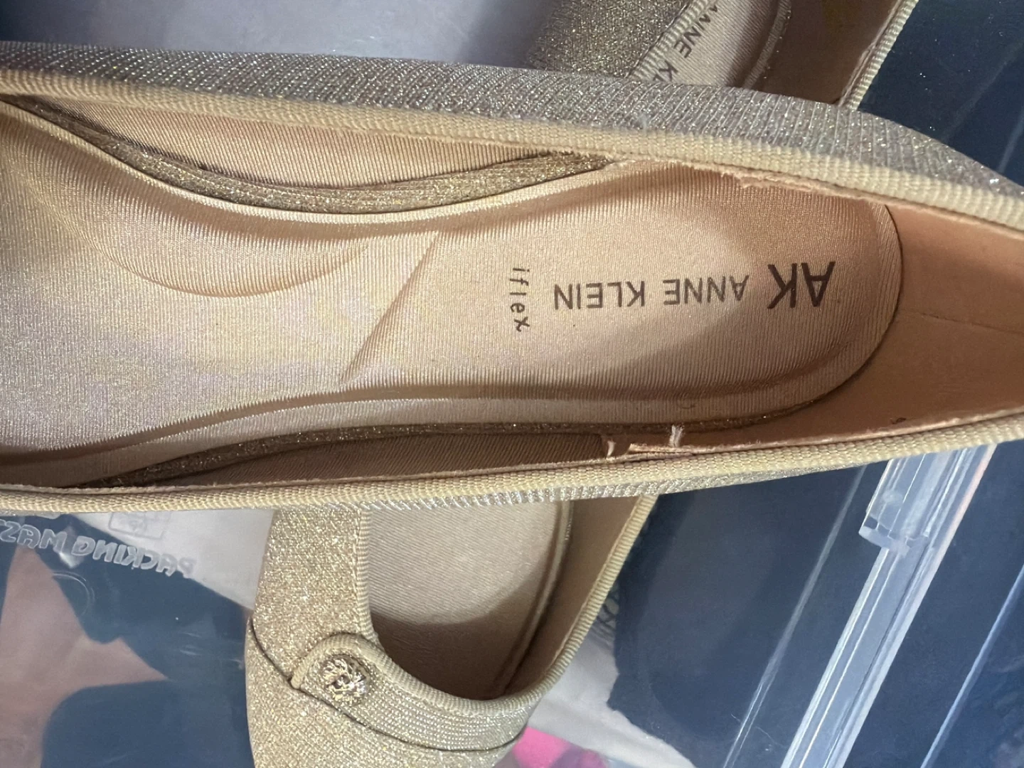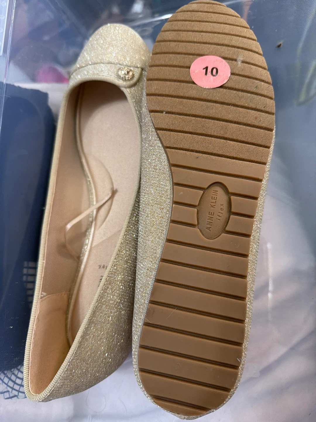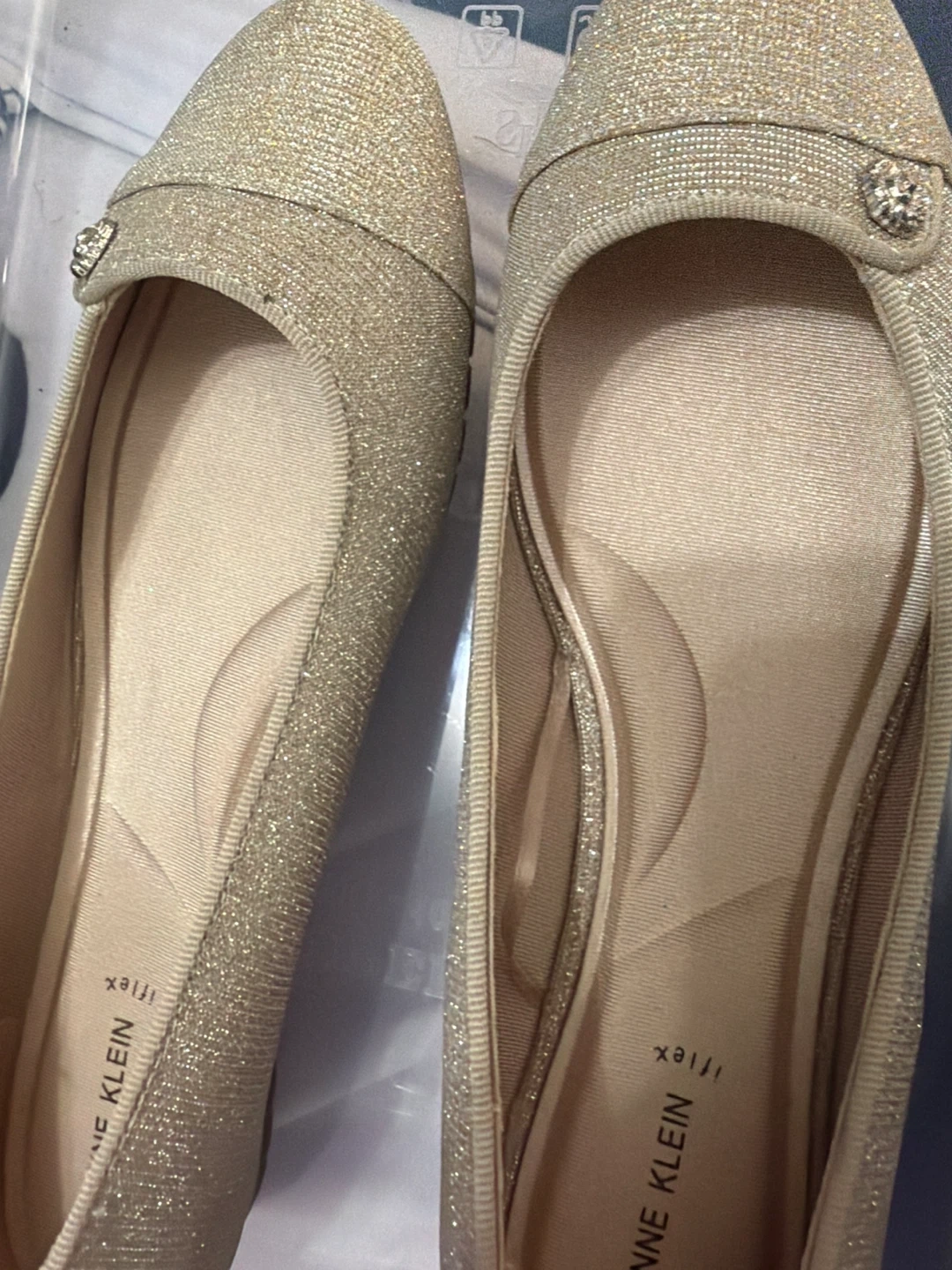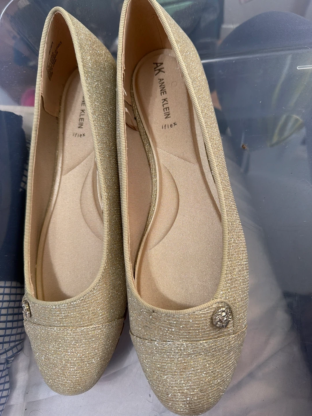 60These are a pair of Anne Klein iFlex flats in a gold glitter color! They are a size 10 and in good condition. Perfect for adding a touch of sparkle to any outfit