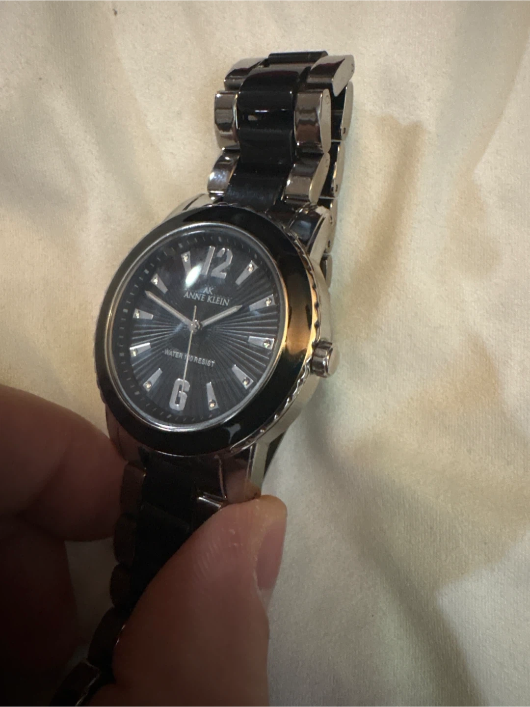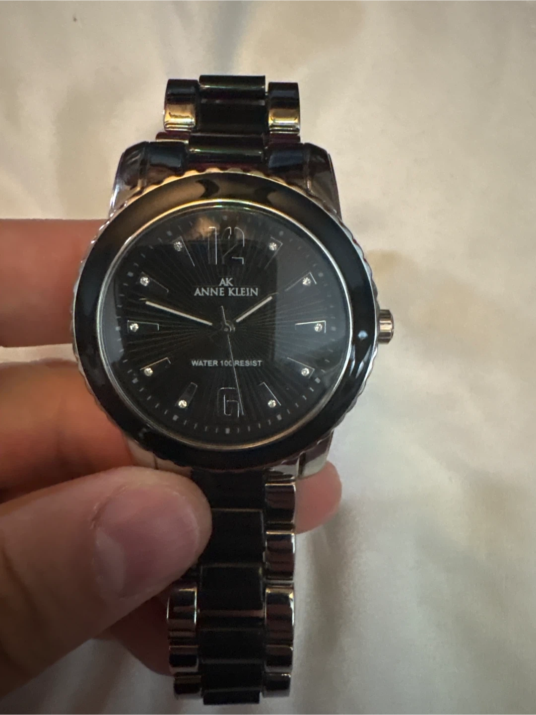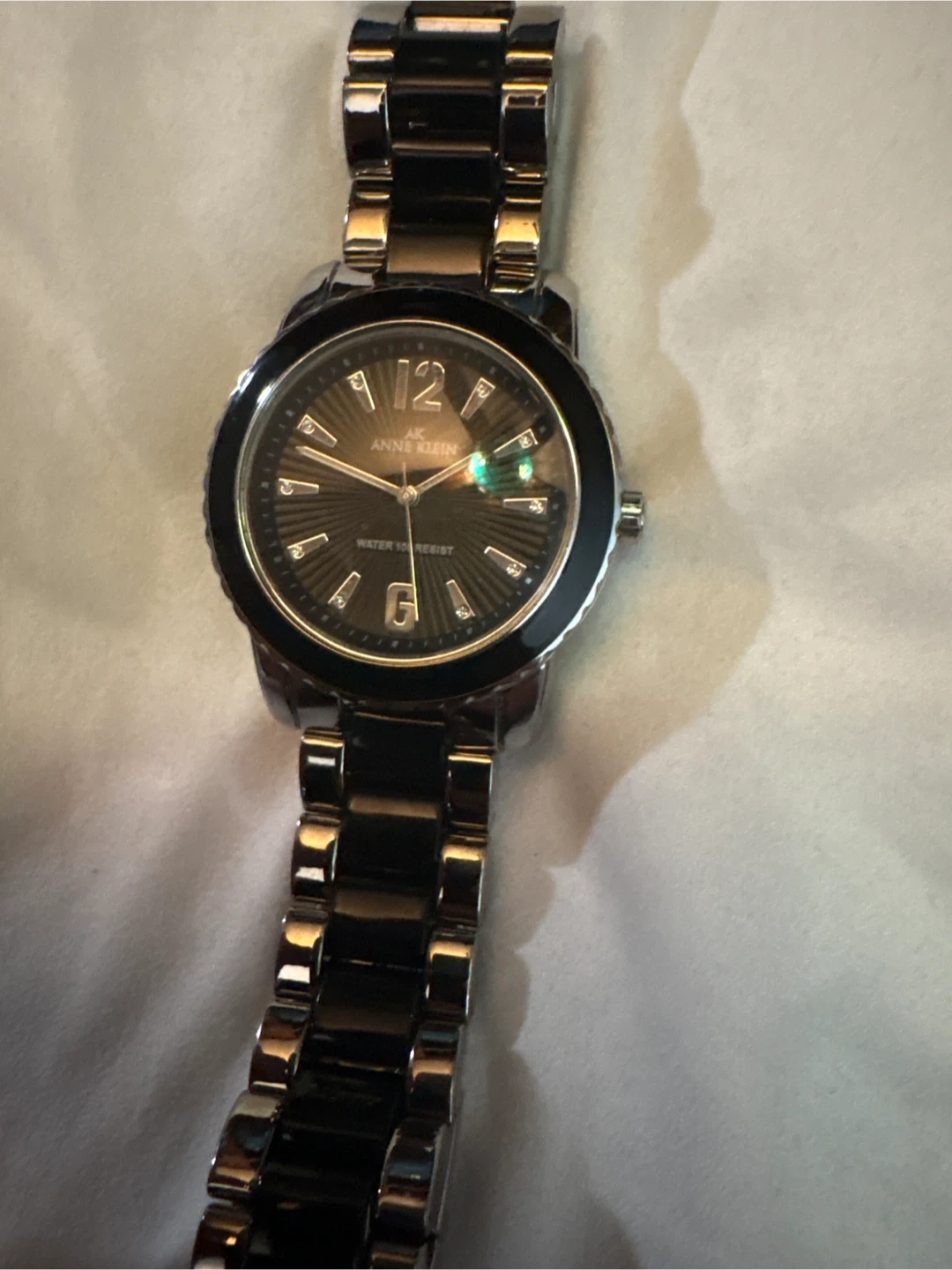 Selling an Anne Klein mens watch. It has a black and silver design and is water-resistant up to 100 feet. The watch band is stainless steel.