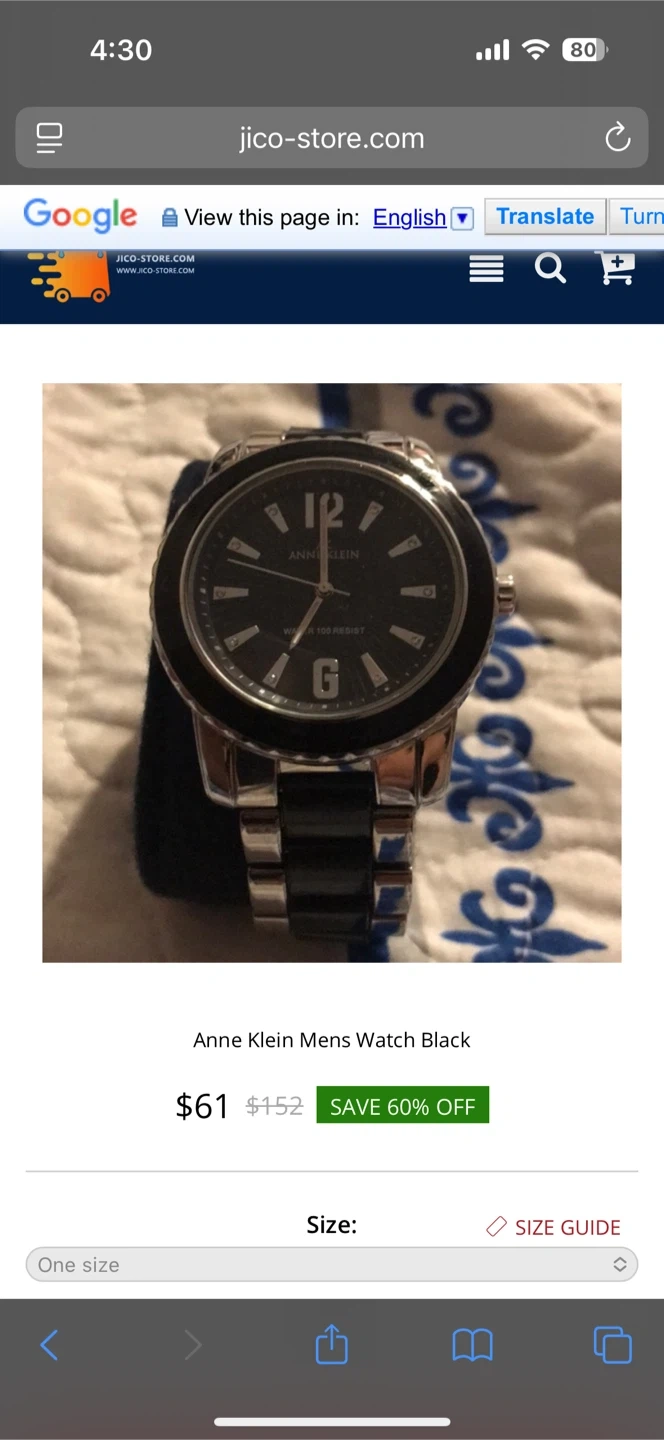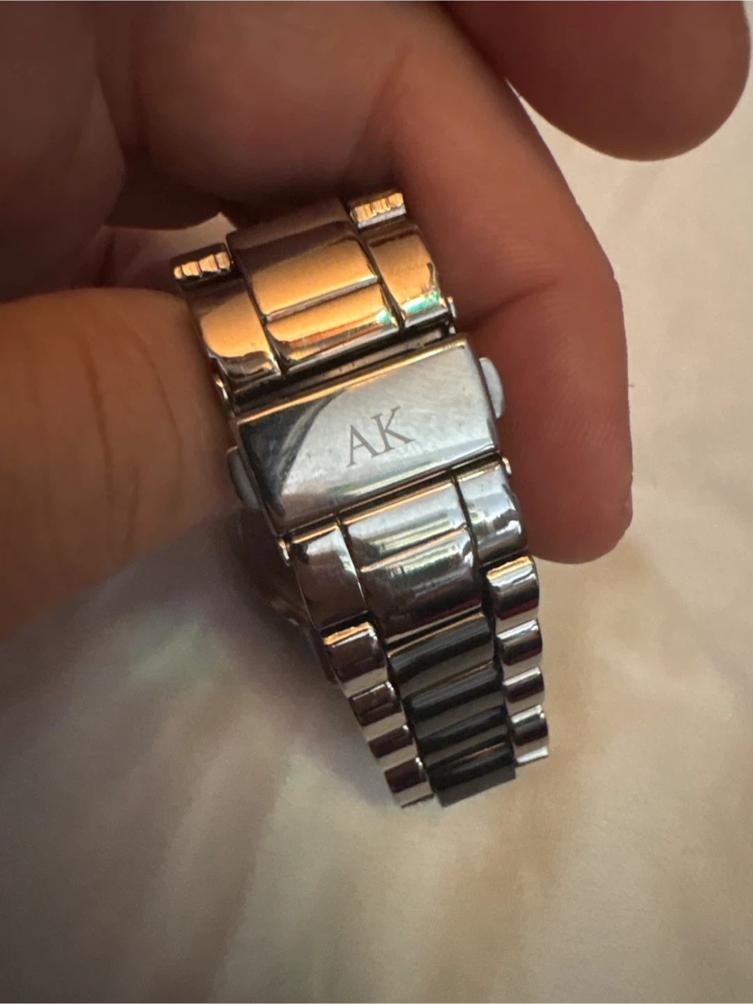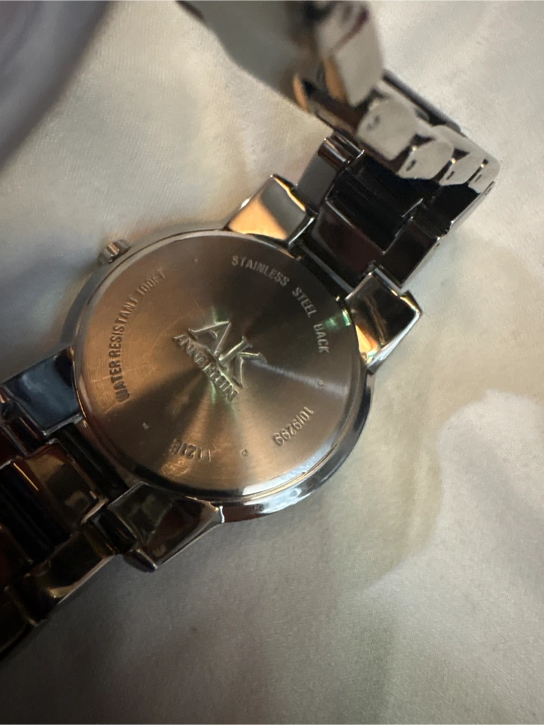 Selling an Anne Klein mens watch. It has a black and silver design and is water-resistant up to 100 feet. The watch band is stainless steel.