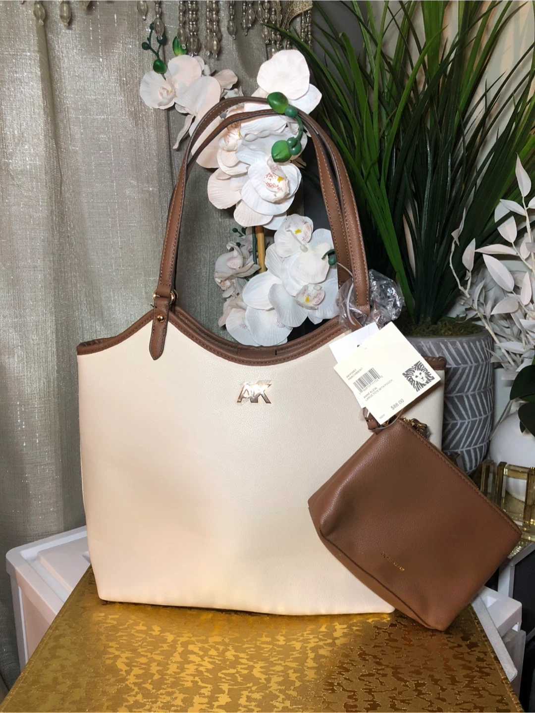 37This Anne Klein tote bag is brand new with tags and comes with a matching pouch! The bag features a cream-colored body with brown trim and handles. The original price was $88