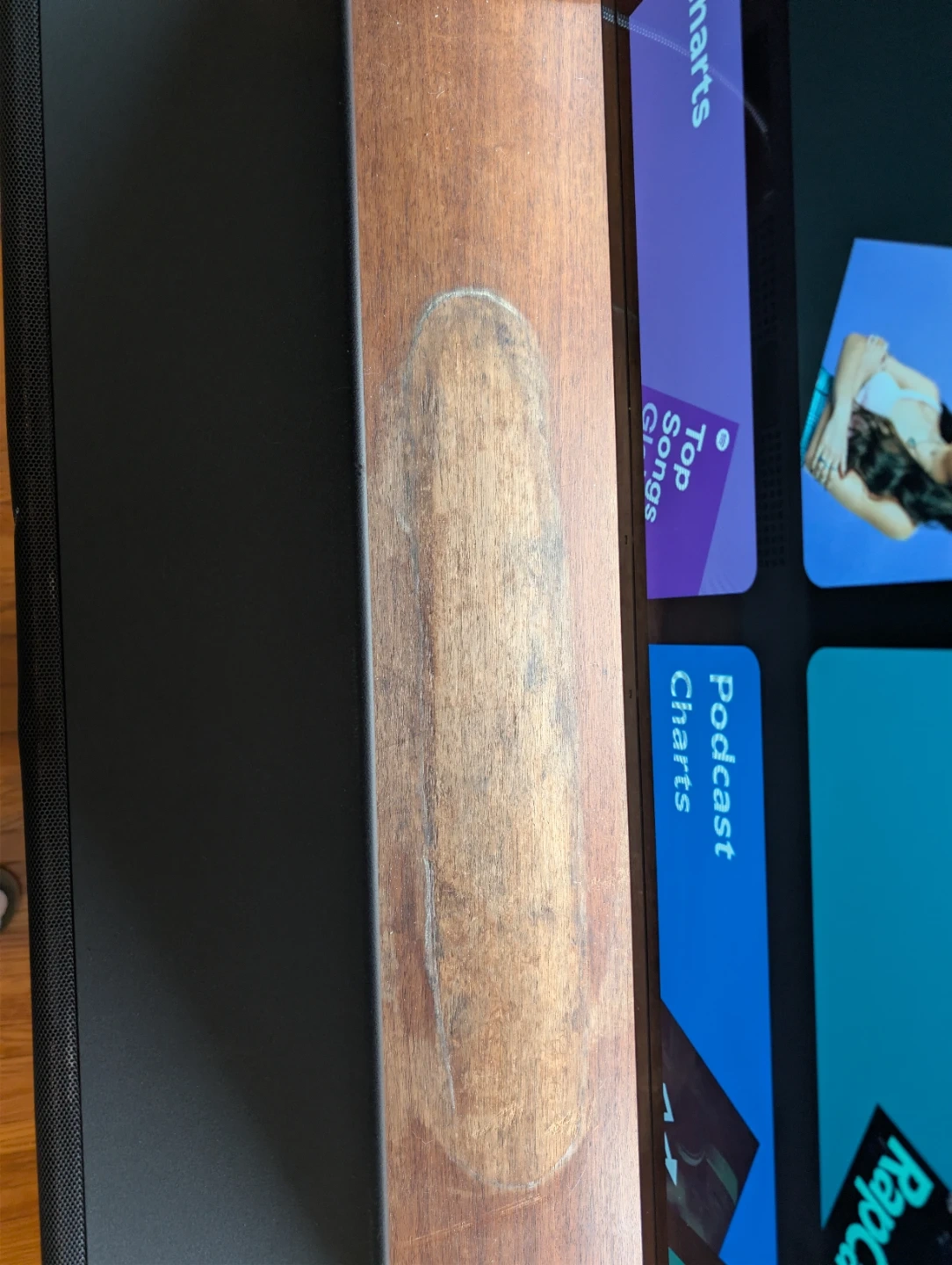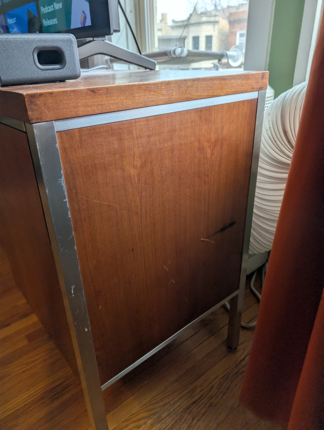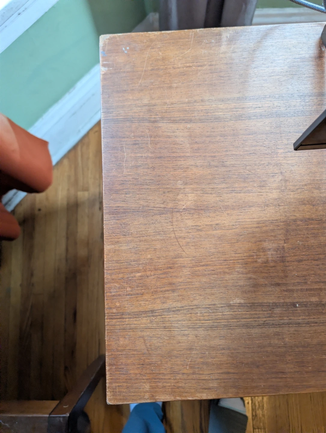 I took pictures so you can see there are some blemishes and there's a water stand on top which you could put a tablecloth over but I usually have the TV over and I never see the that area.