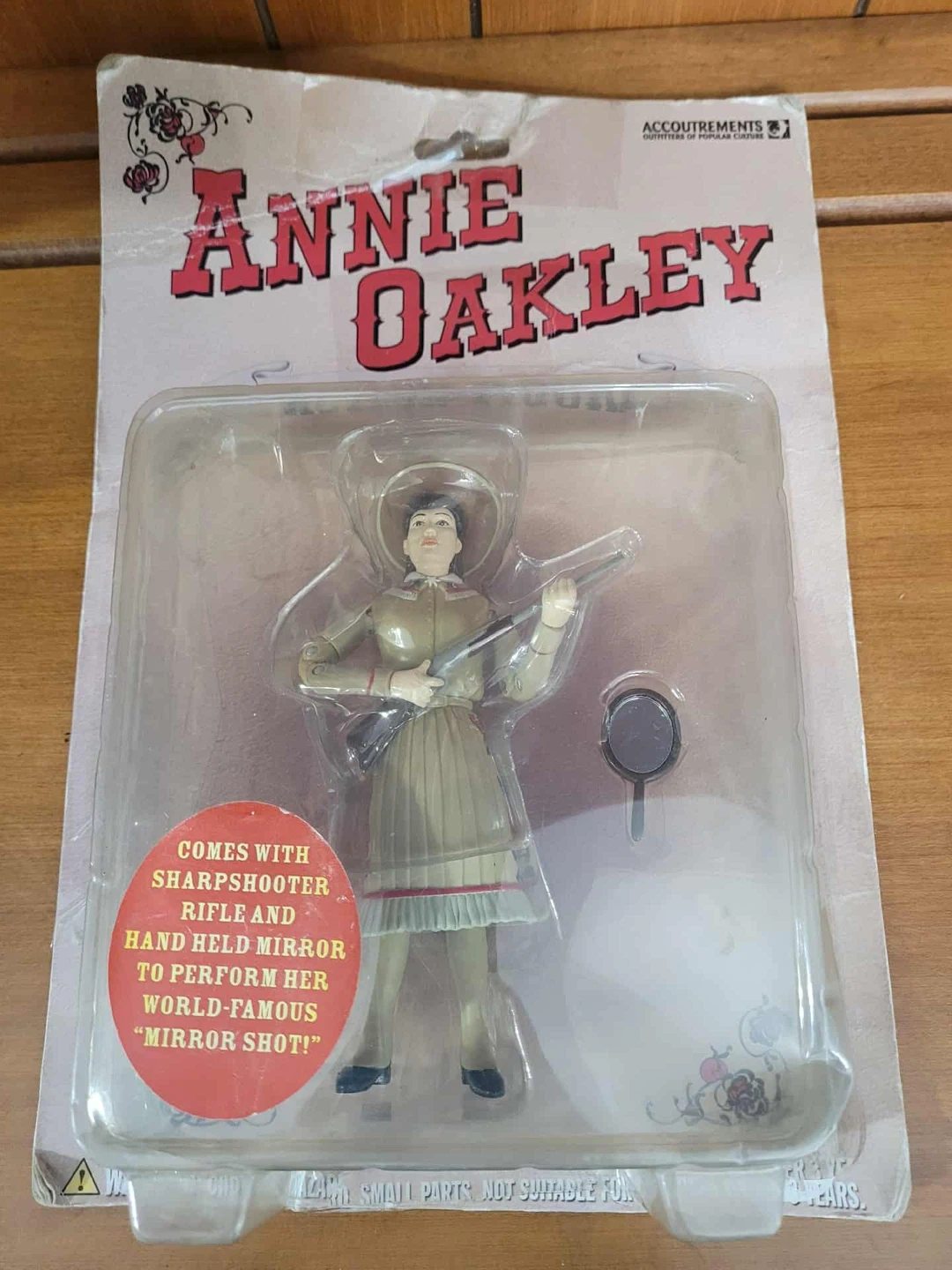 Annie Oakley action figure still in the original packaging! It comes with a sharpshooter rifle and a hand-held mirror so you can perform her world-famous "mirror shot"!