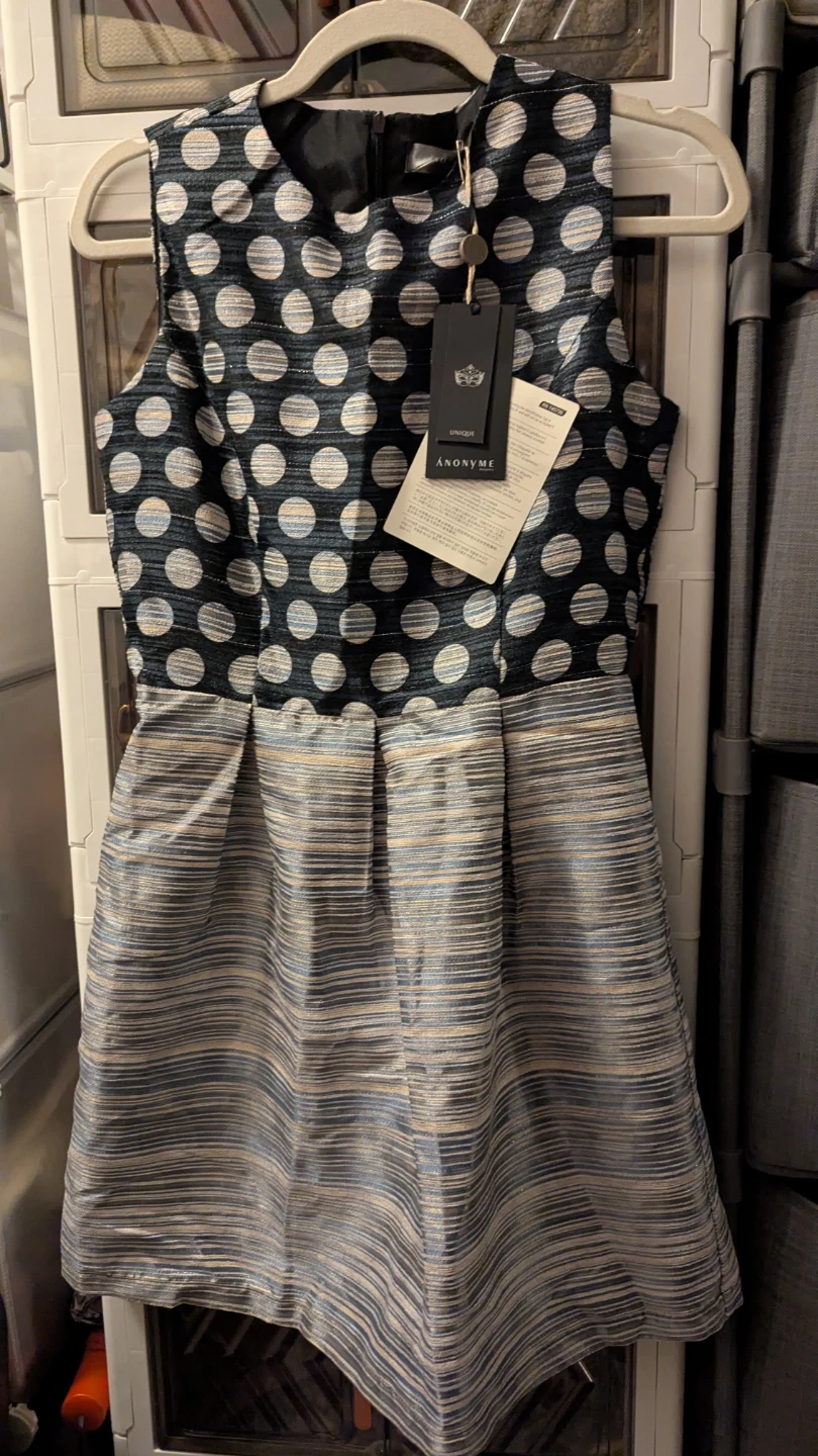 231This ANONYME Design dress features a unique combination of polka dots on the top and striped pattern on the bottom. It's in great condition and ready for a new home! Perfect for a special occasion or a stylish day out