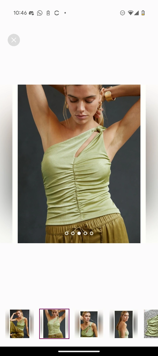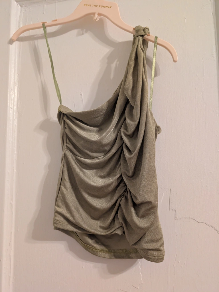 Selling a cute one-shoulder top. The material is 98% polyester and 2% elastane. It's a stylish piece in a lovely green color, perfect for adding a touch of elegance to your wardrobe
