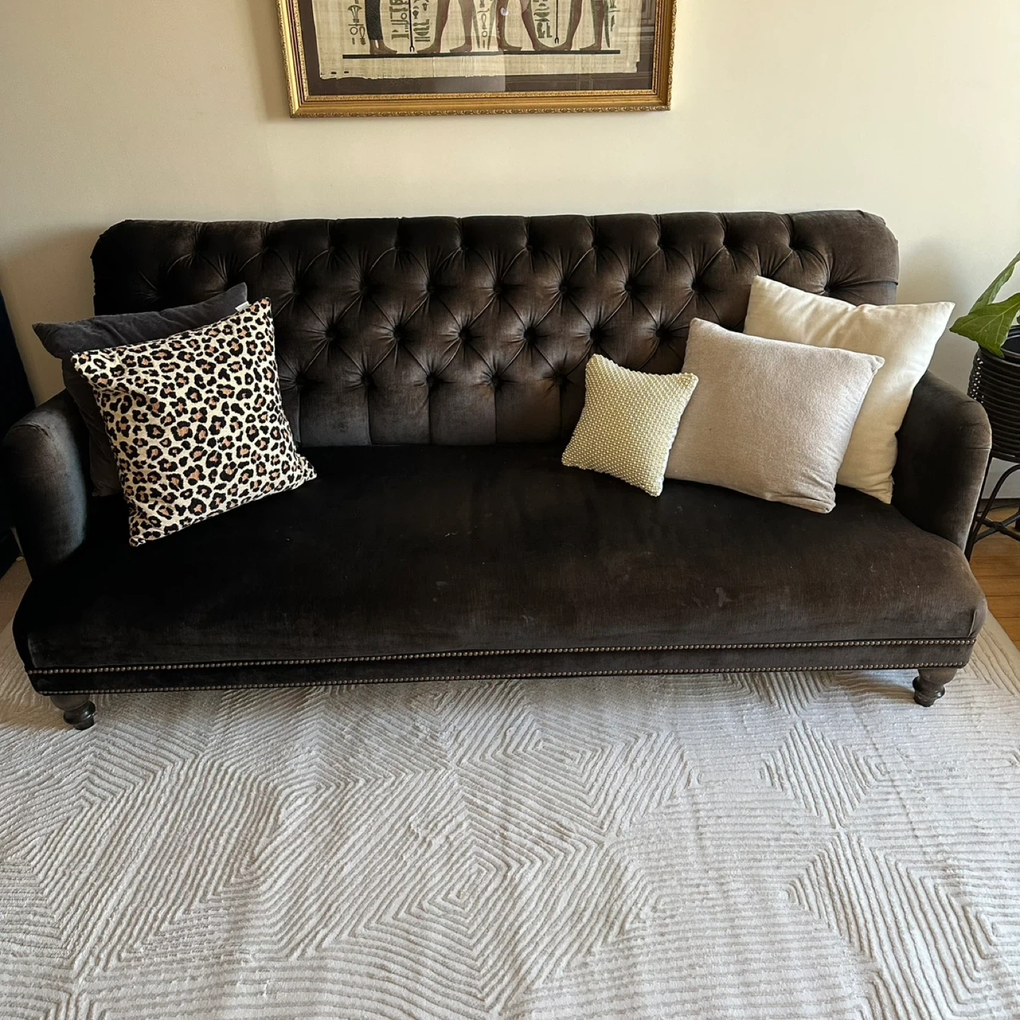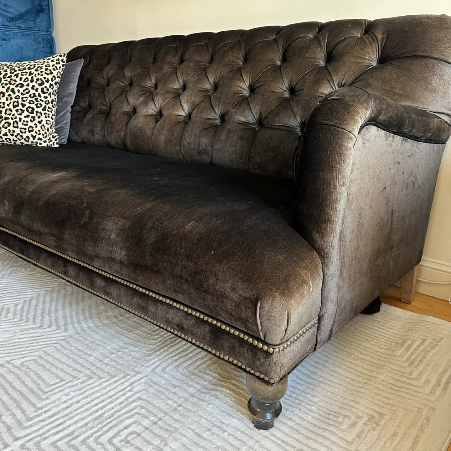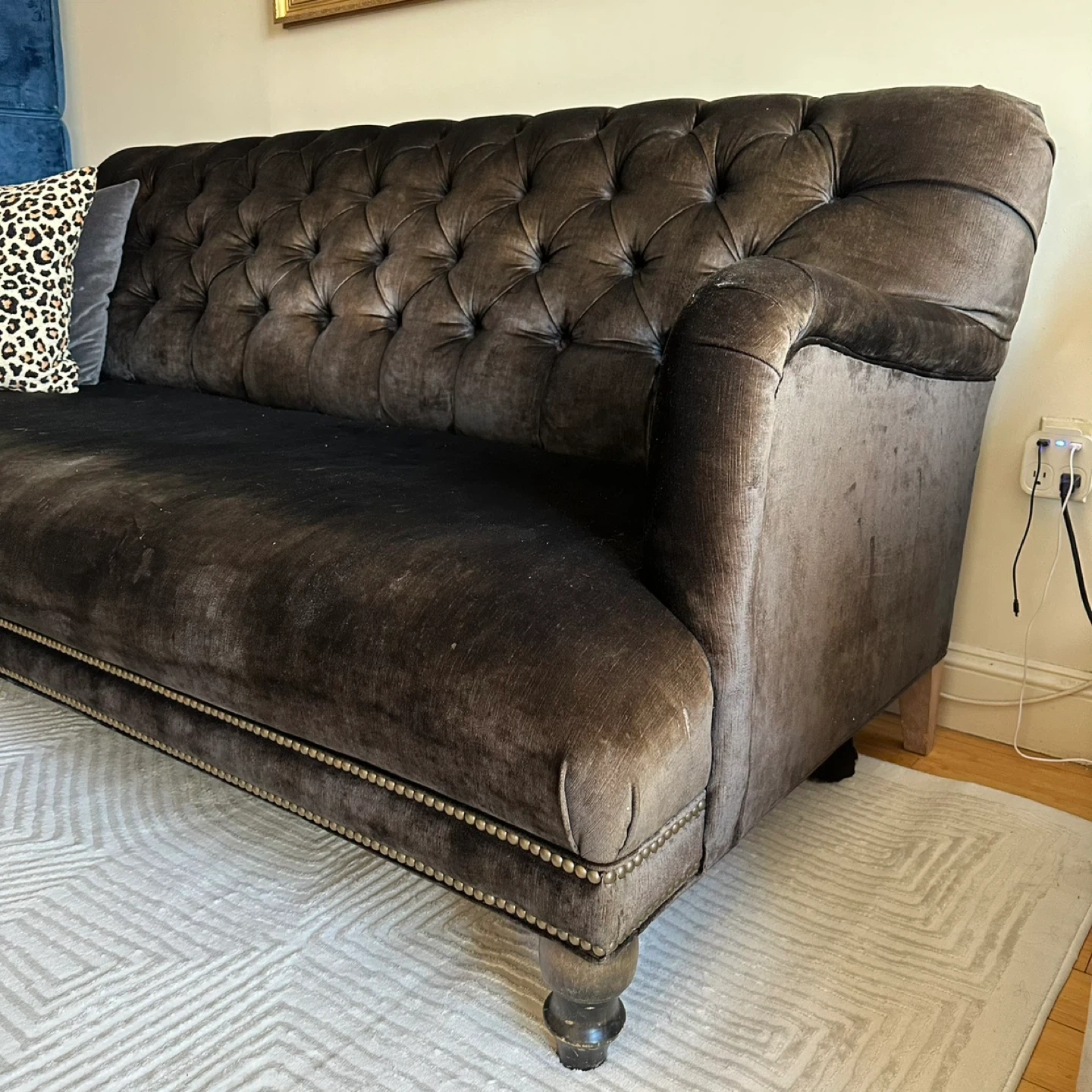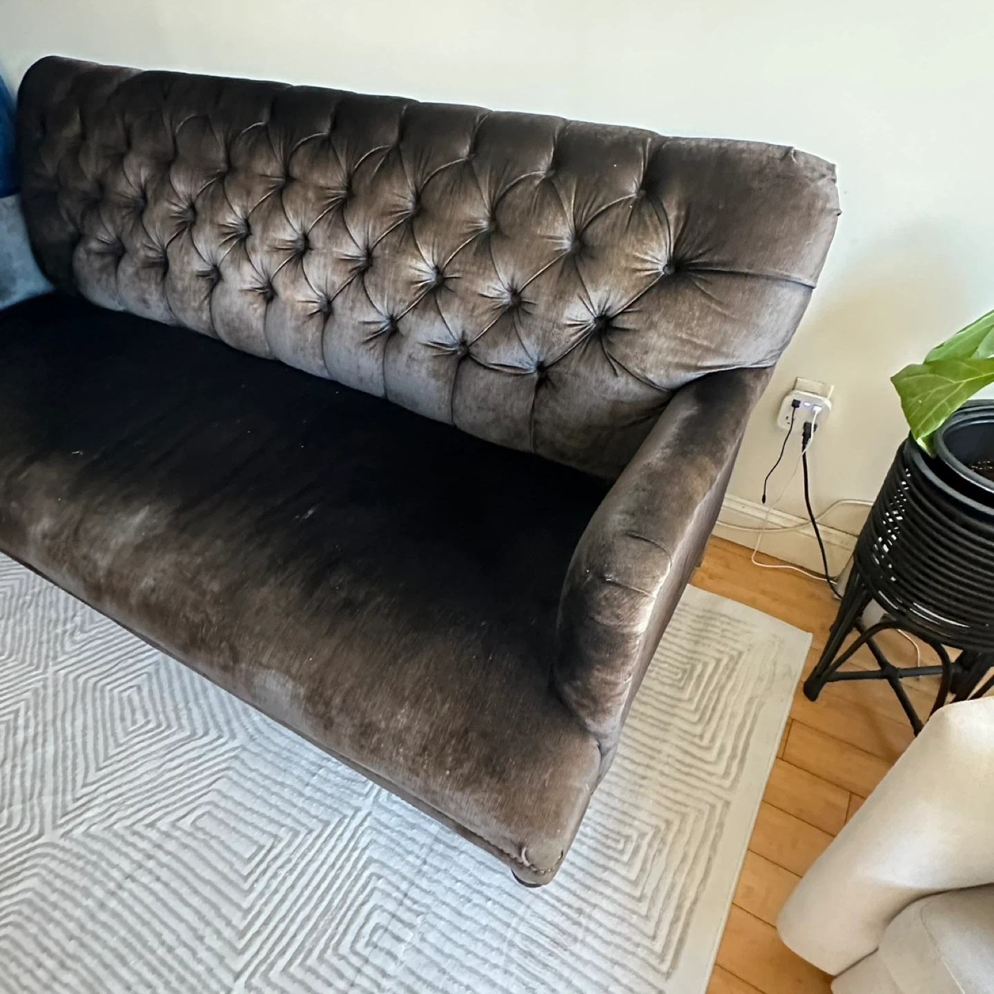 Selling a tufted brown velvet sofa from Anthropology. It's a stylish piece that could really tie a room together! The couch shows some sun damage, it was darker but this adds to its classic vintage look.