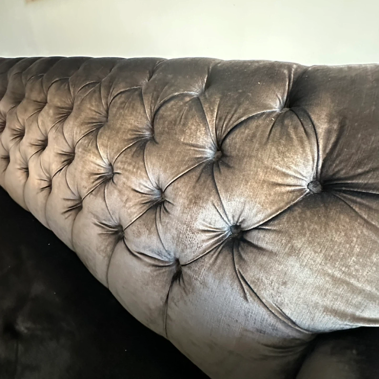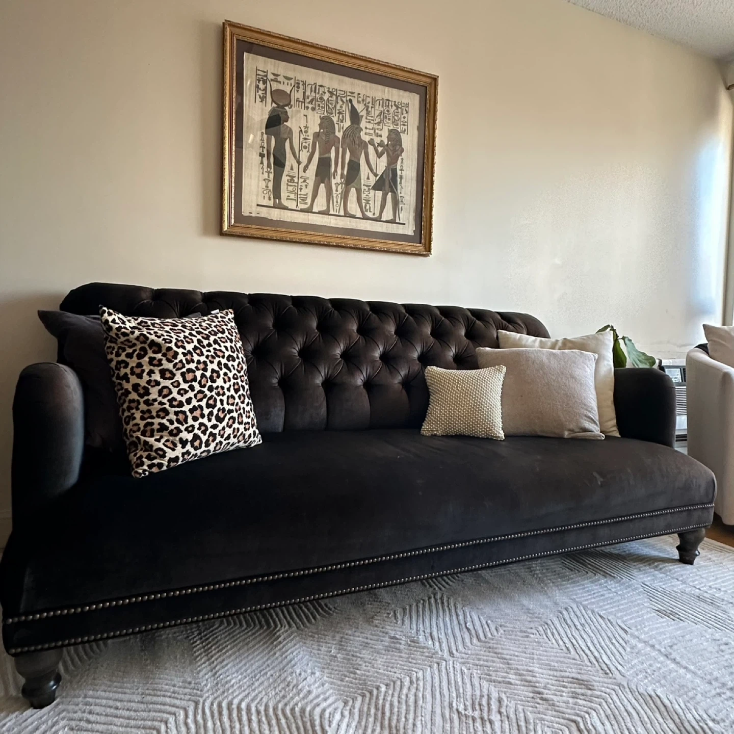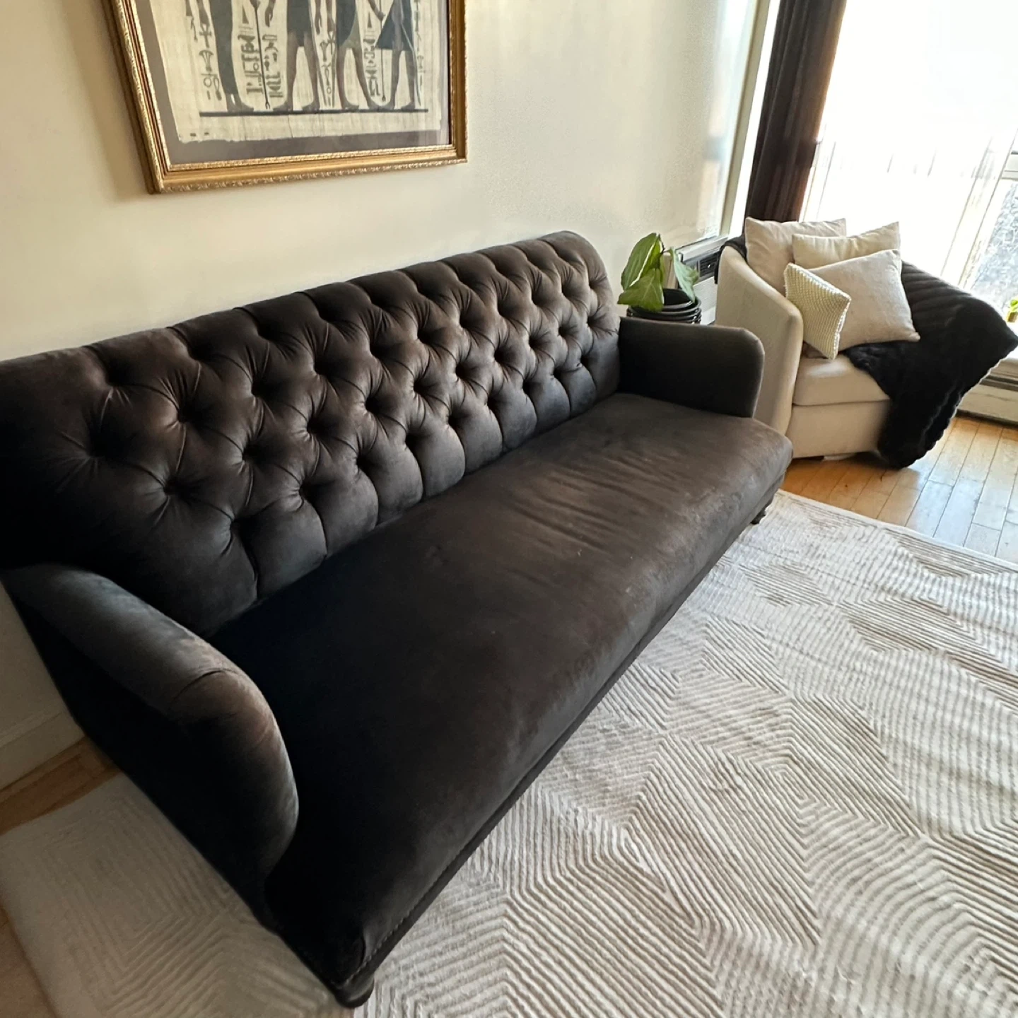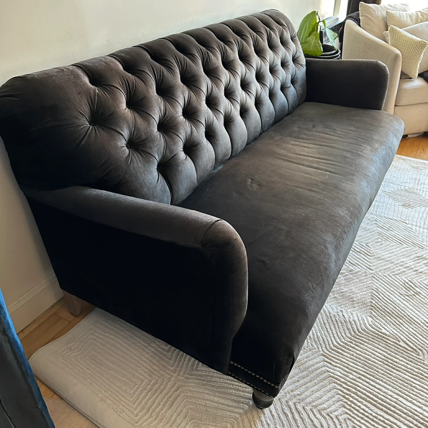 Selling a tufted brown velvet sofa from Anthropology. It's a stylish piece that could really tie a room together! The couch shows some sun damage, it was darker but this adds to its classic vintage look.