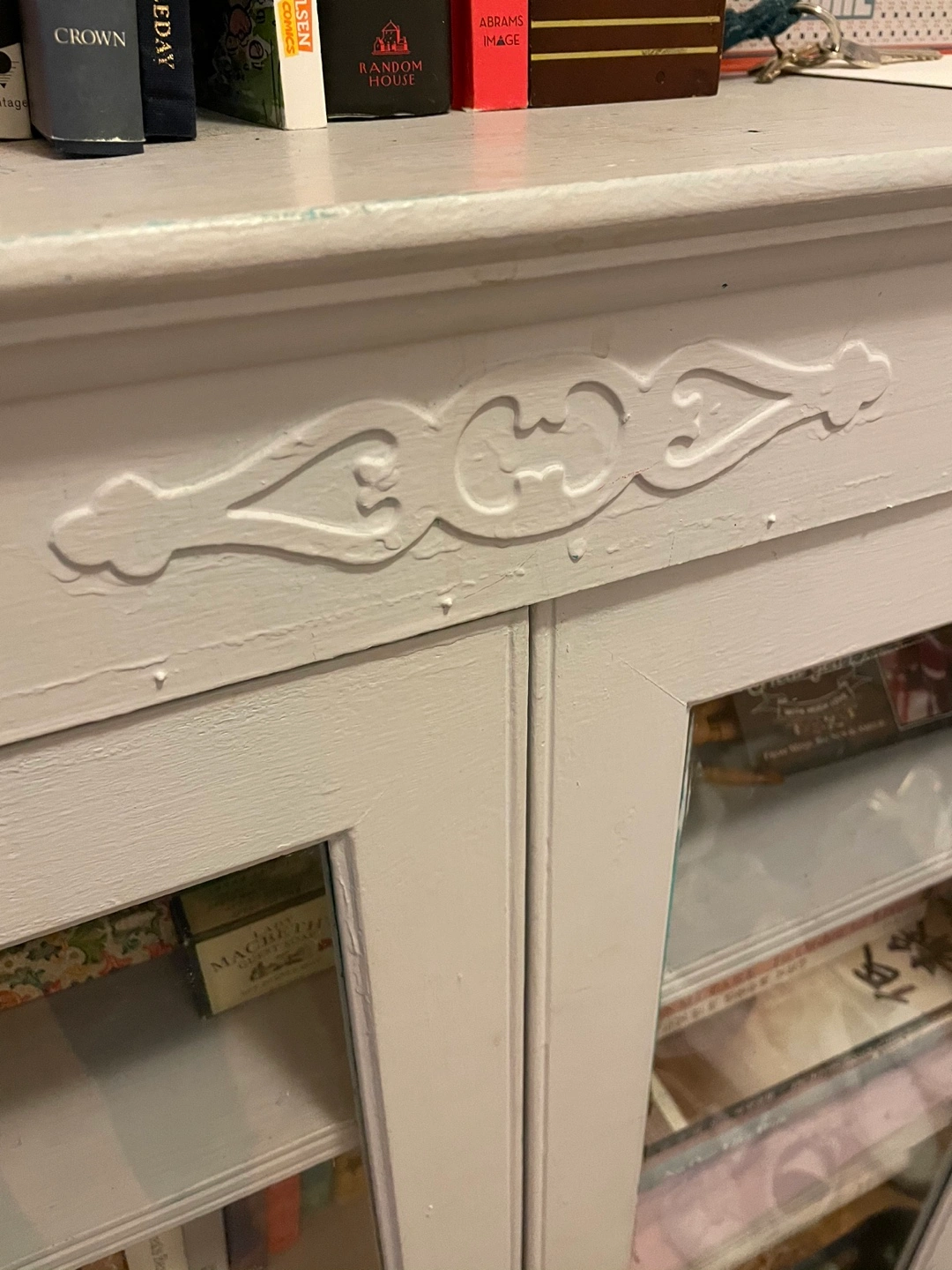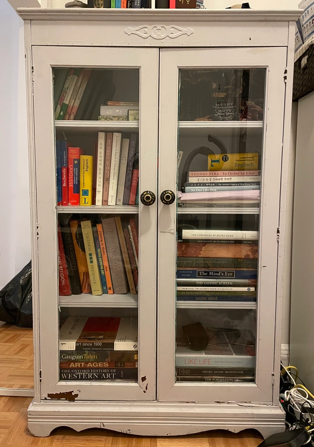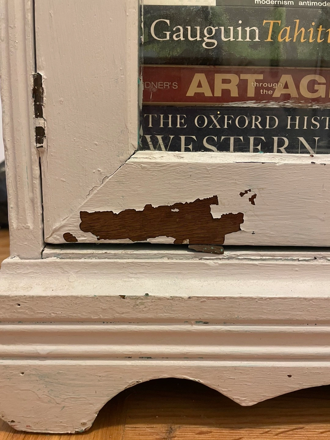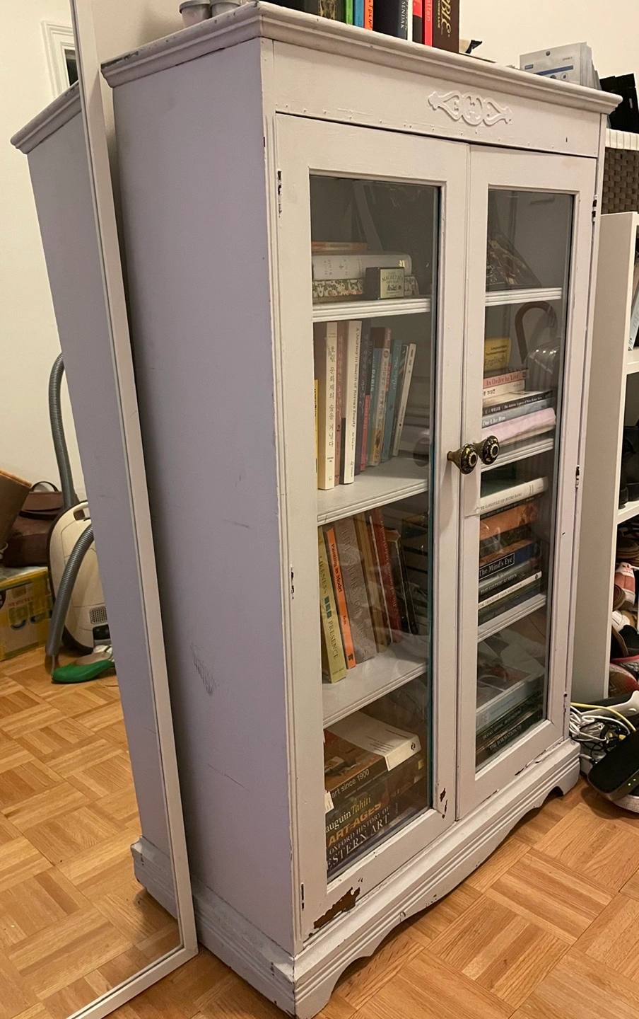 76Beloved antique bookcase or display case with double glass doors. Knobs are removable and replaceable with others that you like. Original wood is pictured showing through the chipped paint at bottom (I had repainted it and never bothered to go back to paint that portion) 48”H x 30”L x 11”D