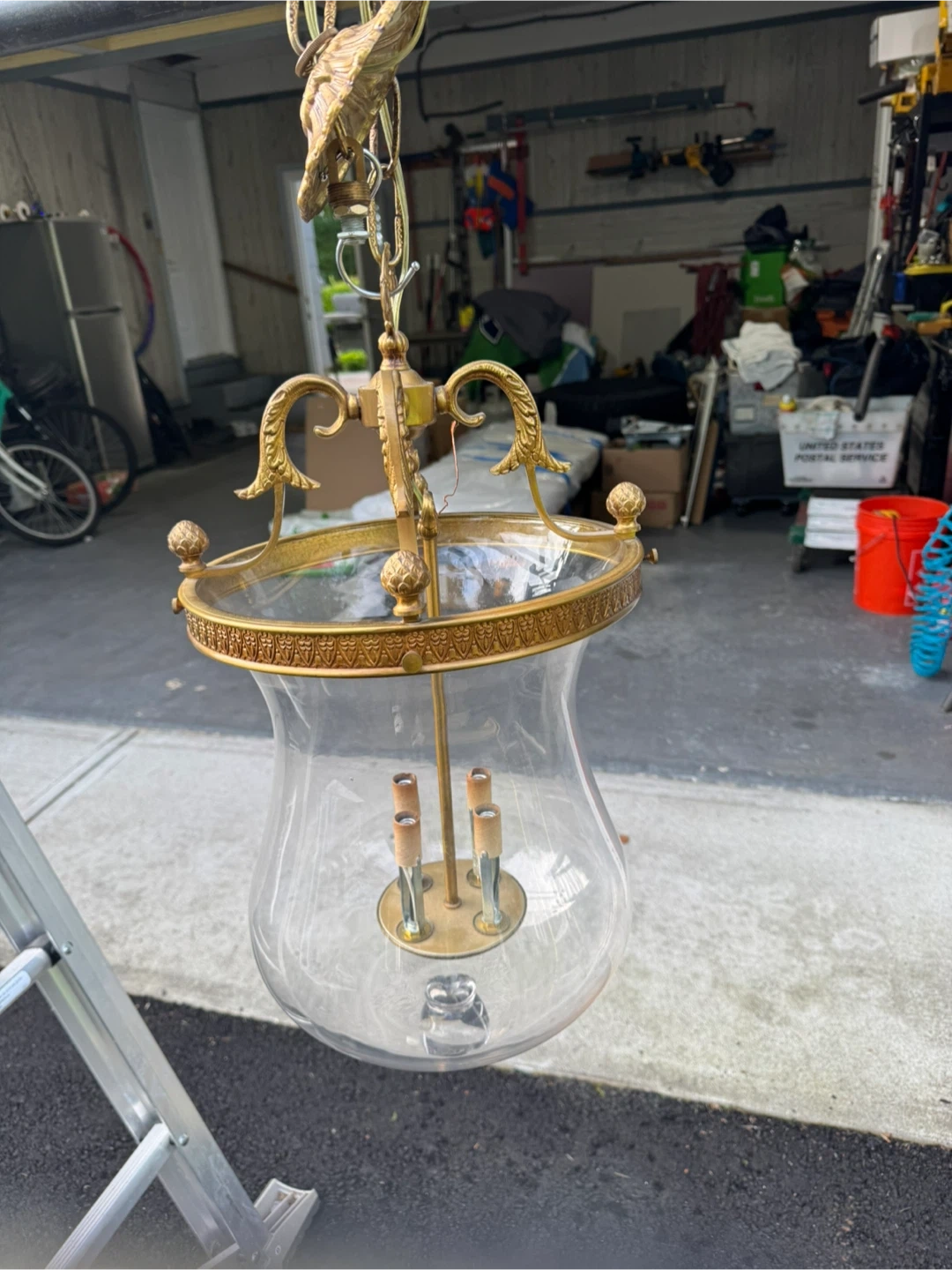 Selling a beautiful antique-style pendant light. It features a brass finish with a clear glass shade. It would add a touch of elegance to any room!