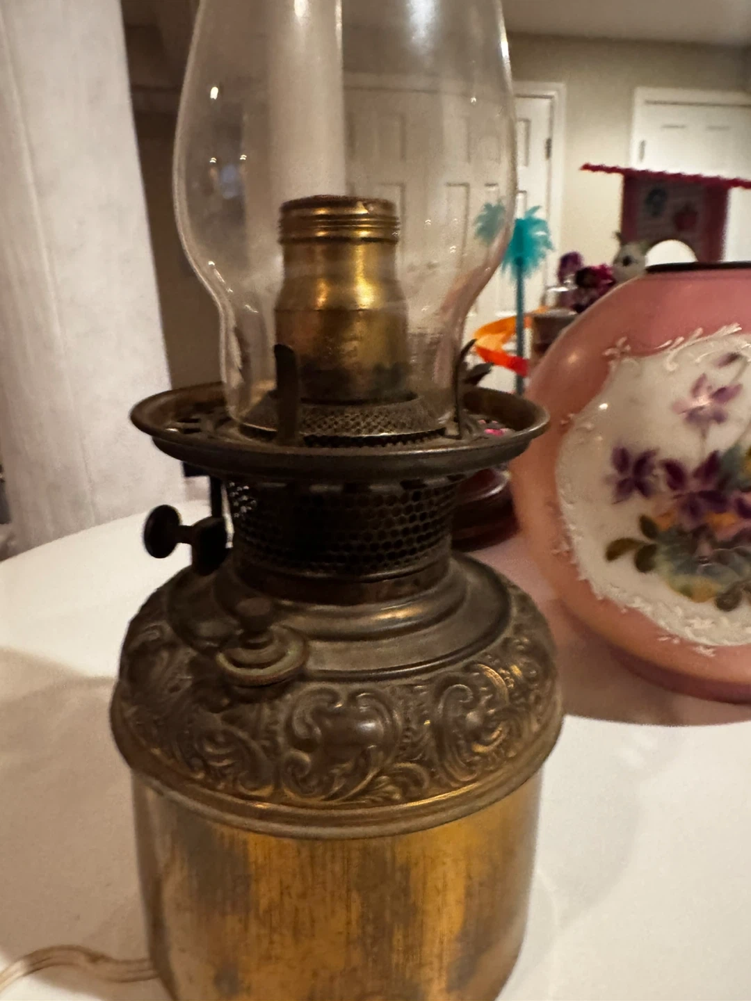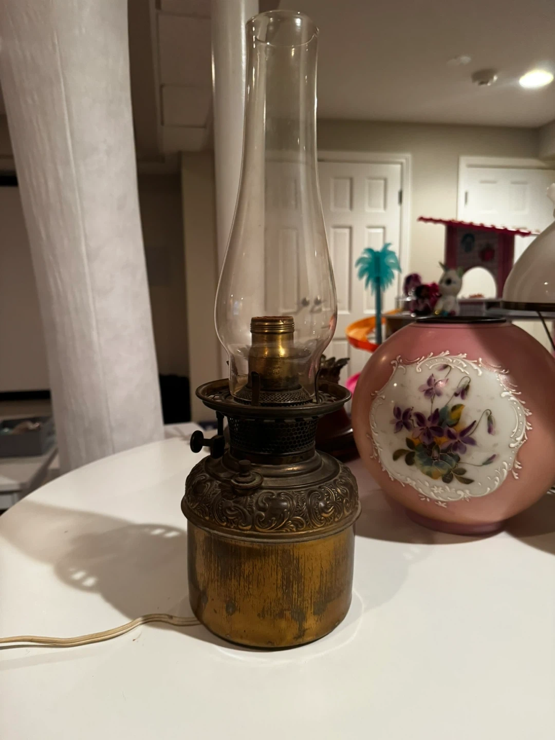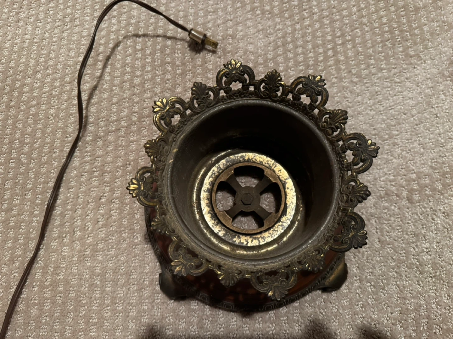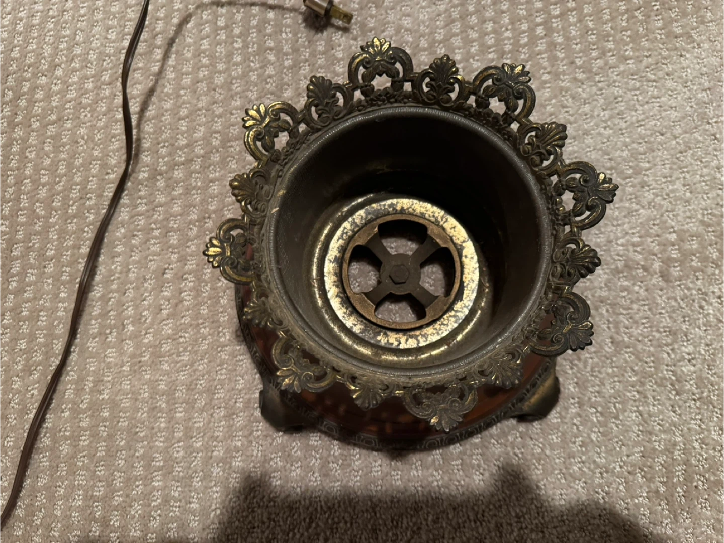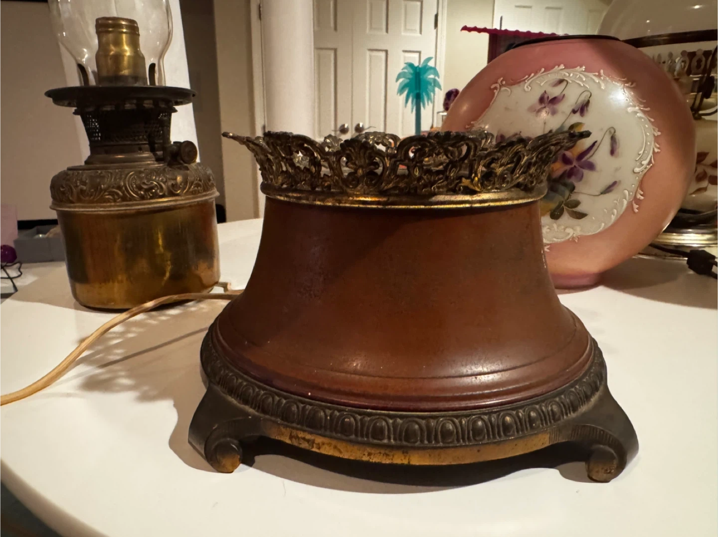 Selling an antique Hurricane lamp with a brown and gold finish. It has an ornate design and a unique look. It's in good condition for its age (100 years) and would make a nice addition to any room