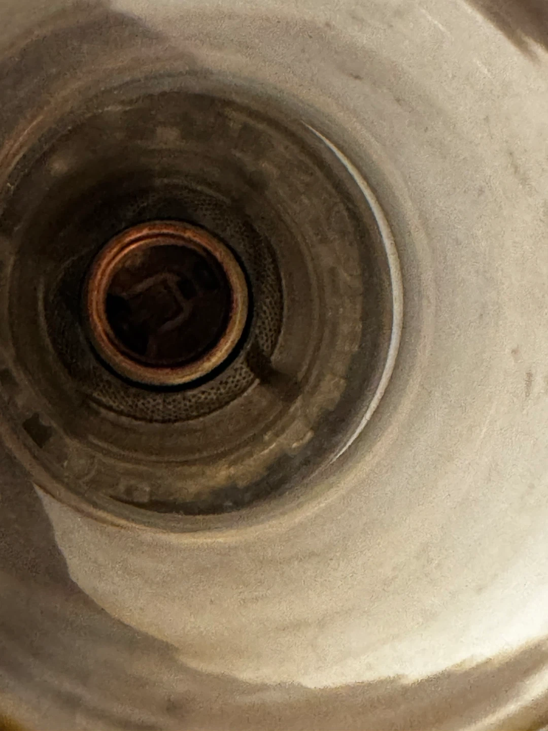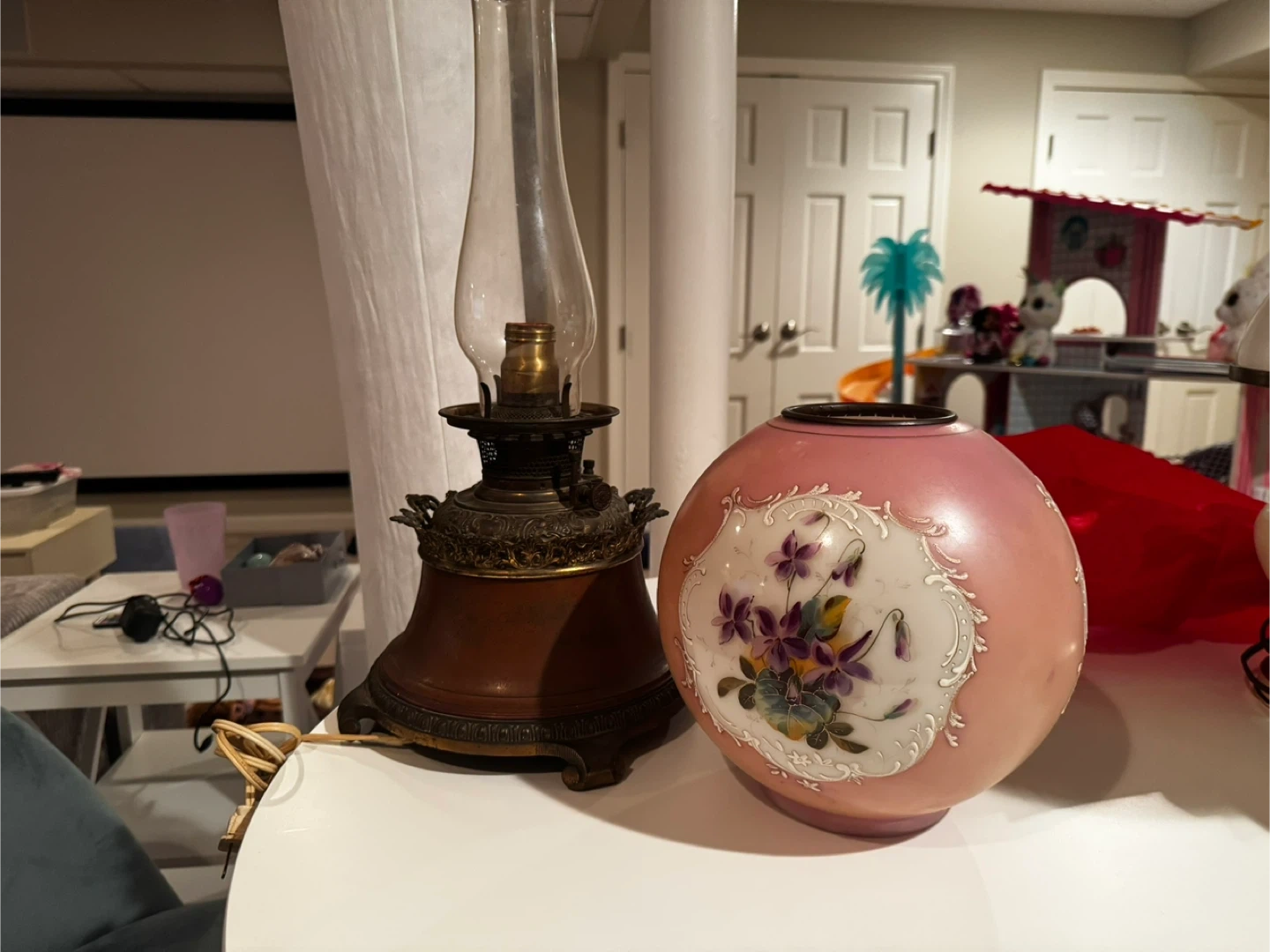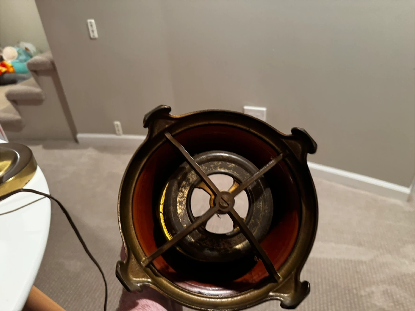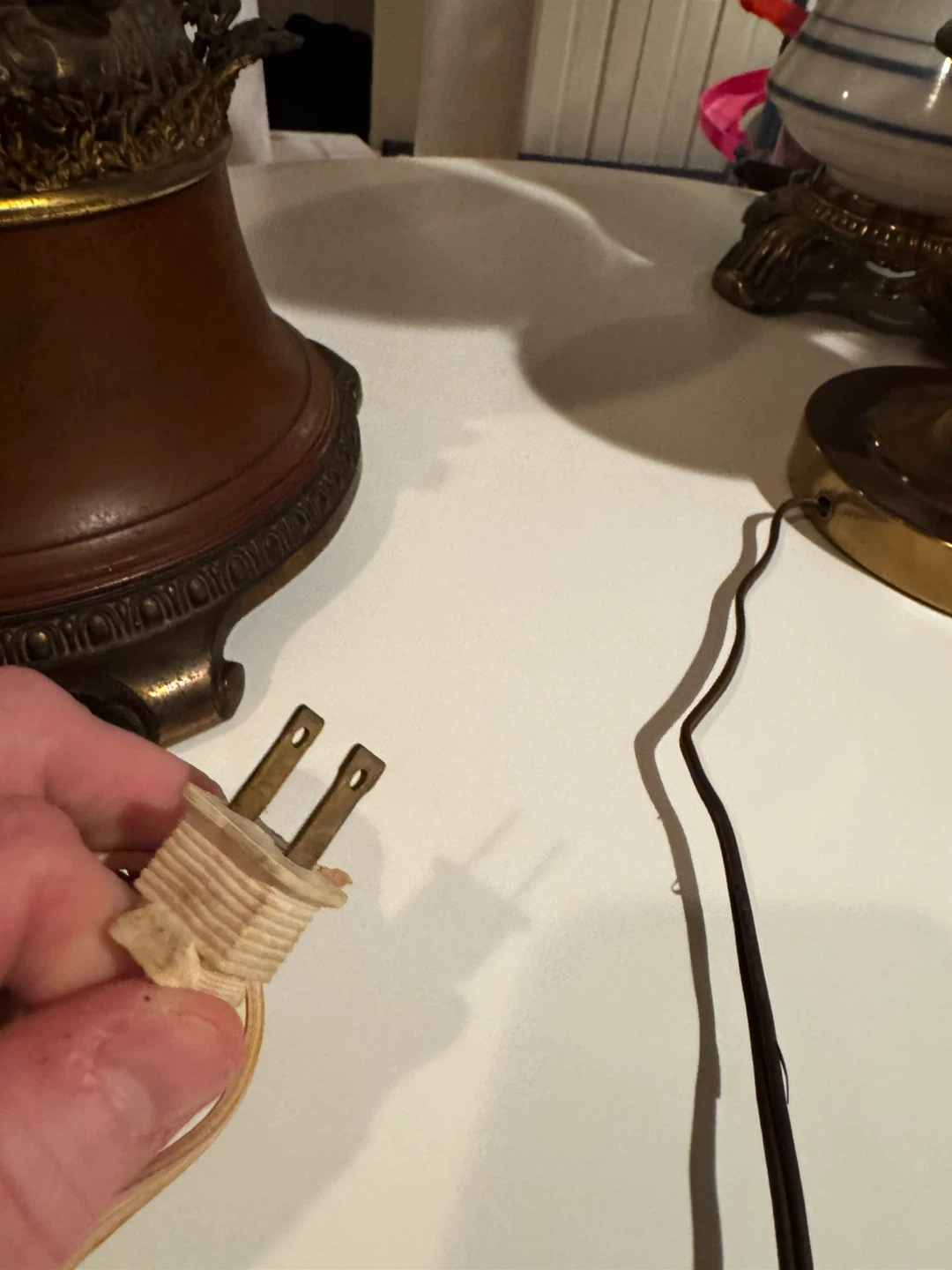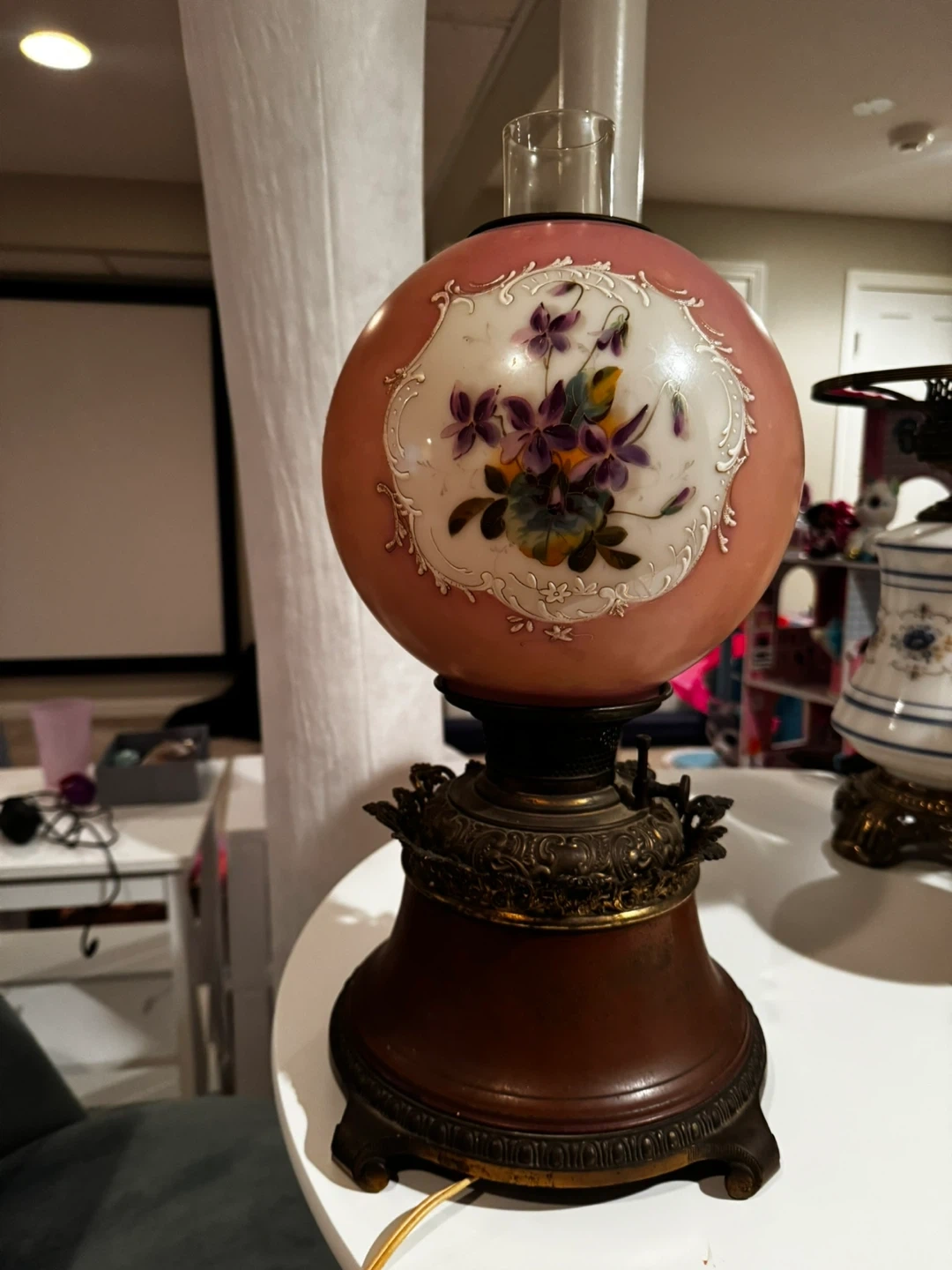 Selling an antique Hurricane lamp with a brown and gold finish. It has an ornate design and a unique look. It's in good condition for its age (100 years) and would make a nice addition to any room