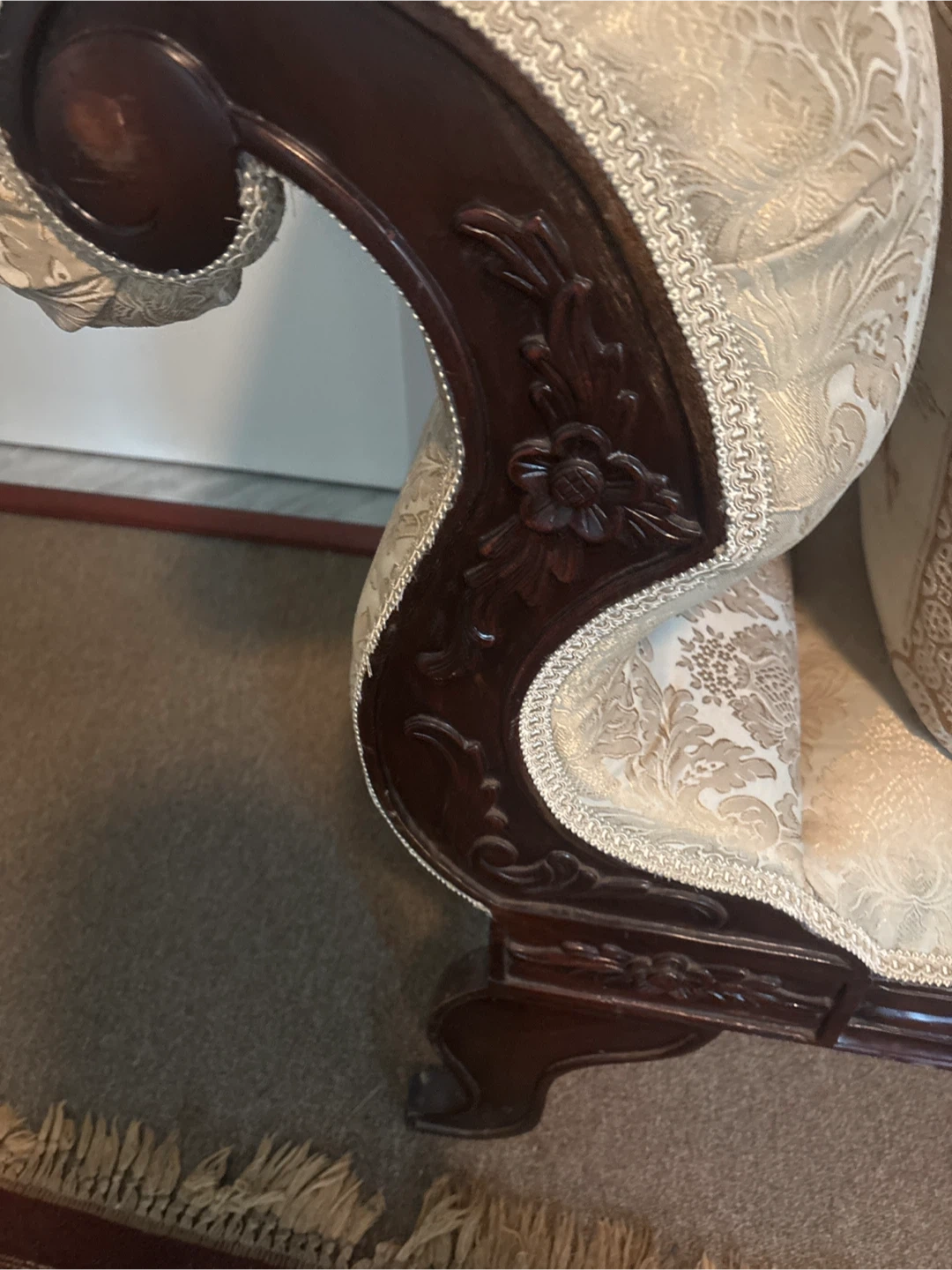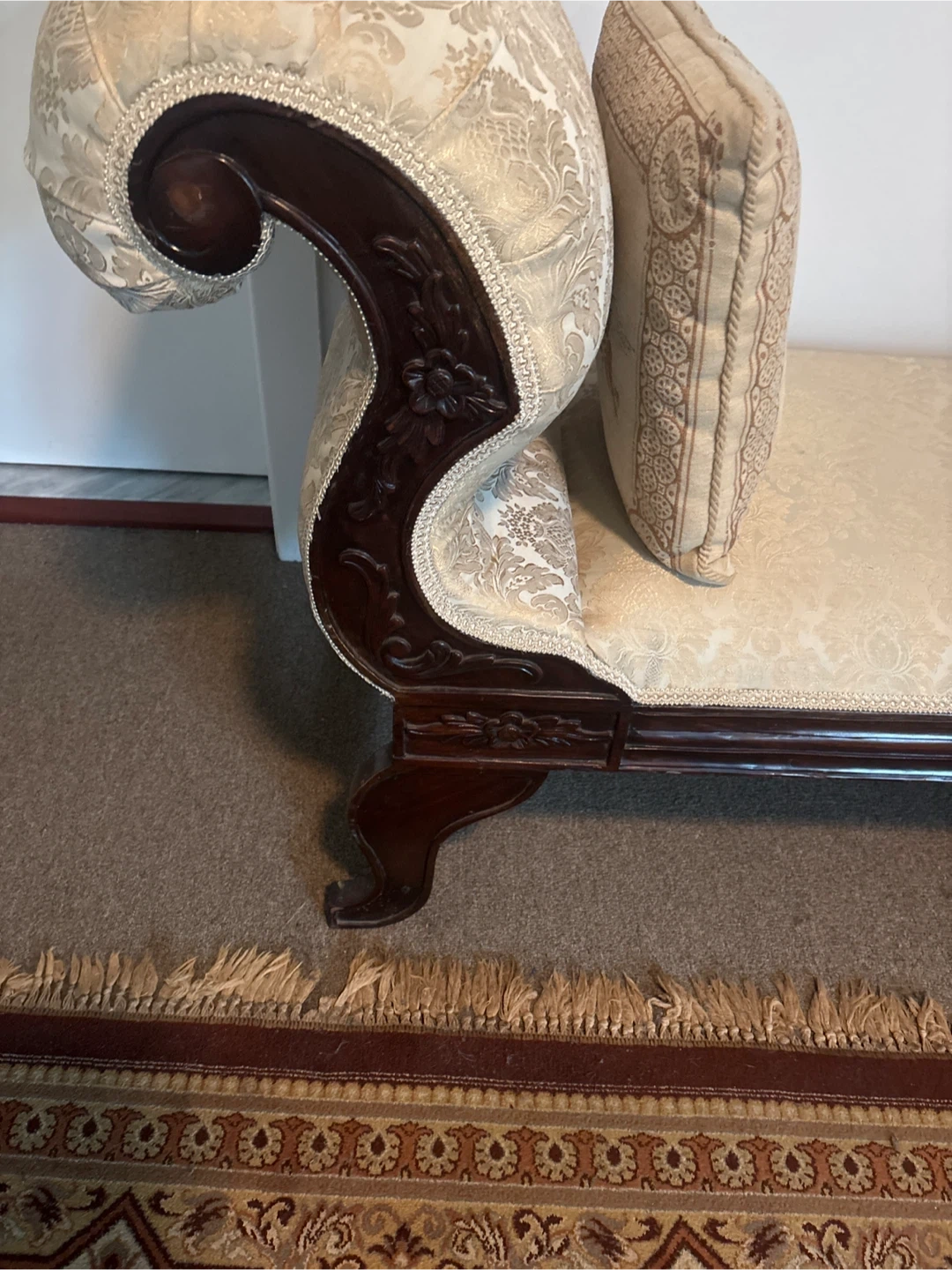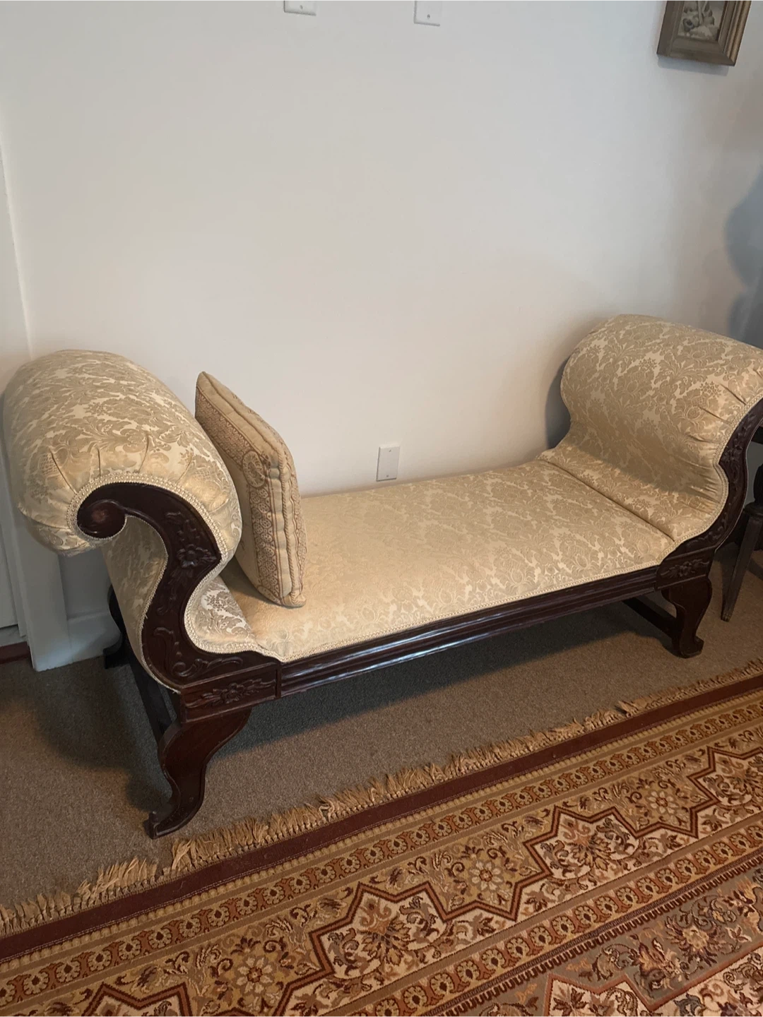 Selling a beautiful antique carved Settee bench with a vintage look! It has a dark wood frame with ornate carvings and a cream/ beige colored classic patterned fabric. Perfect for adding a touch of elegance to any room