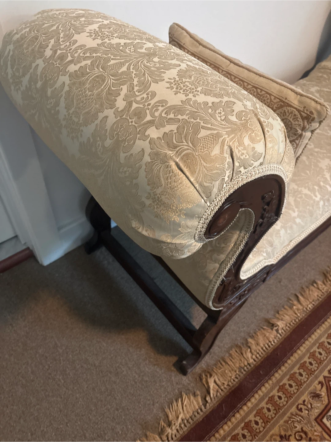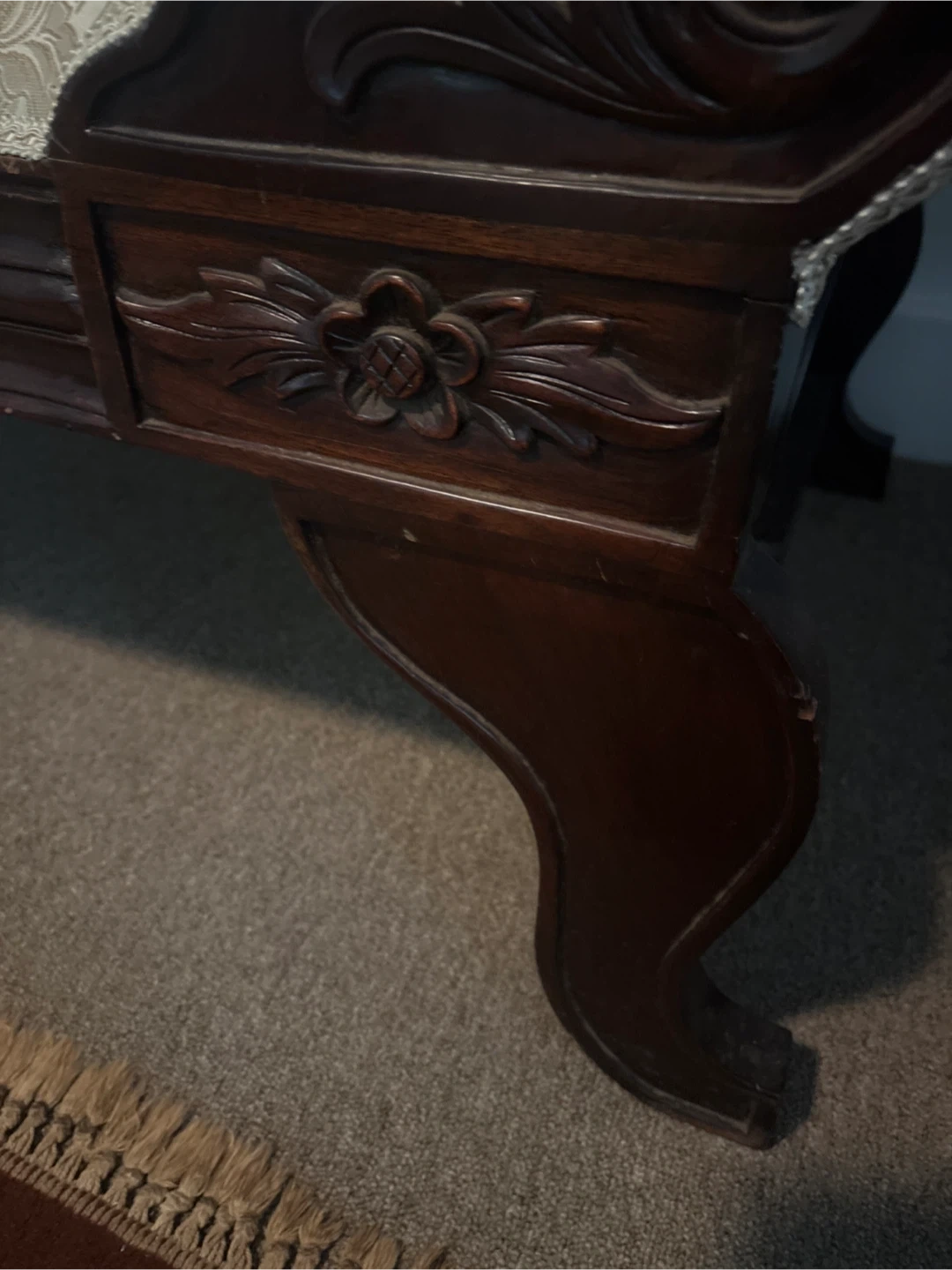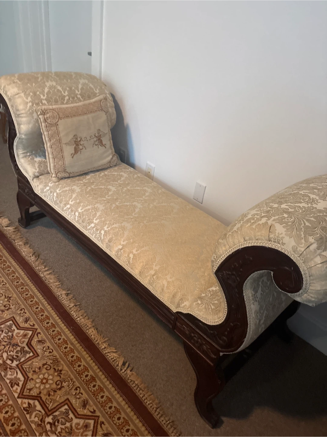 Selling a beautiful antique carved Settee bench with a vintage look! It has a dark wood frame with ornate carvings and a cream/ beige colored classic patterned fabric. Perfect for adding a touch of elegance to any room
