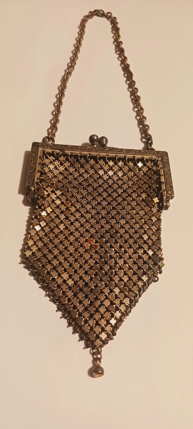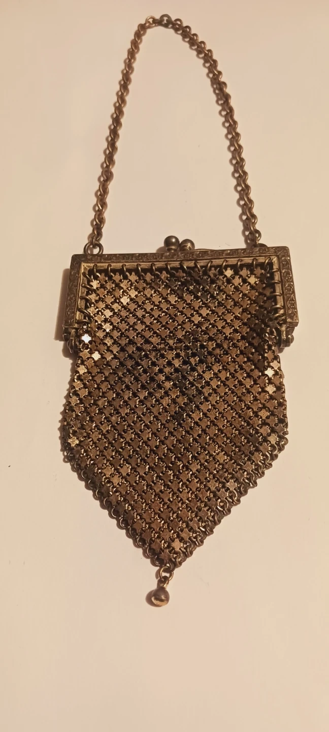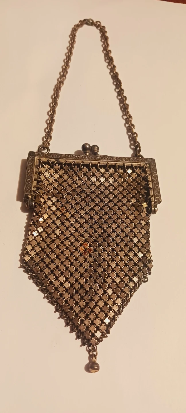 1000+Antique Edwardian Small Metal Mesh Coin Purse. It has a unique design and a chain strap. The purse shows some signs of wear consistent with its age, adding to its antique charm. ALL MY PRICES ARE NEGOTIABLE !!