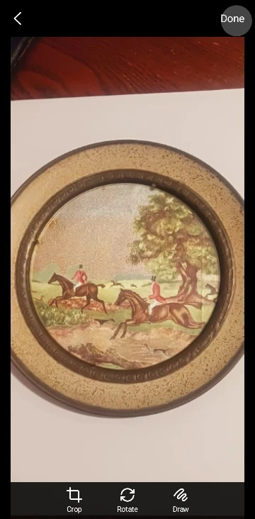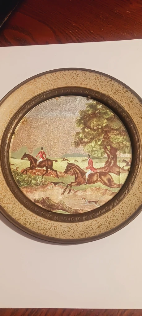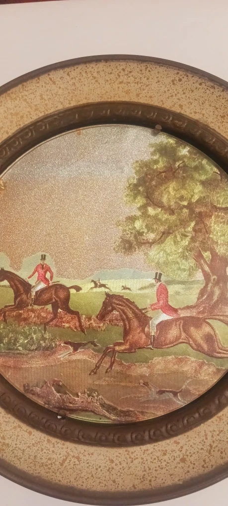 1000+Selling an antique English decorative tin plate featuring a horse racing scene. It is hand painted on the glass and attached to the metal tin frame.It's in good condition and would make a nice addition to any collection or home decor. Good vintage condition. 7.5" diameter. MADE IN ENGLAND. ALL MY PRICES ARE NEGOTIABLE !!