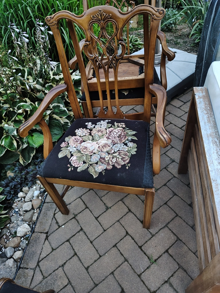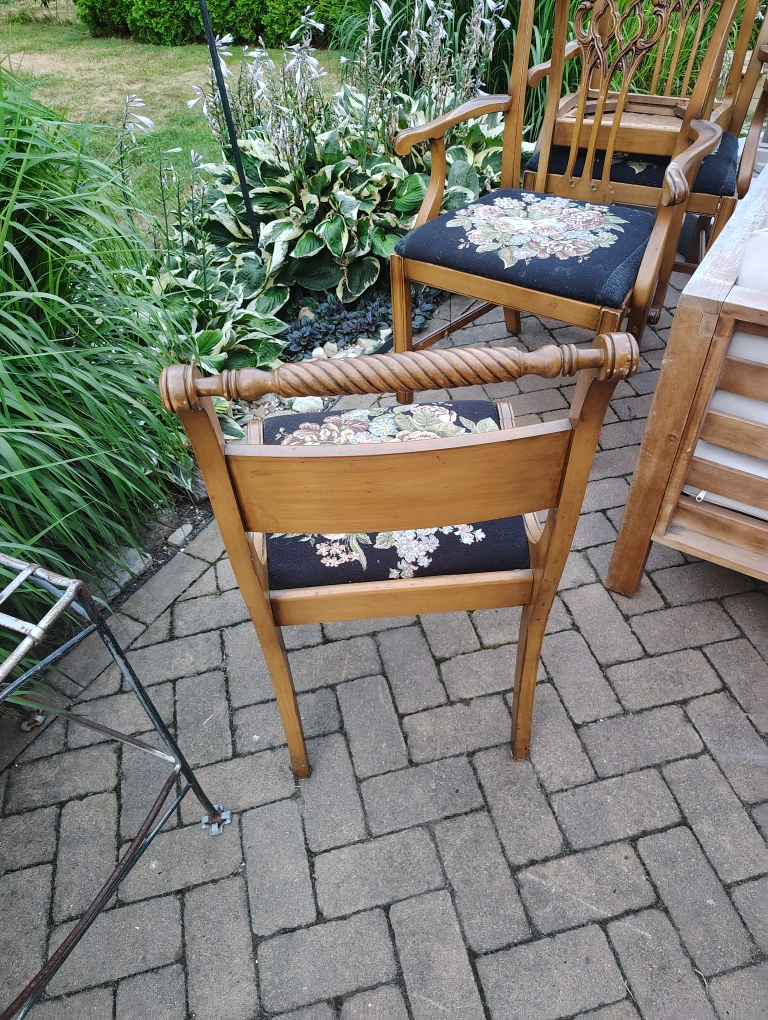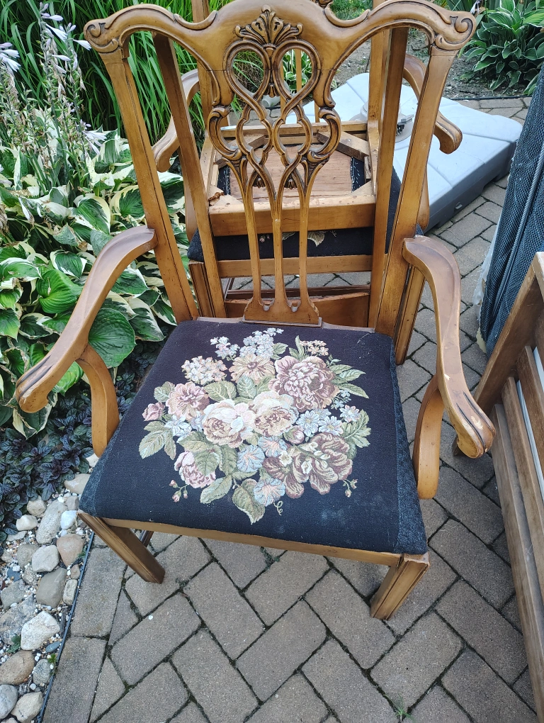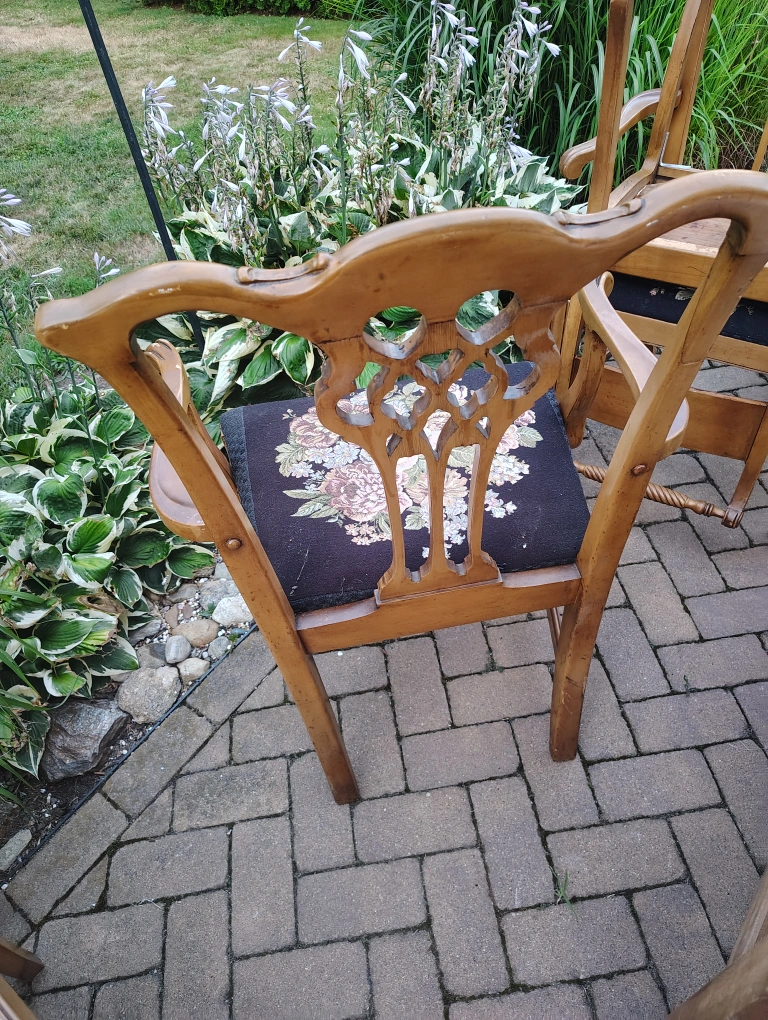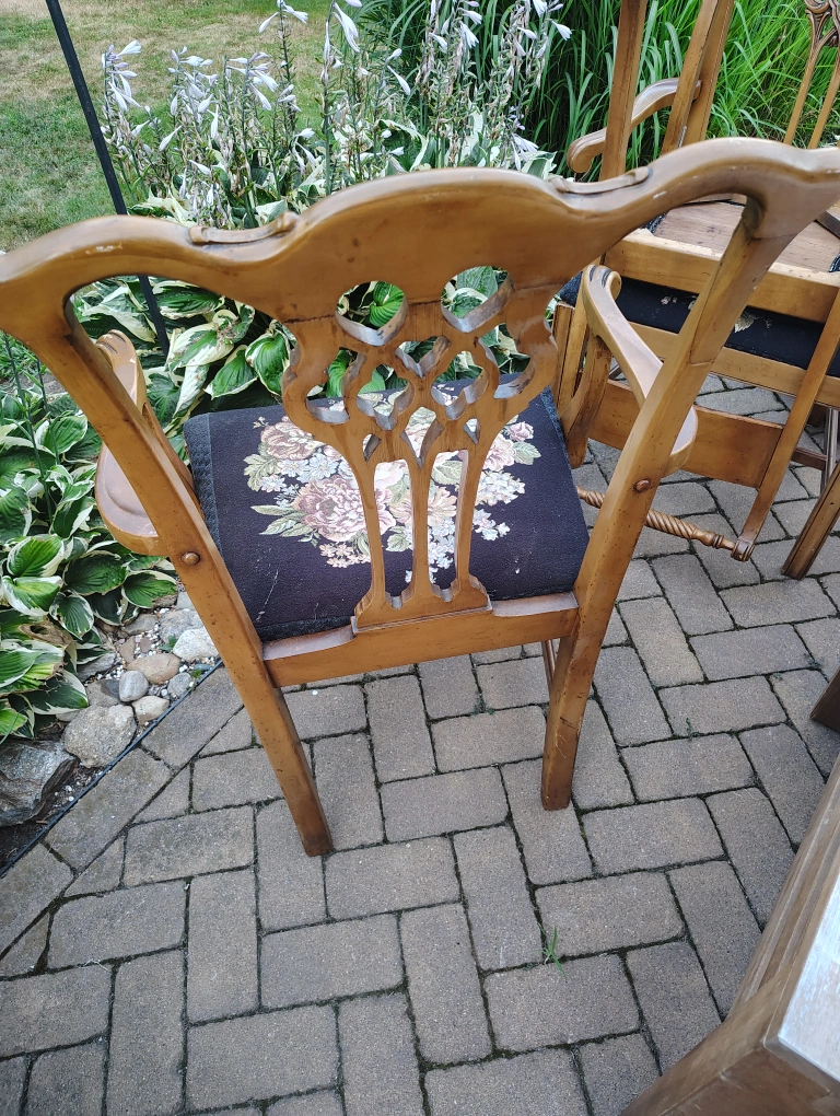 65I'm selling a set of four antique dining chairs! They feature a beautiful floral upholstery on the seats and a classic wooden frame. These chairs would add a touch of vintage charm to any dining room. They are in good condition for their age!