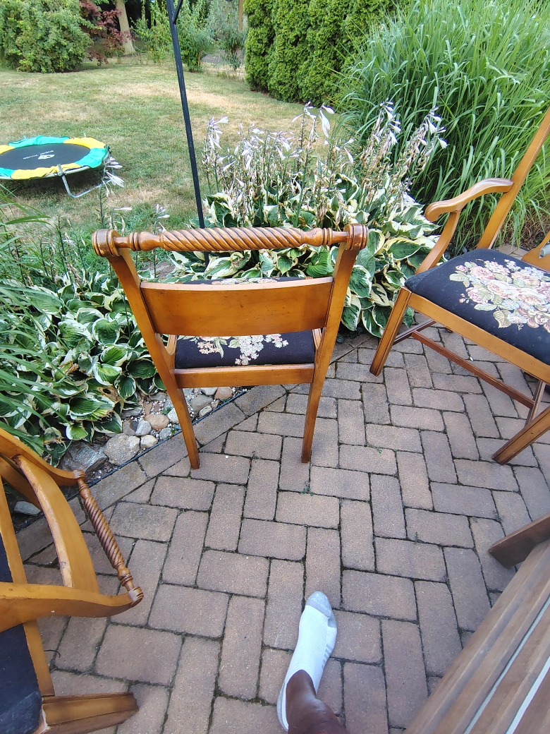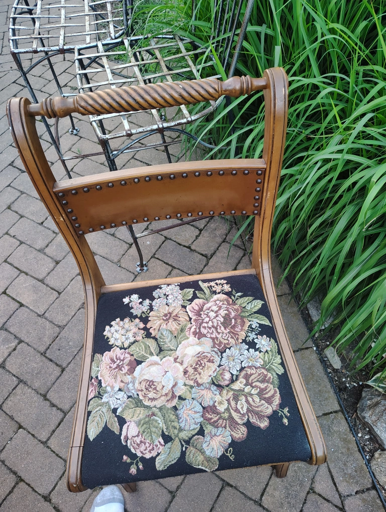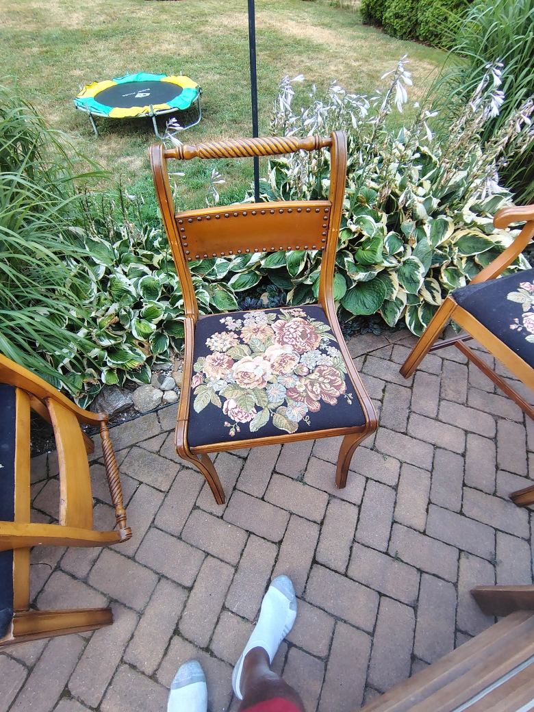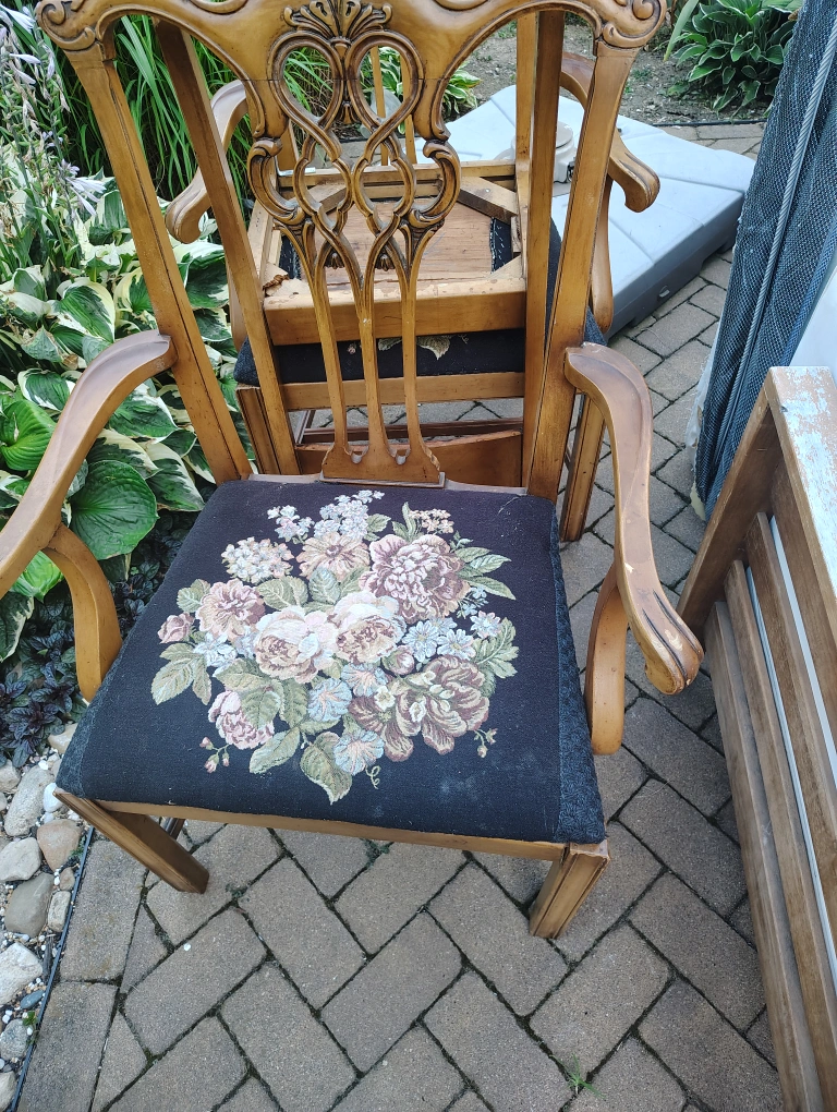 65I'm selling a set of four antique dining chairs! They feature a beautiful floral upholstery on the seats and a classic wooden frame. These chairs would add a touch of vintage charm to any dining room. They are in good condition for their age!