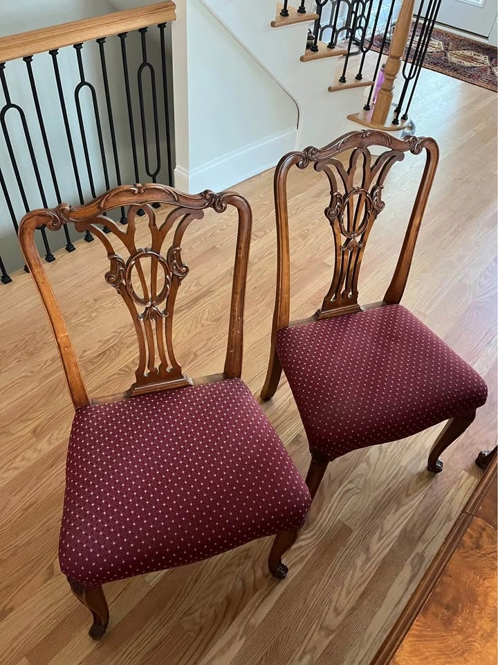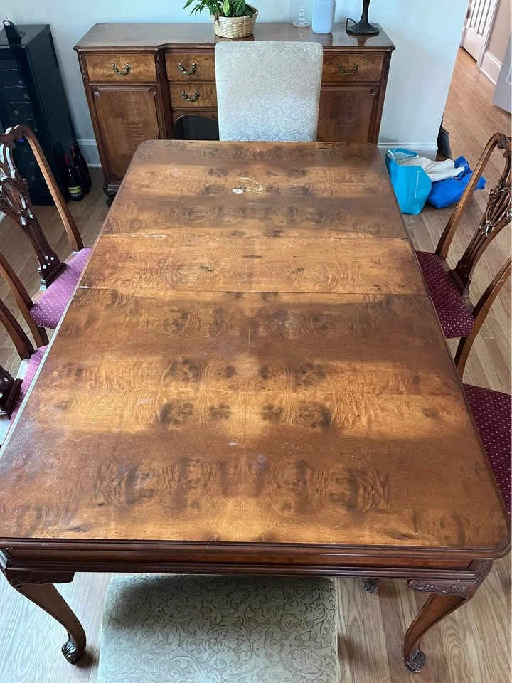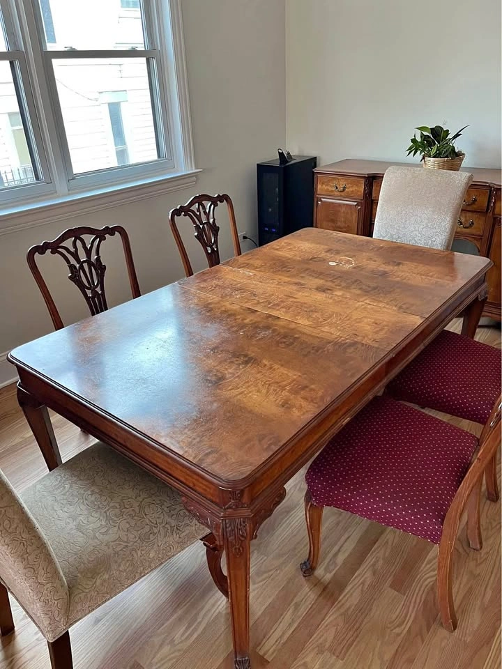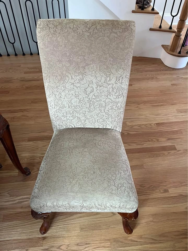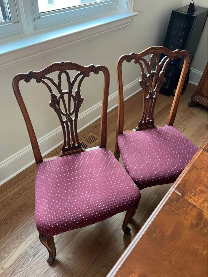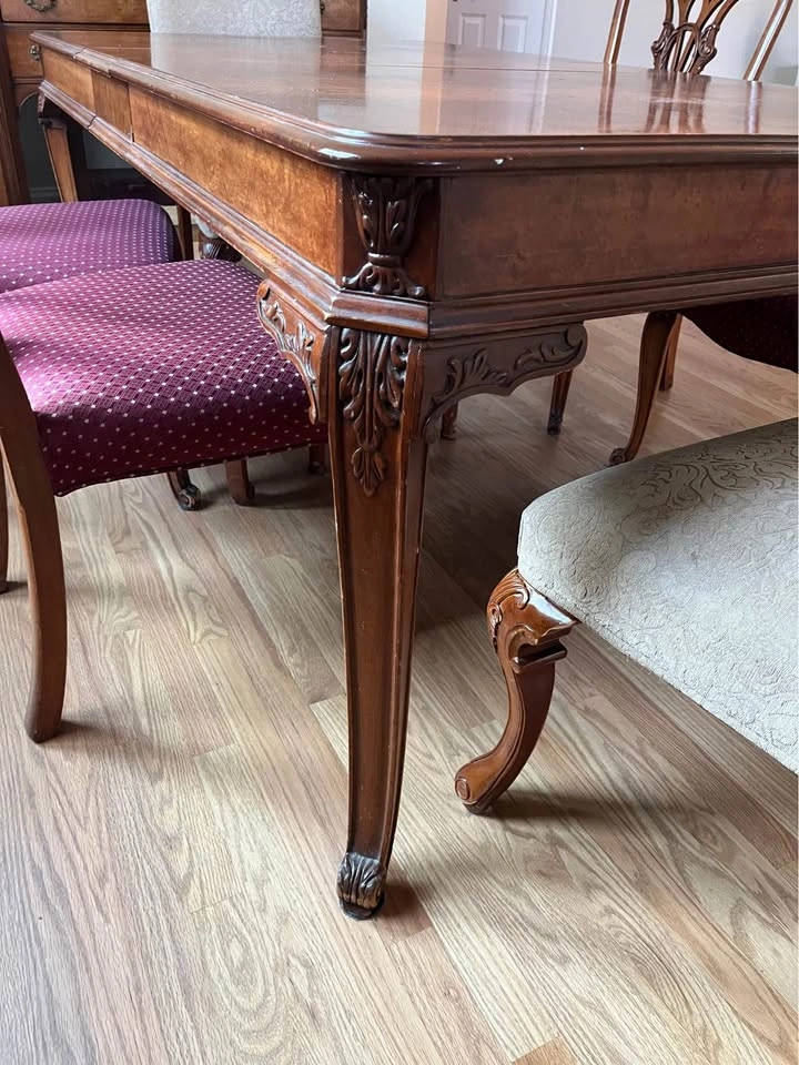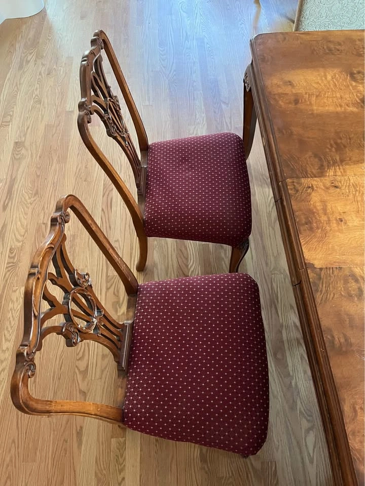 24Beautiful French Provincial antique dining room table with six chairs! Built in 1935. The table was refinished about seven years ago. Side chairs reupholstered two years ago. Head chairs are three years old. Dining table is 42” wide x 74” long x 30” high