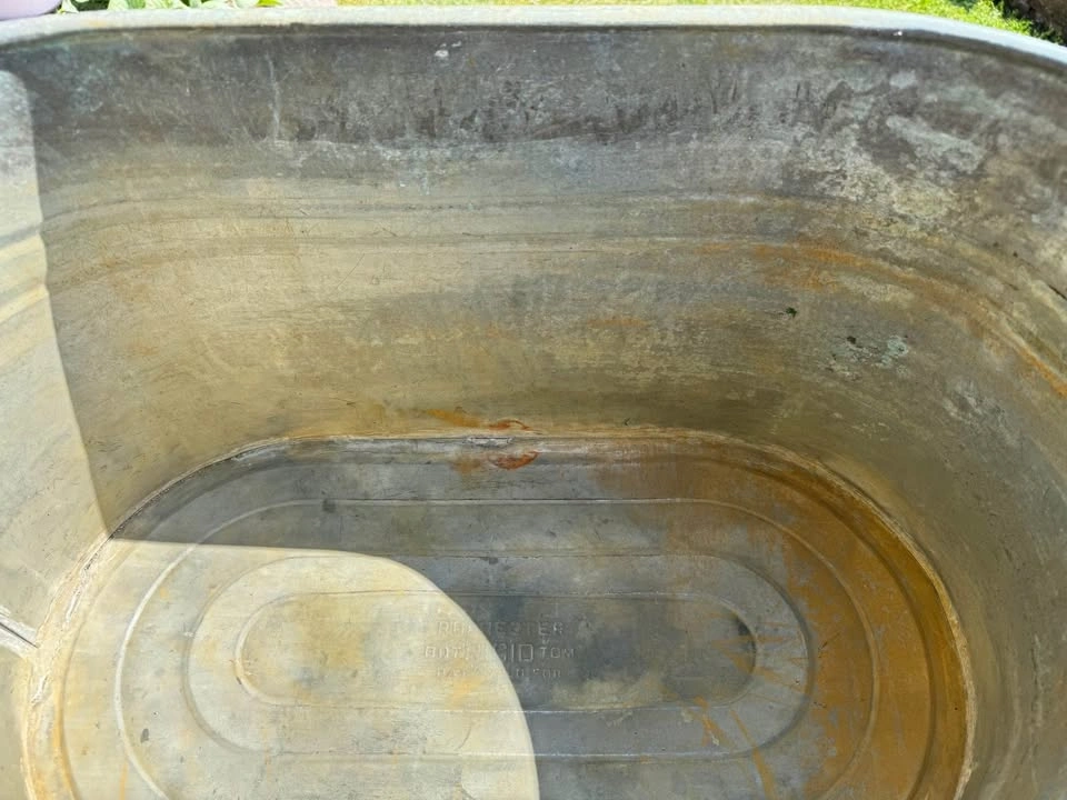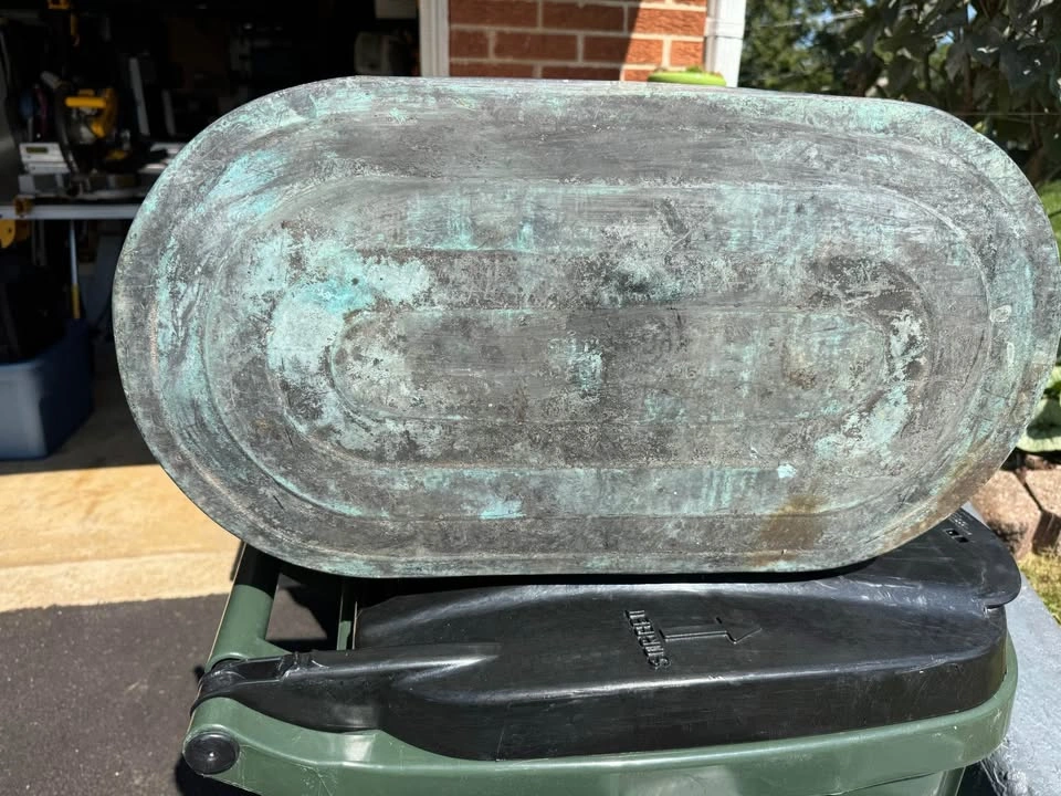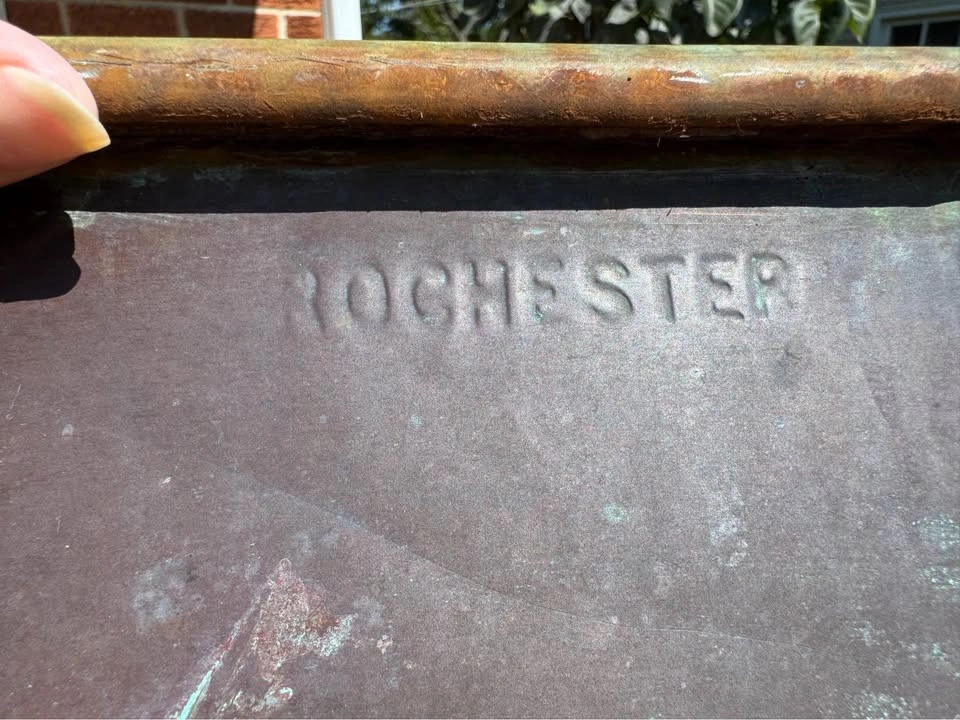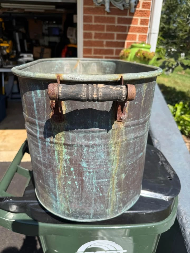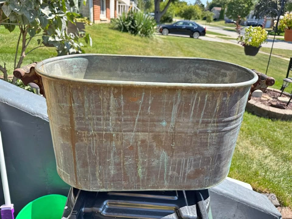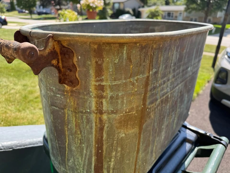 Antique hand wrought copper boiler wash tub two wooden handles.
