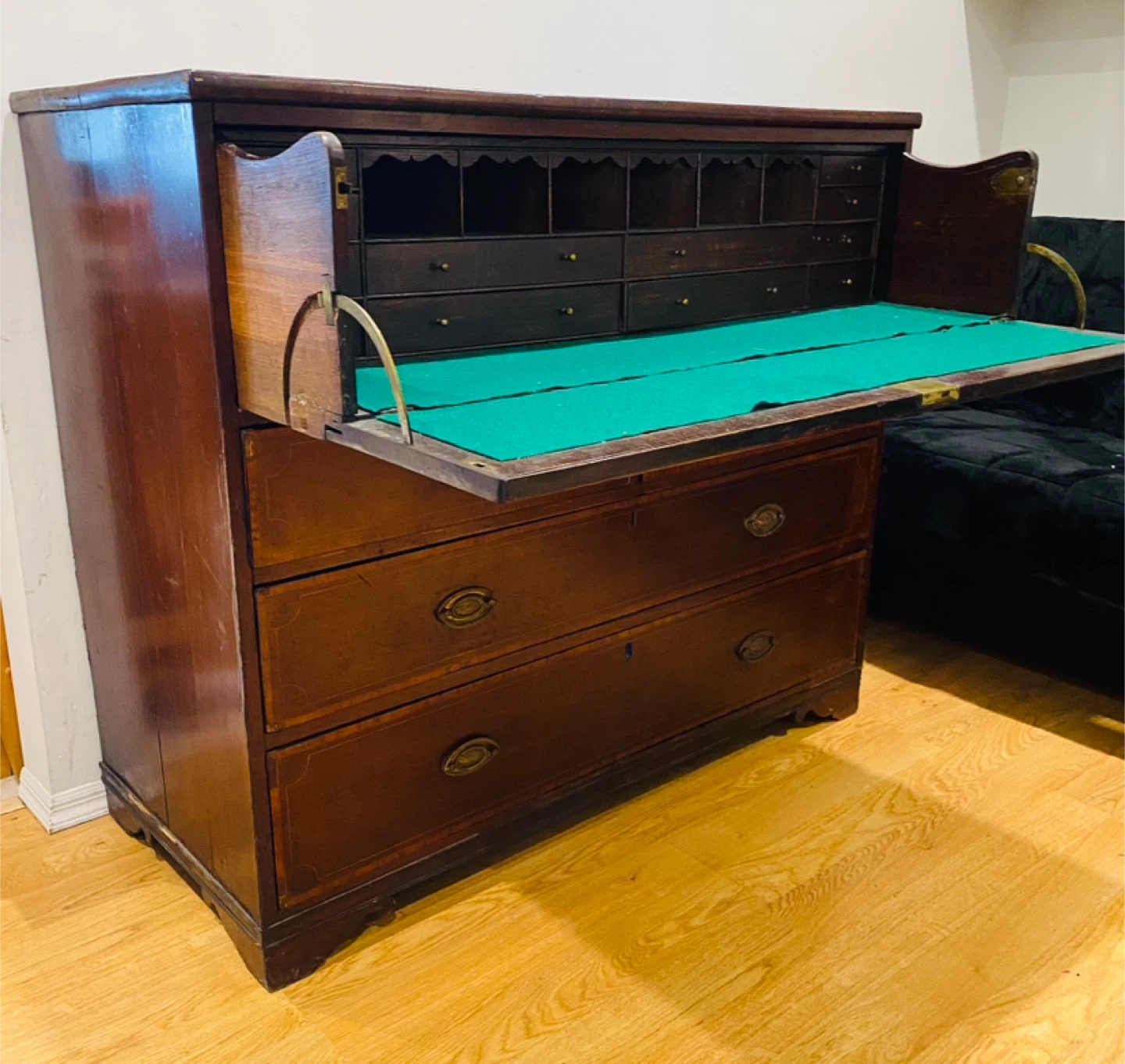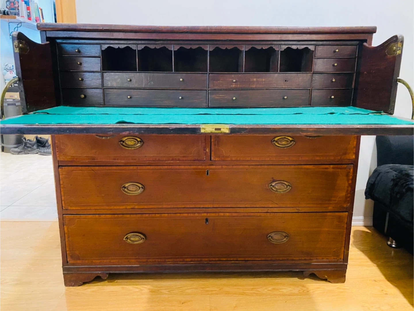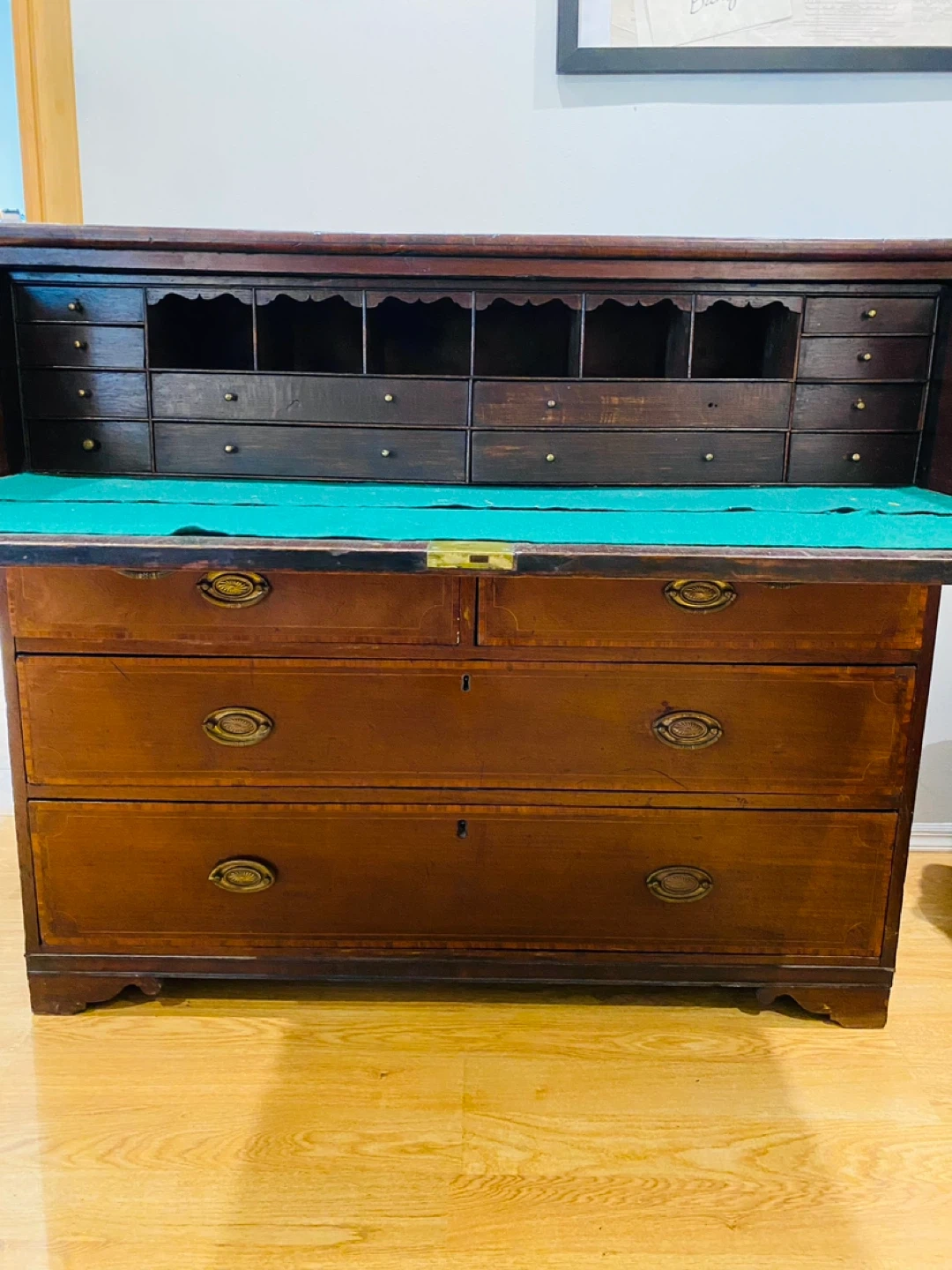10This is an antique mahogany secretary desk and dresser combo. It features a fold-out writing surface, multiple drawers, and small compartments. It shows some wear and tear consistent with its age, but it is still a beautiful and functional piece of furniture