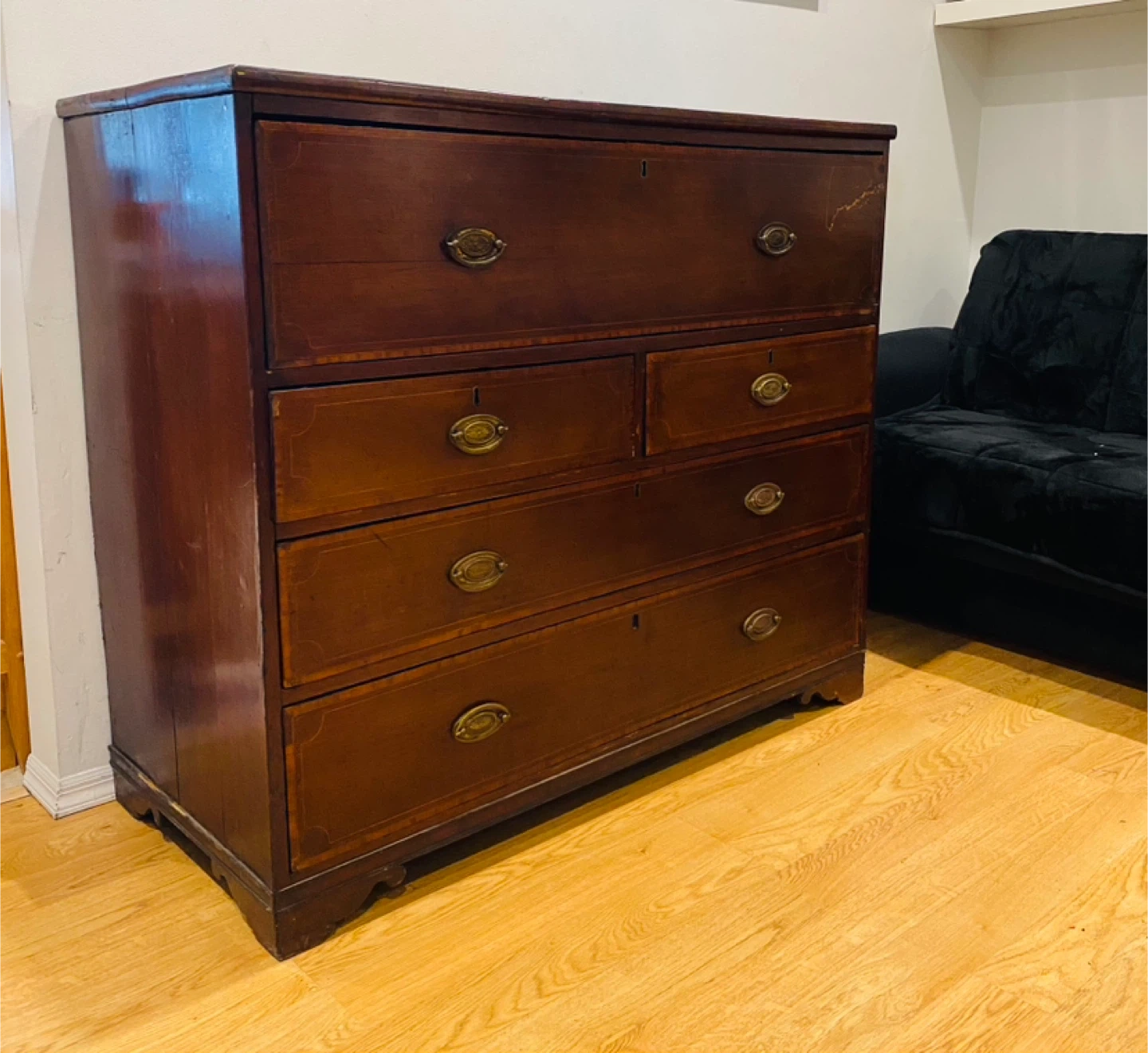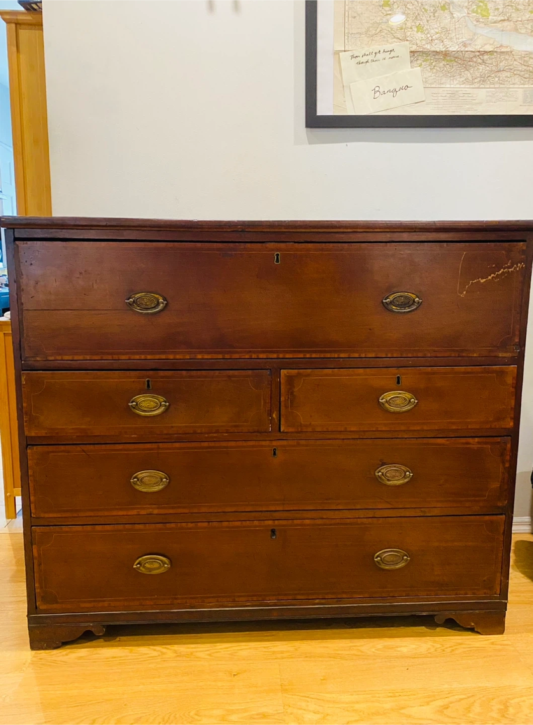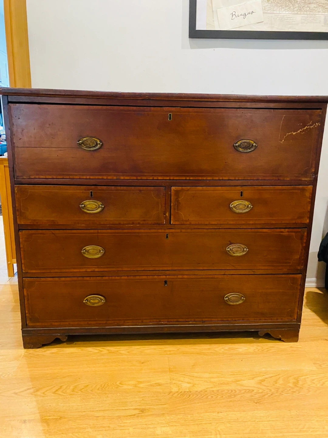 10This is an antique mahogany secretary desk and dresser combo. It features a fold-out writing surface, multiple drawers, and small compartments. It shows some wear and tear consistent with its age, but it is still a beautiful and functional piece of furniture
