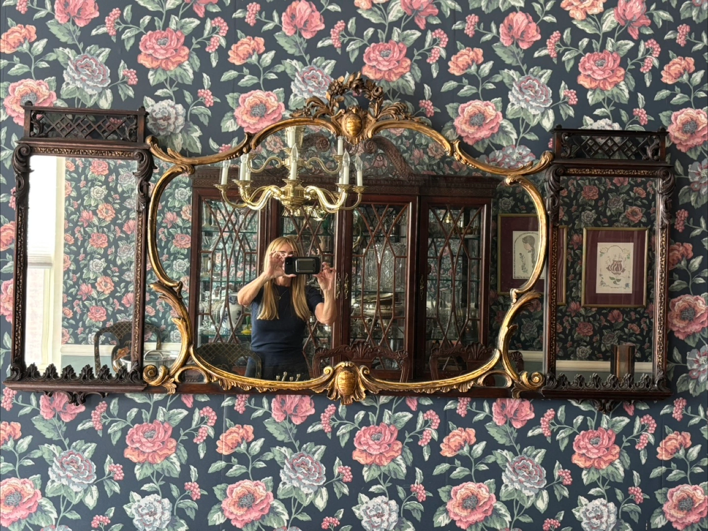 Selling a beautiful antique mirror set with ornate gold detailing! It's a stunning piece that would add a touch of elegance to any room. The set includes a large central mirror and two smaller side mirrors. Perfect for adding a vintage charm to your home!