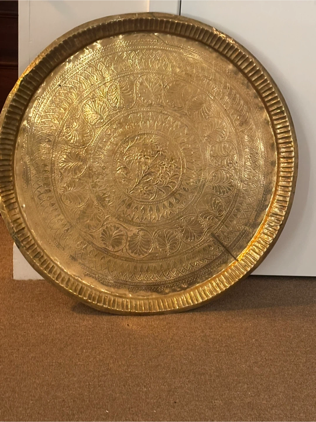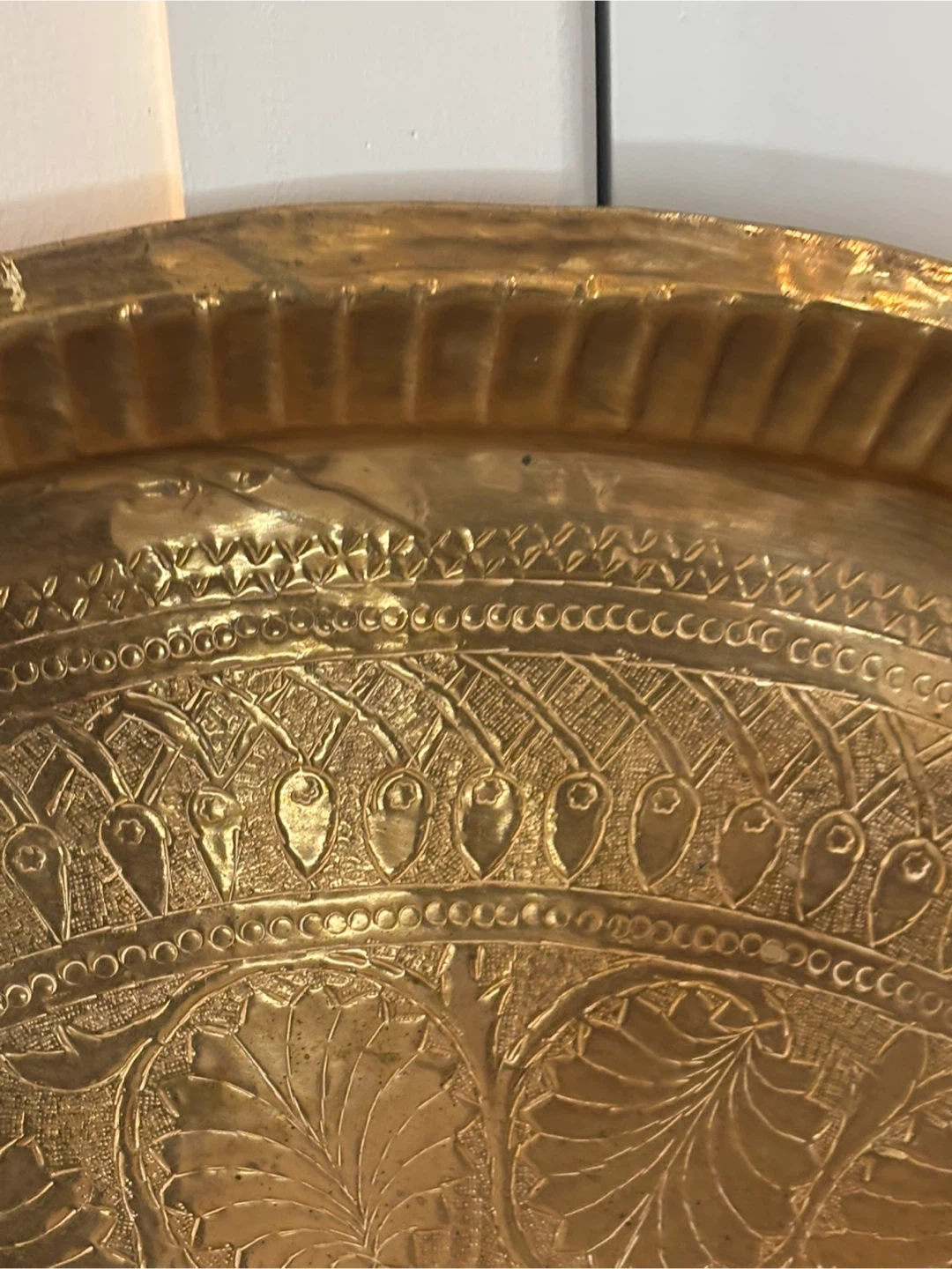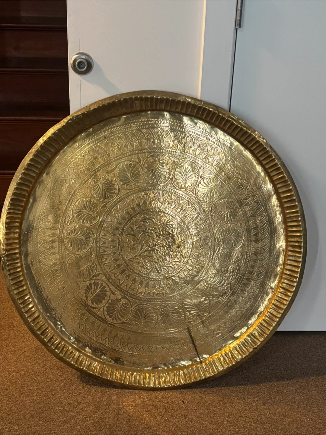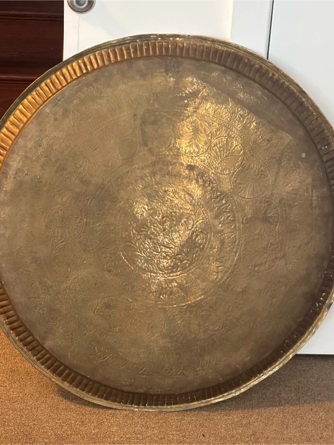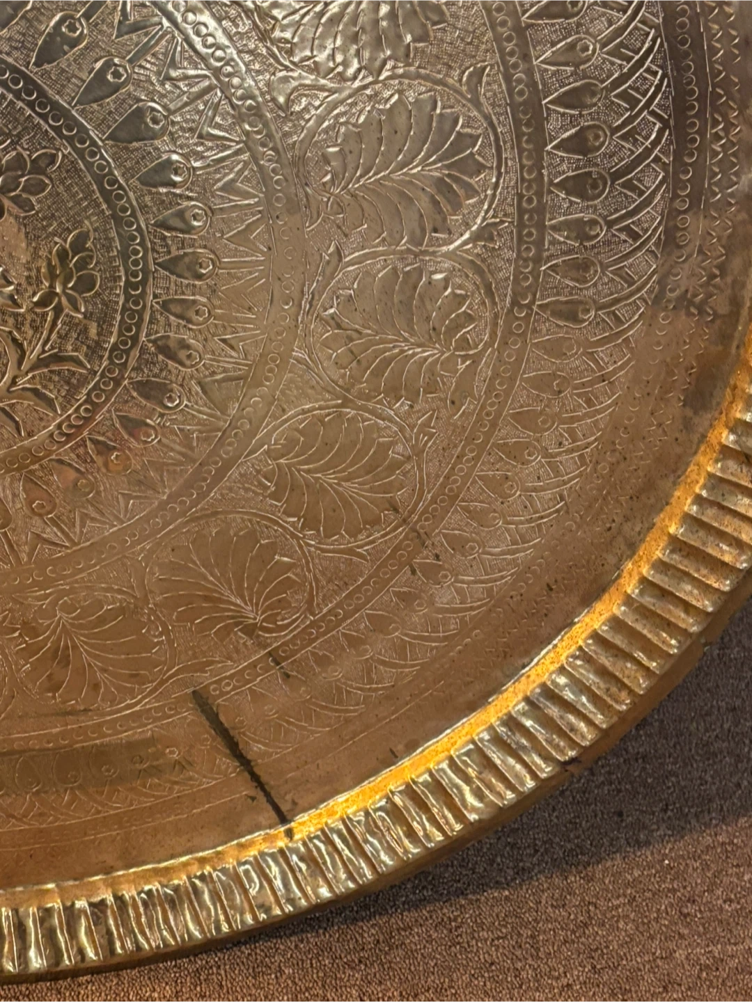 419Beautiful antique rare all brass oversized tray with intricate classic designs It's perfect for adding a touch of elegance to any room Diameter 36.5 inches approximately