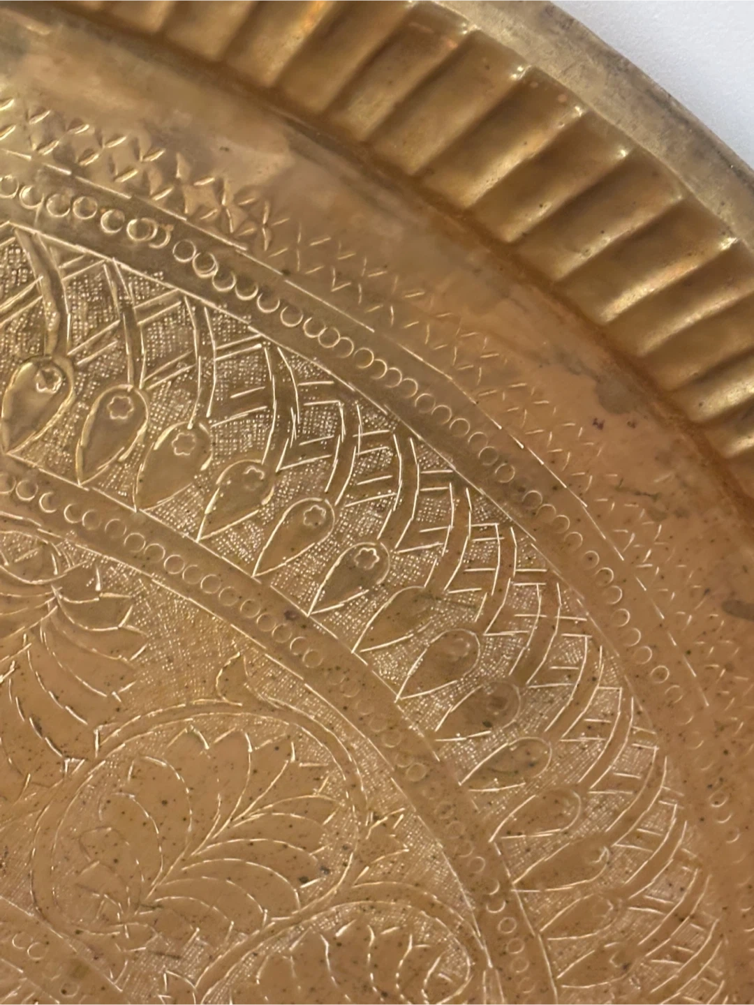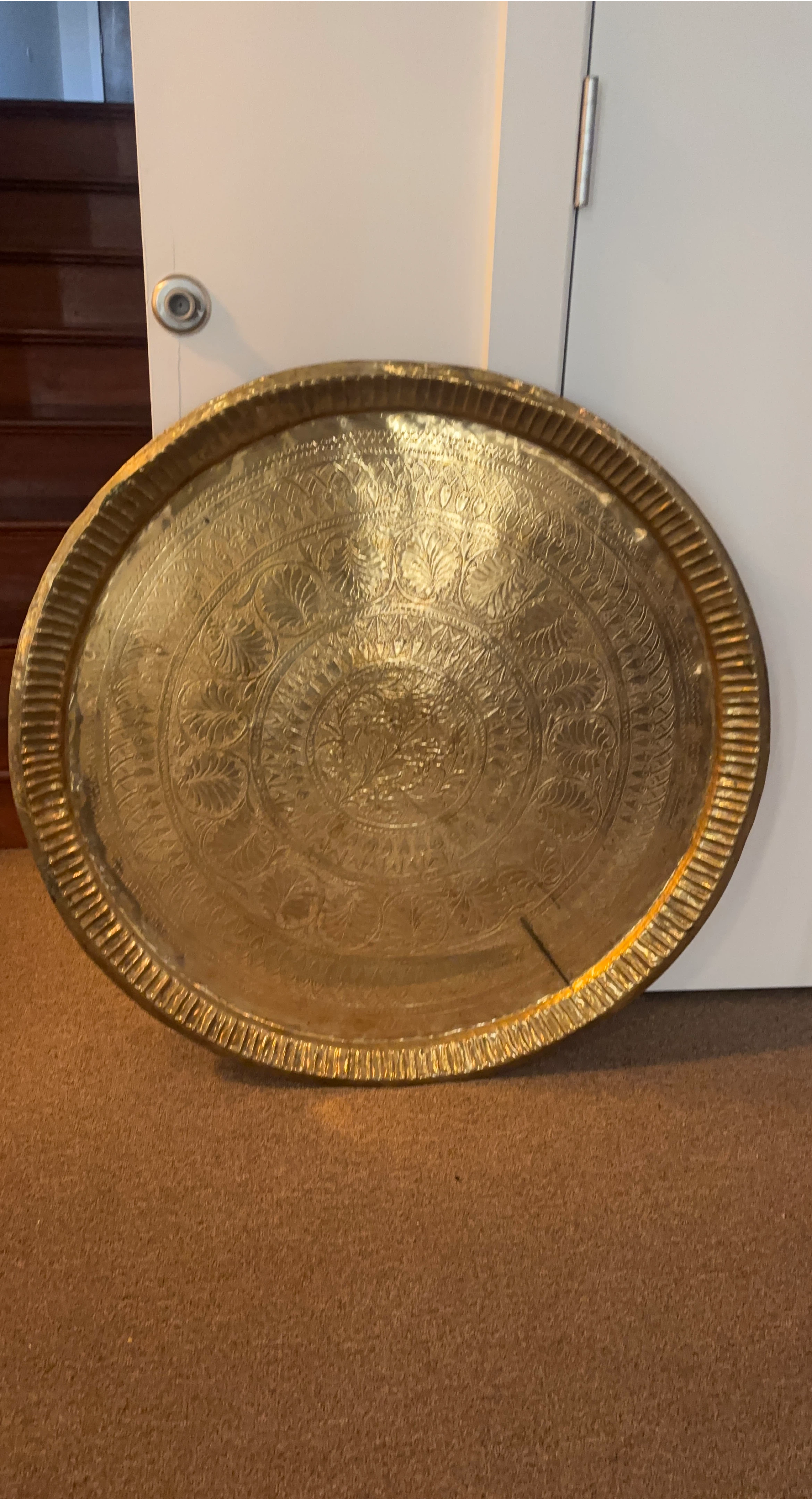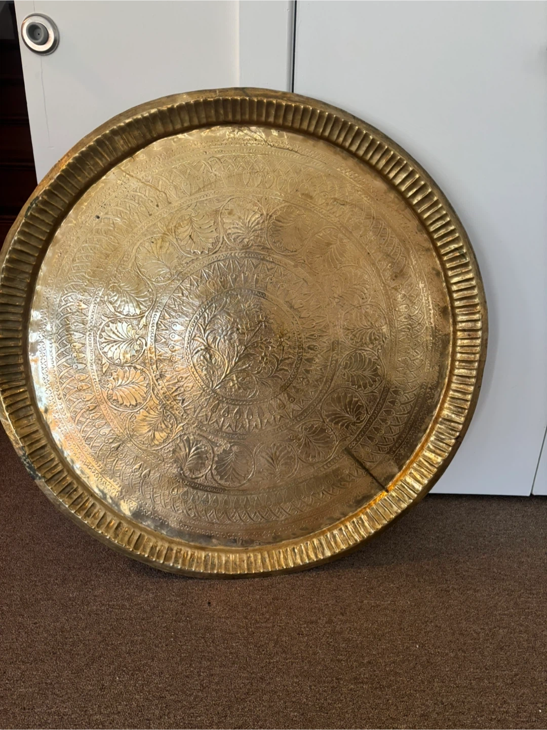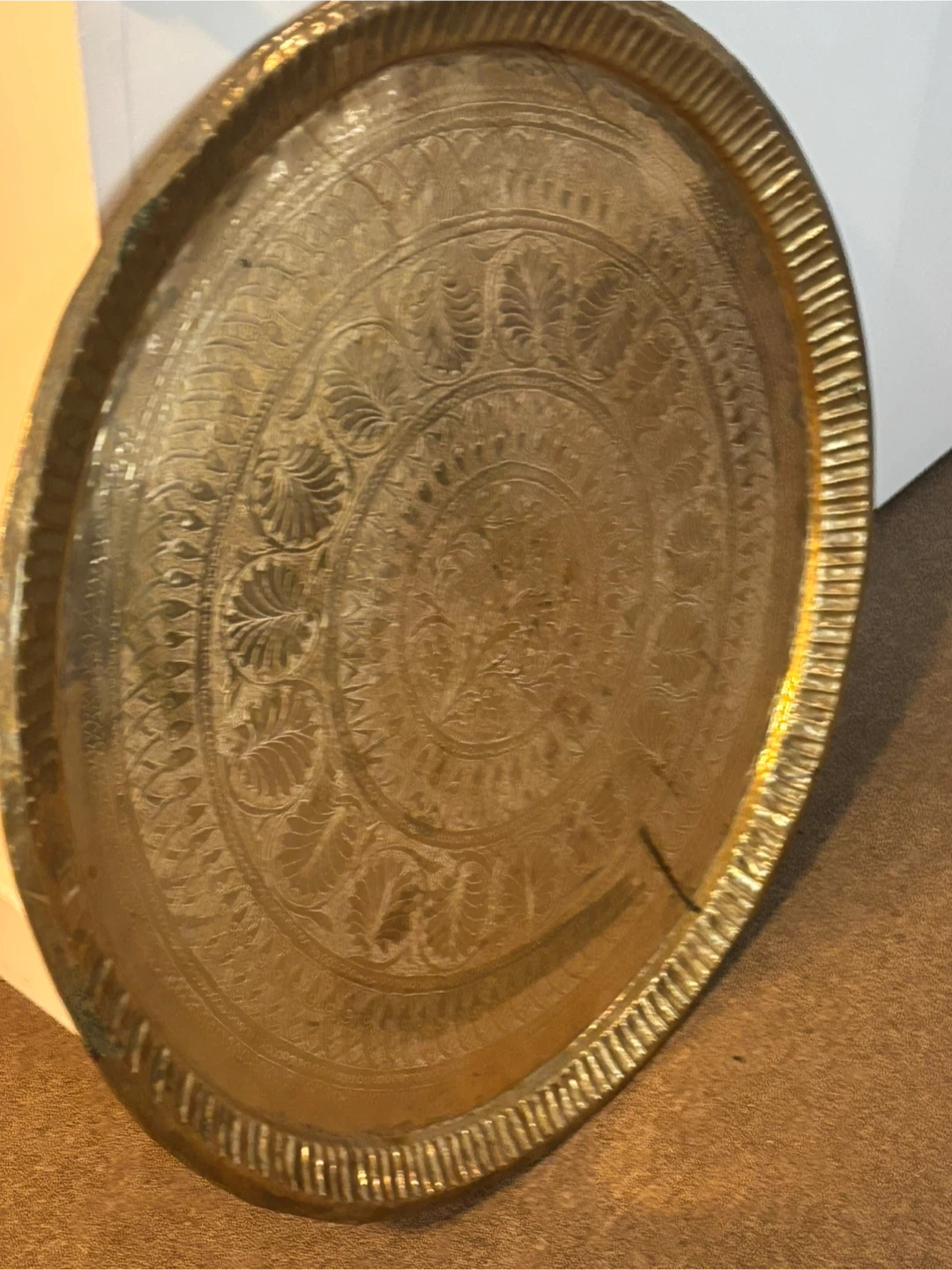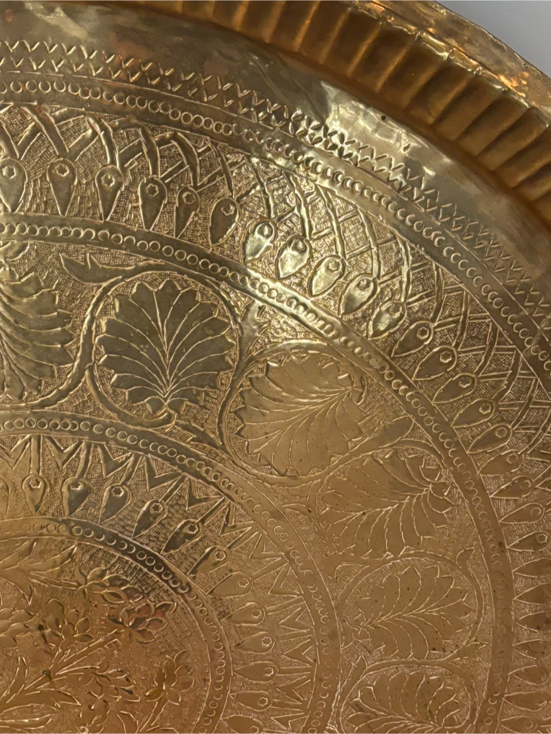 419Beautiful antique rare all brass oversized tray with intricate classic designs It's perfect for adding a touch of elegance to any room Diameter 36.5 inches approximately