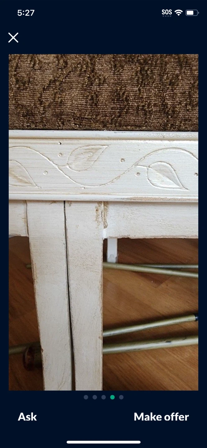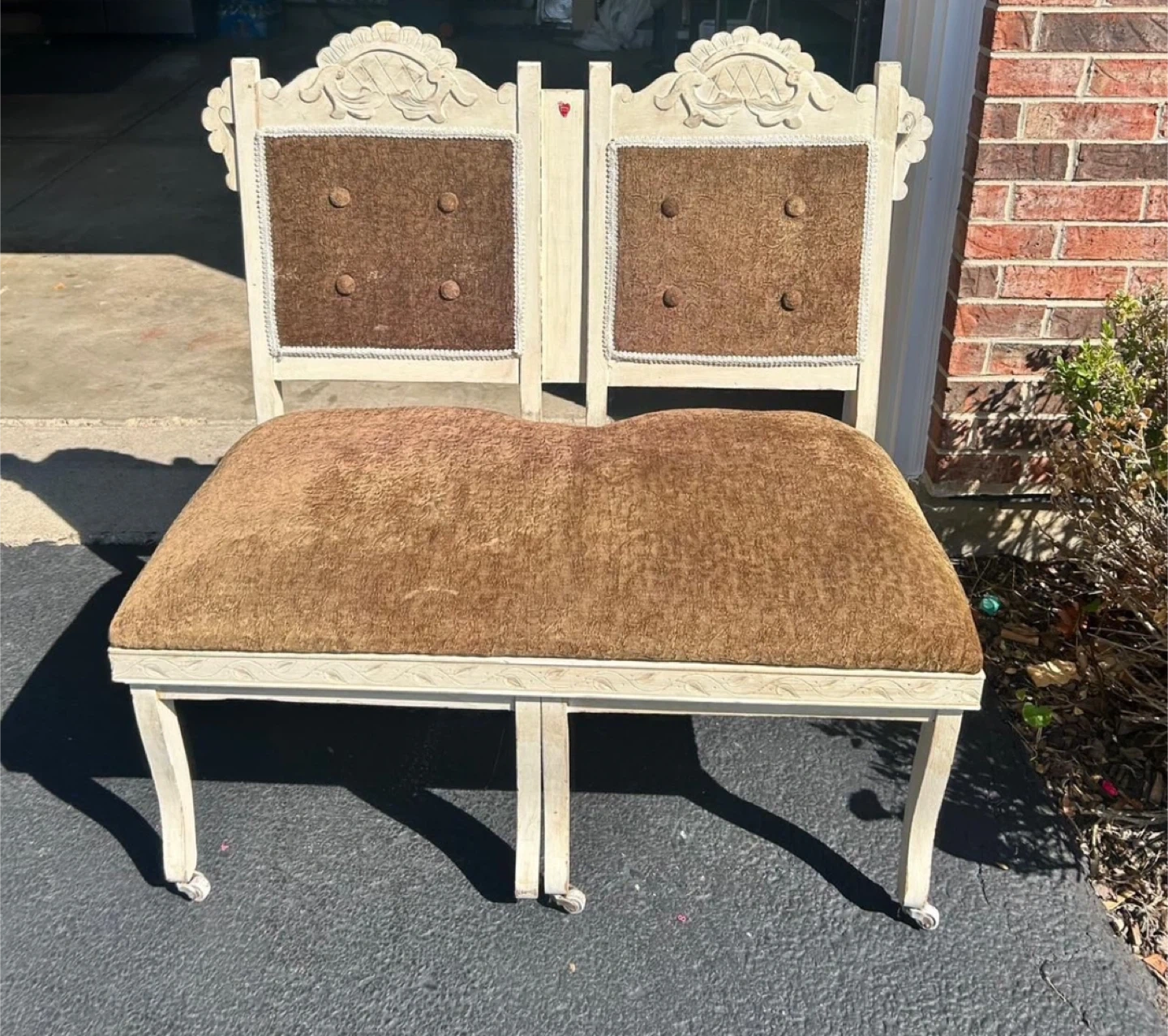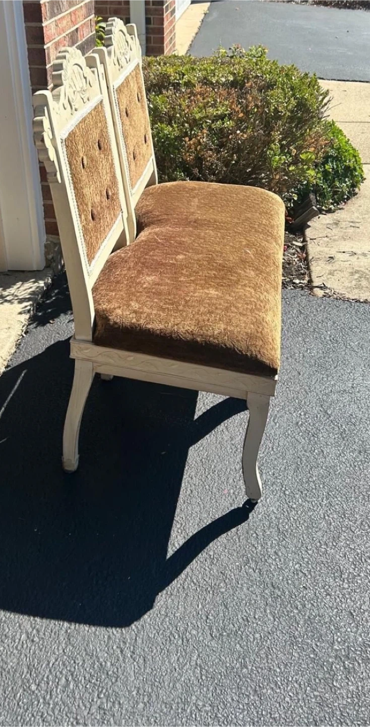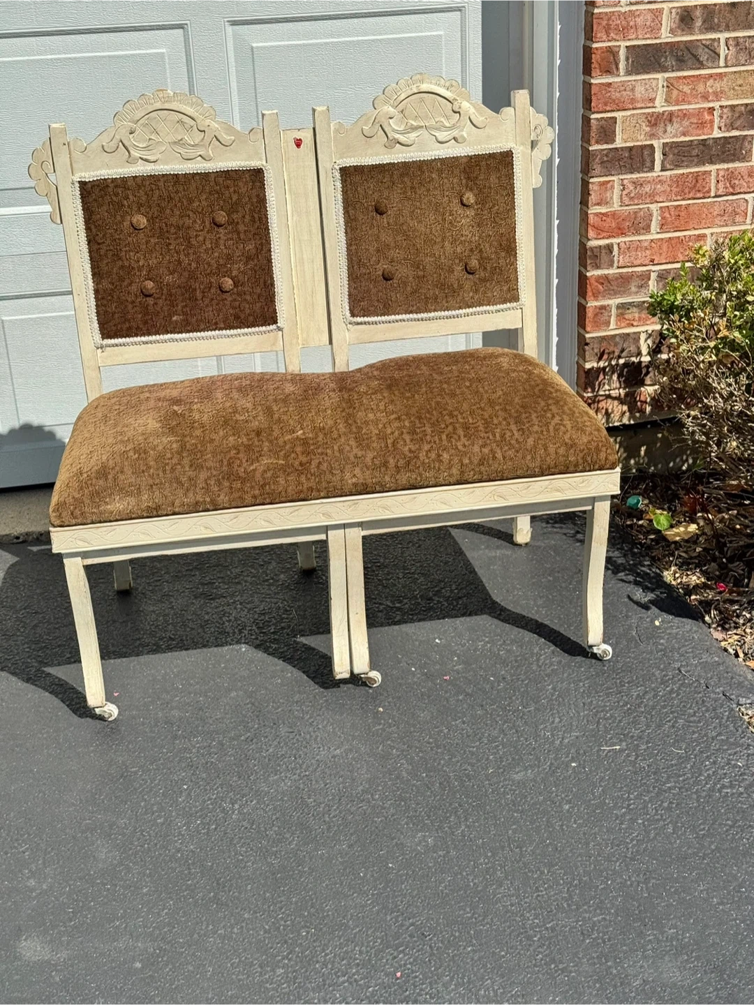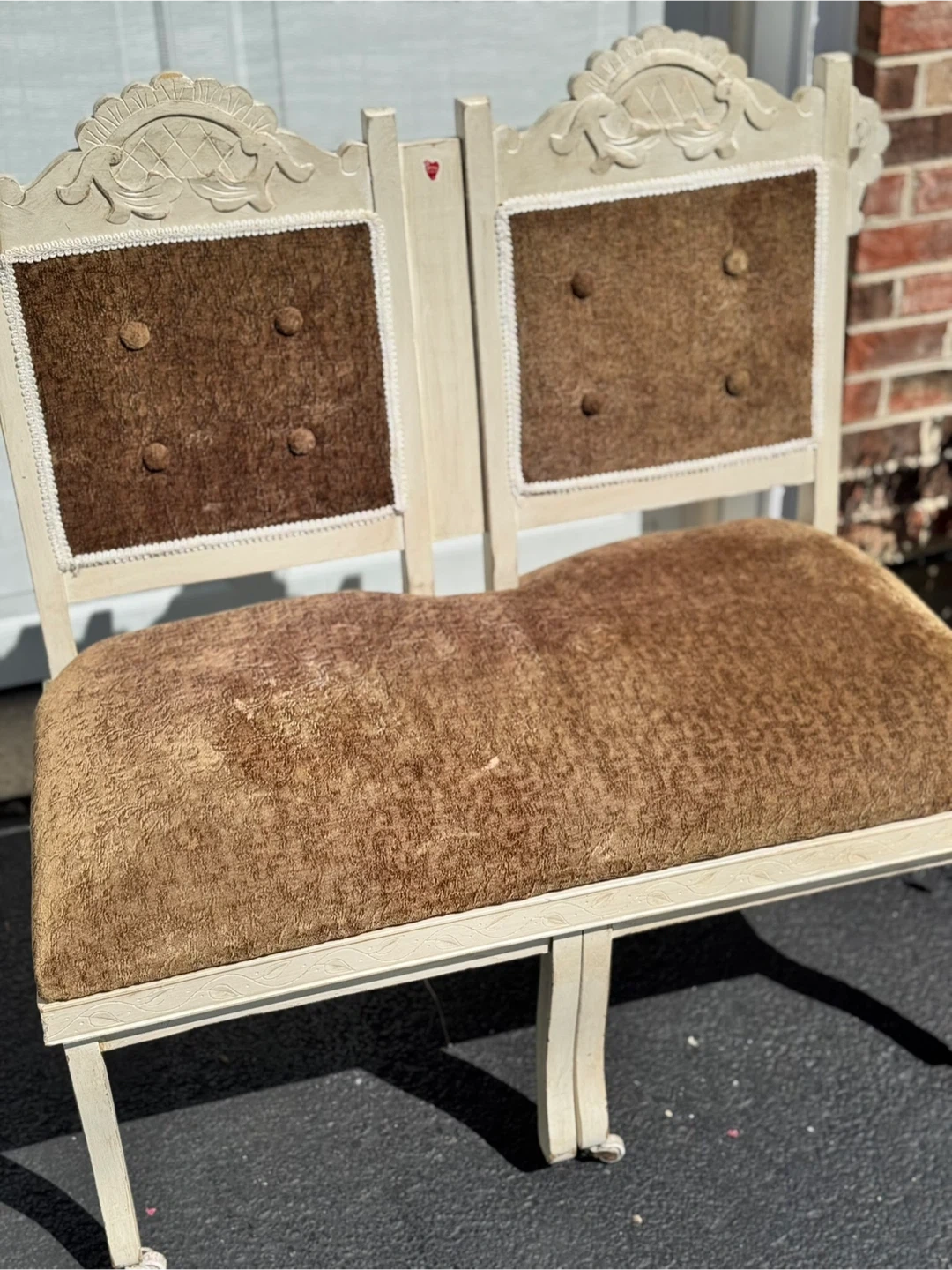 If you are reading this listing item is available. Item will be removed once item is Sold.Message me when you’re ready to arrange pickup. Selling a unique bench with an antique style! It features a brown cushioned seat and a decorative white frame. Perfect as an accent piece for any room! Tags postmodern mcm mod modern minimalist chiclet chair parsons chair milo baughman thayer coggin memphis chair print chairs arm chairs club chairs lounge chairs vintage retro chairs vintage furniture vintage sofa vintage couches loveseat couch moving sale vintage table antique furniture Antique table Antique chairs vintage lamps sofa table cocktail table coffee table curved sofa curved loveseat curved couches paisley chairs paisley print sofa paisley couch comfy sofa chase lounge ottoman barstools round dining table dining chairs dining table solid wood furniture Chase lounge sofa Ottomon Vintage,Solid Wood,Mitchell Gold Bob Williams, MG+BW, Crate & Barrel, West Elm, DWRm Design Within Reach, Pottery Barn, RH, Restoration Hardware, CB2, Modern, Contemporary, Industrial, Z Gallerie, Arhaus, Pier 1, Walter E. Smithe, Overstock, Wayfair, Anthropologie, Loft, Howell Chairs, howell chair, Howell kitchen chairs, Howell dining chair, black vinyl, wood chairs, Metal chairs,Vintage 1975 Barrel Leather Chairs, Walter E. Smiths, Nathan James, KLER, CANVAS PRINTS OF ROME ITALY-THE COLISEUM, THE TREVI FOUNTAIN, Glass Dining Table, Black Leather Dining Chairs, writer’s Desk, Scandinavian Wood Desk, Contemporary Desk,Baby rocking chair, lounger chair, lounging chairs, slipper chairs, Lazy Boy Chair, Lazyboy ,Recliner Chair, Reclining Chair, Antique Bench, Nursery furniture, microseal protector, Furniture.