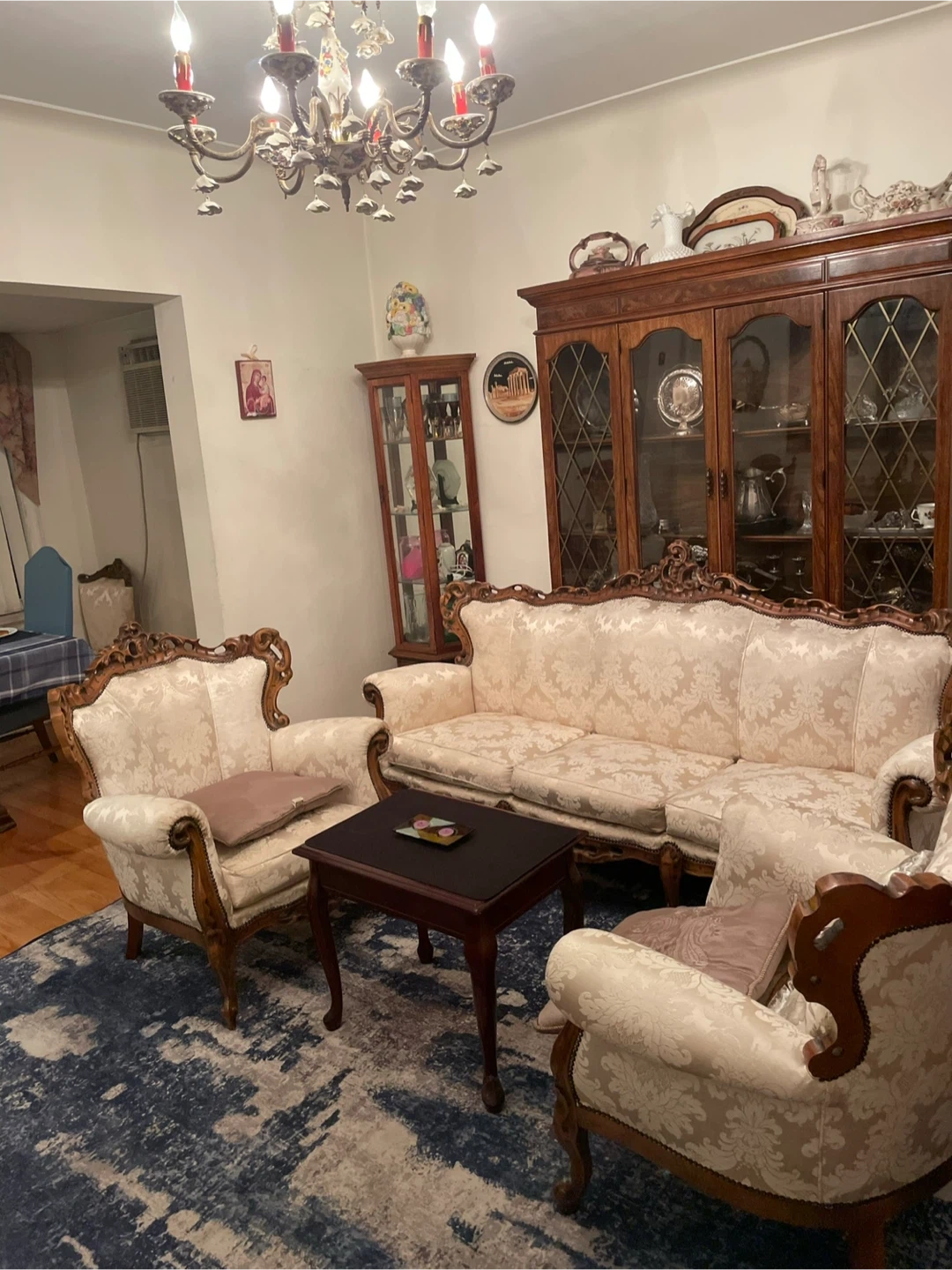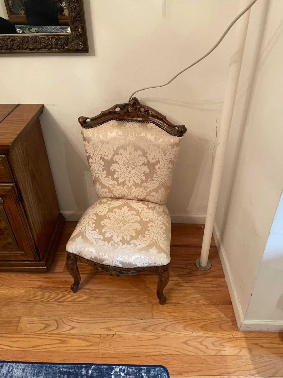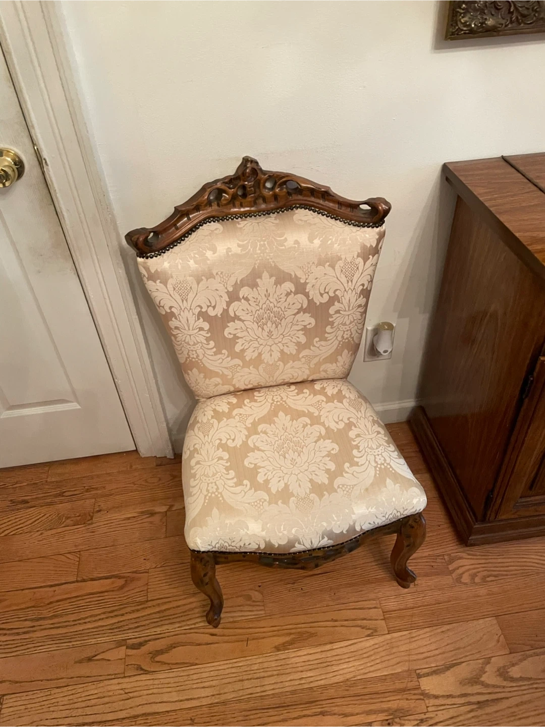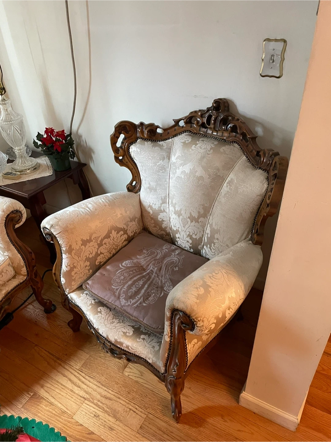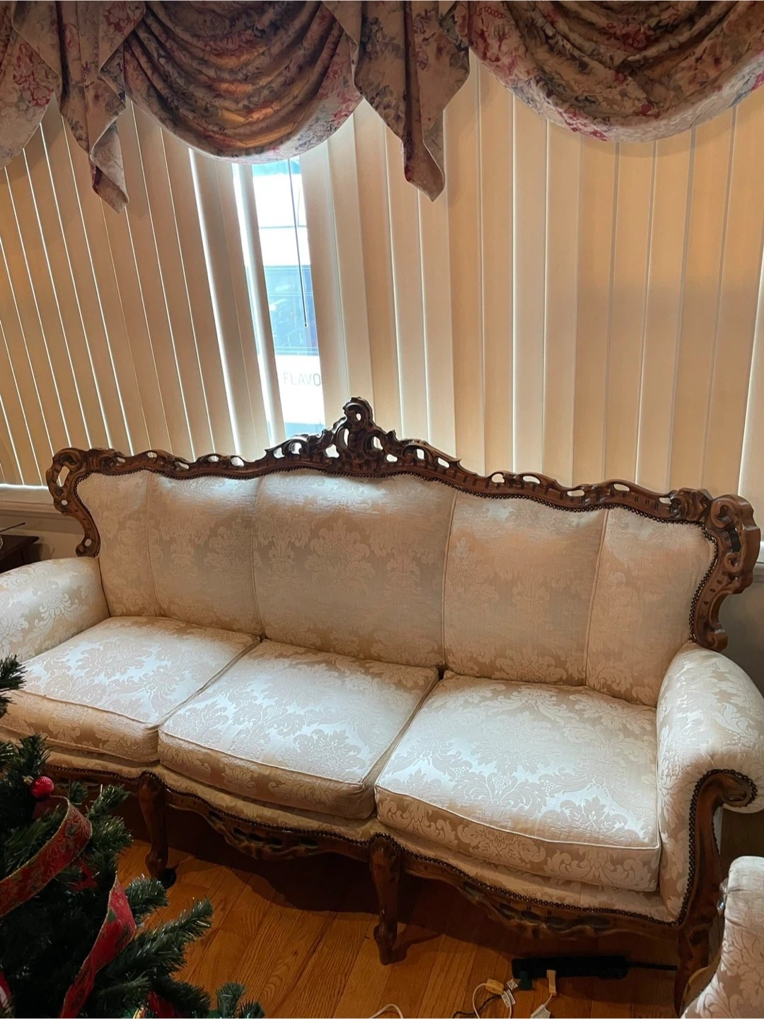 Elegant antique-style furniture set featuring a floral upholstered sofa and chair. The intricate wood detailing adds a touch of classic charm to any room. Perfect for adding a vintage vibe to your living space! Pick up only